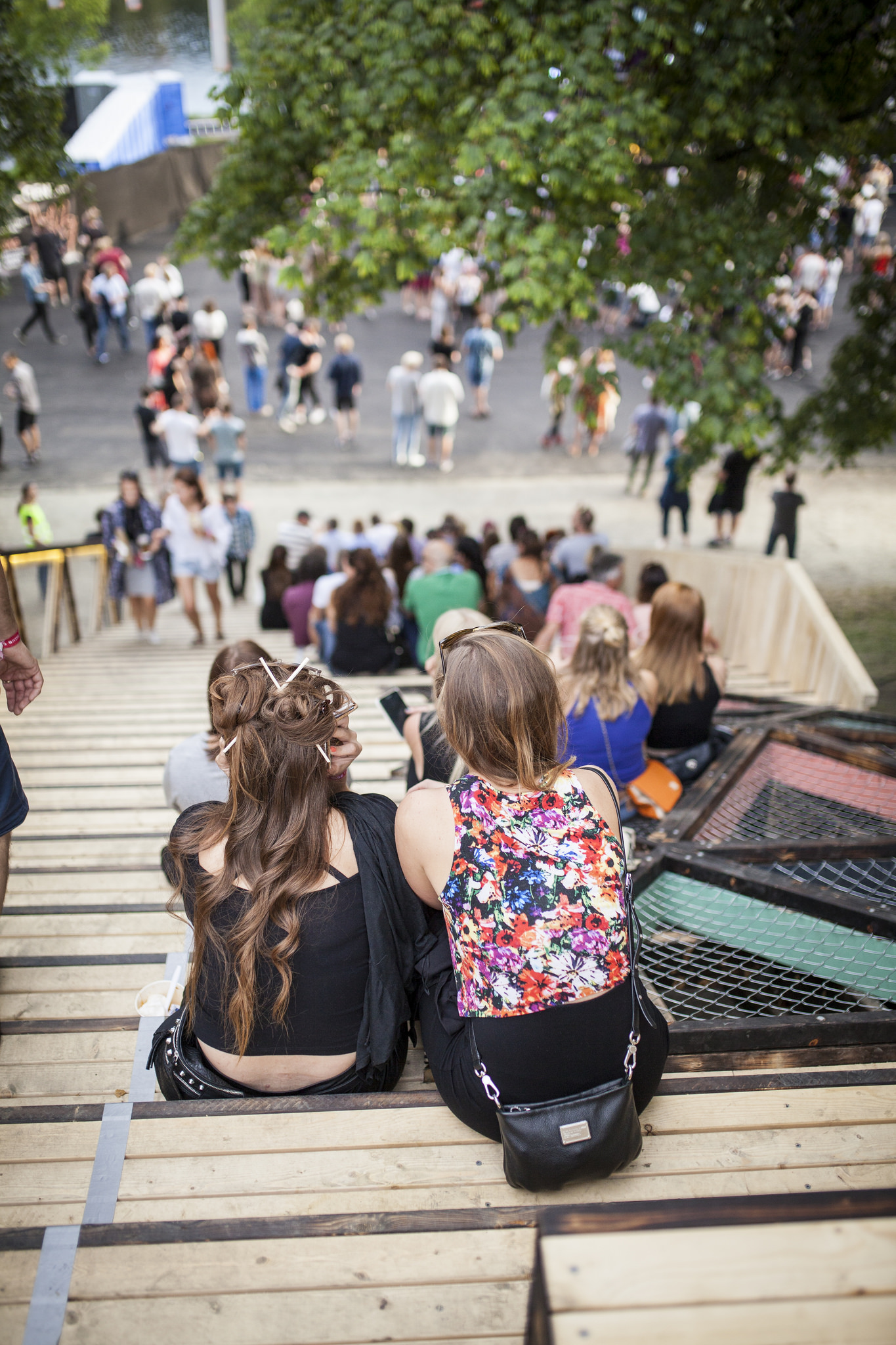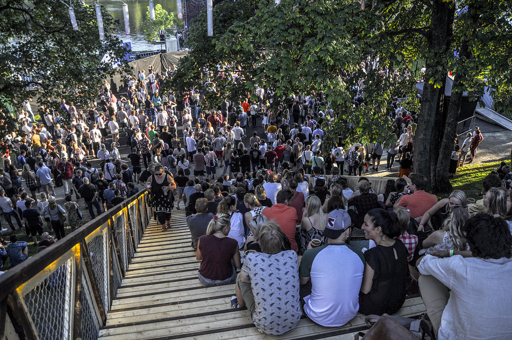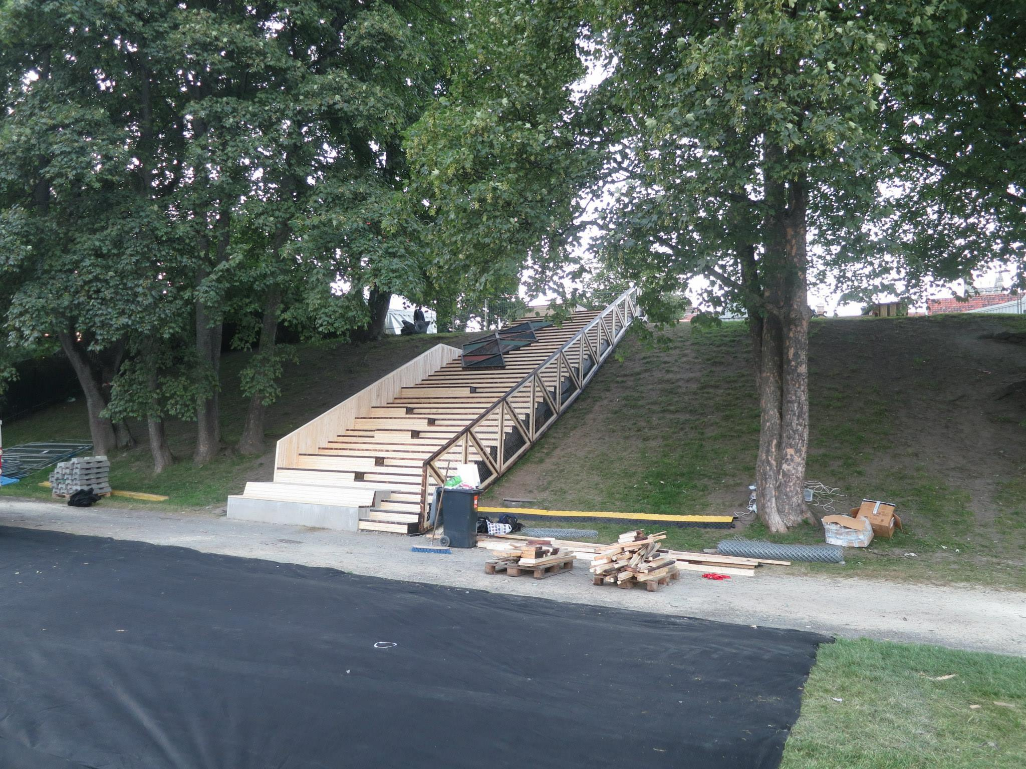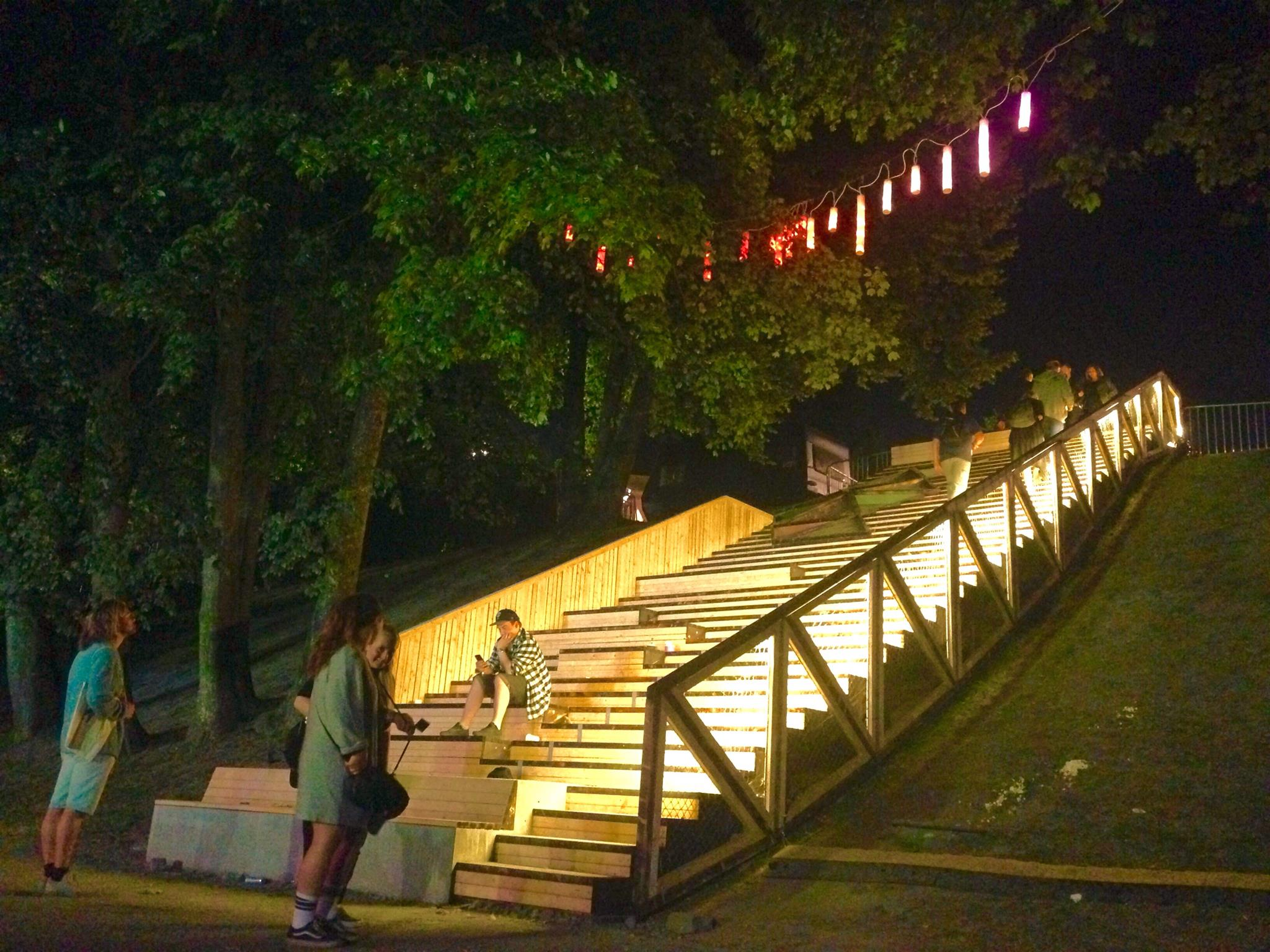 In connection to the yearly music event «Pstereofestivalen» , a group of students have been collaborating with the festival and a city development program called «En blå tråd». The collaboration have resulted in designing and building an outdoor stair and seating area in on of the slopes in the public park Marinen in the city centre. The structure connects the lower level of the park with the upper level, to support the circulation of thousands of people during the festival.