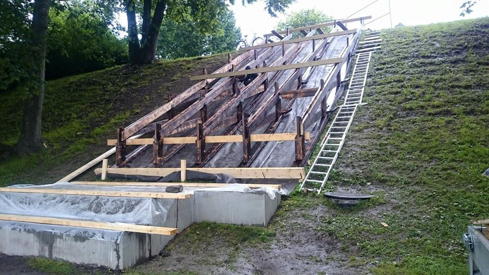 Marinen in Trondheim is part of the middle age city, closely connected to the cathedral. The grounds and the ancient city walls are therefore protected, making the site quite a challenge to build on. The whole structure is floating above ground, only fixed to a large concrete foundation in the bottom of the slope, to hold all the weight back. The wooded structure carrying the steps allocated the forces on multiple points spread out on the slope, instead of having fixed foundations. Due to the conditions, the collaboration between the students and the connected actors have been crucial for this project to become a reality.