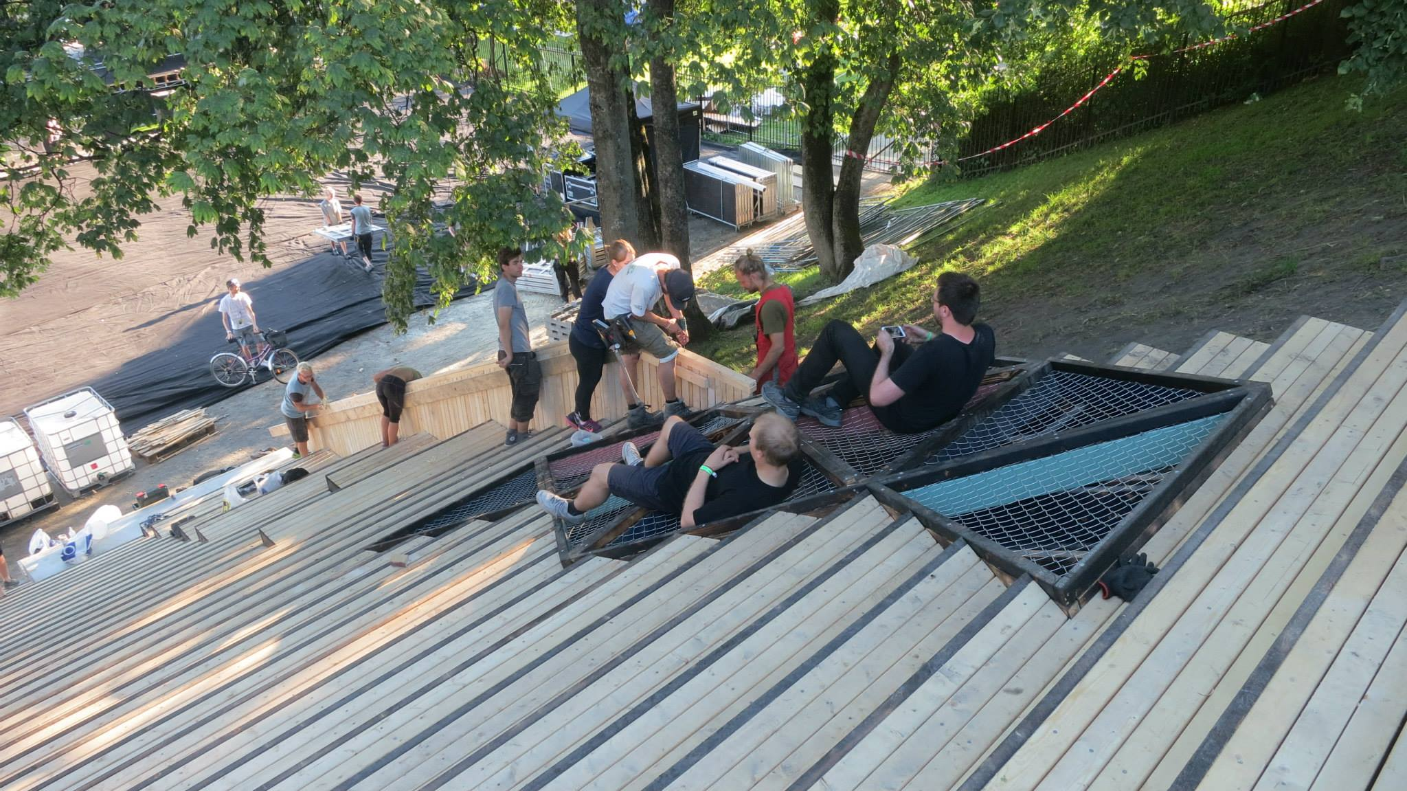 In connection to the yearly music event «Pstereofestivalen» , a group of students have been collaborating with the festival and a city development program called «En blå tråd». The collaboration have resulted in designing and building an outdoor stair and seating area in on of the slopes in the public park Marinen in the city centre. The structure connects the lower level of the park with the upper level, to support the circulation of thousands of people during the festival.