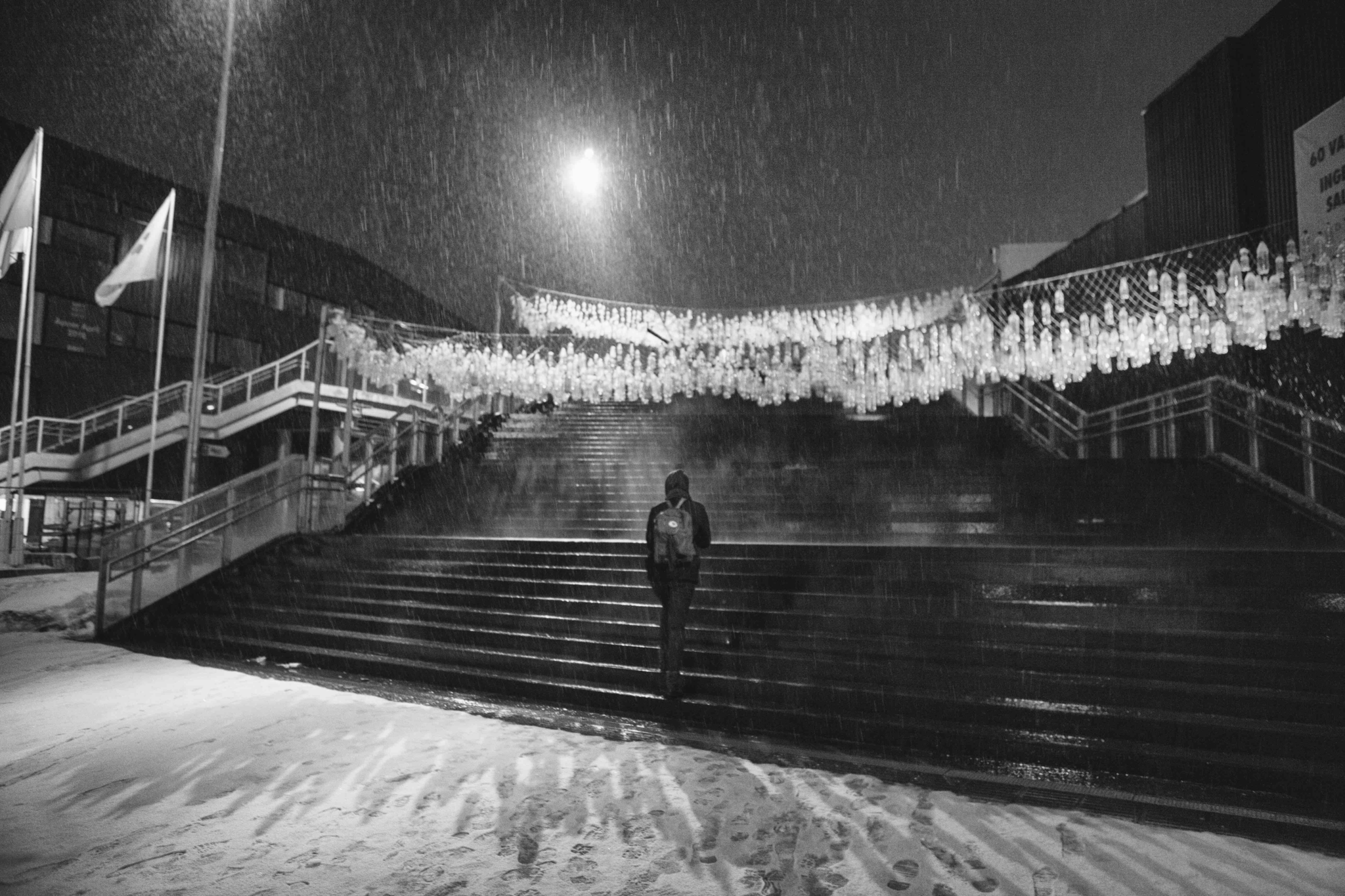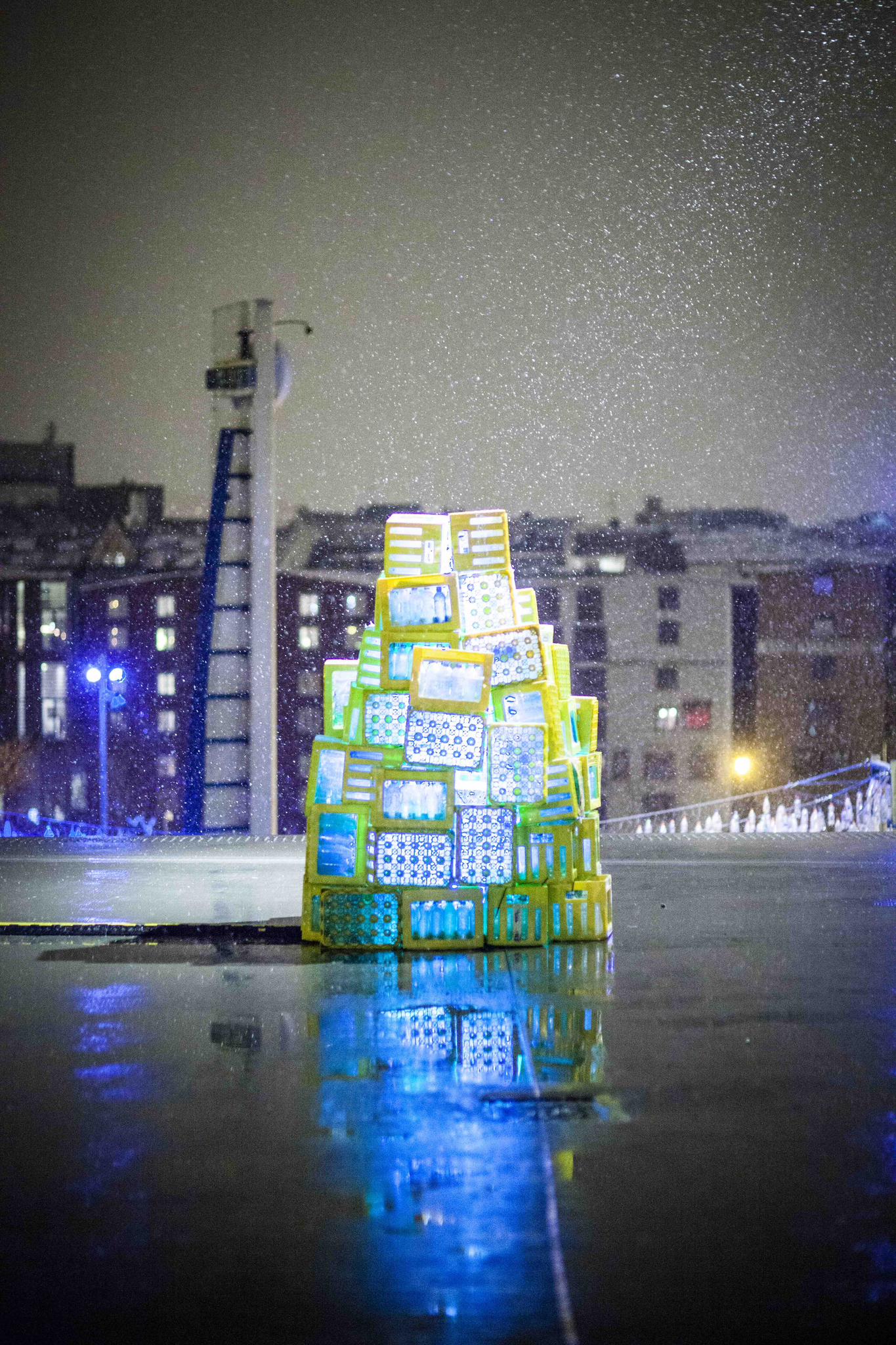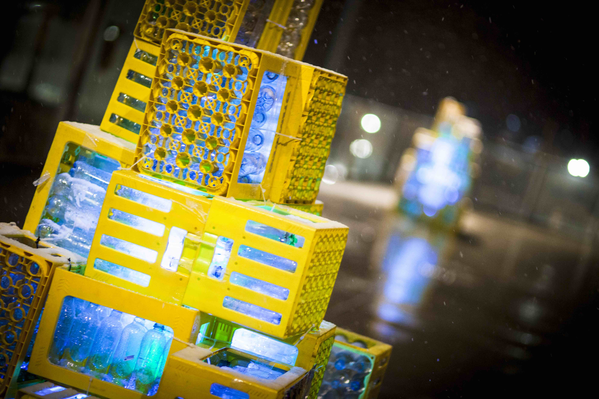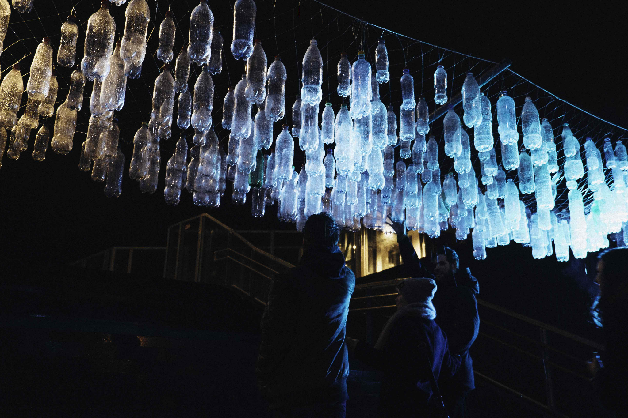 Since the project was temporary the students decided to buy as little as possible, and instead make us of reusable and recycled objects combined with lighting. From this a concept with plastic bottles and bottle storage boxes was made. The organization Infinitum lended 12.000 bottles to the students, which after the project was returned and recycled. Also, 300 storage boxes was lent from Ringnes. This was then used to design an installation which enlightened the pathway and thus guided the festival members from ‘Solsiden’ to ‘Brattøra’ during the festival.