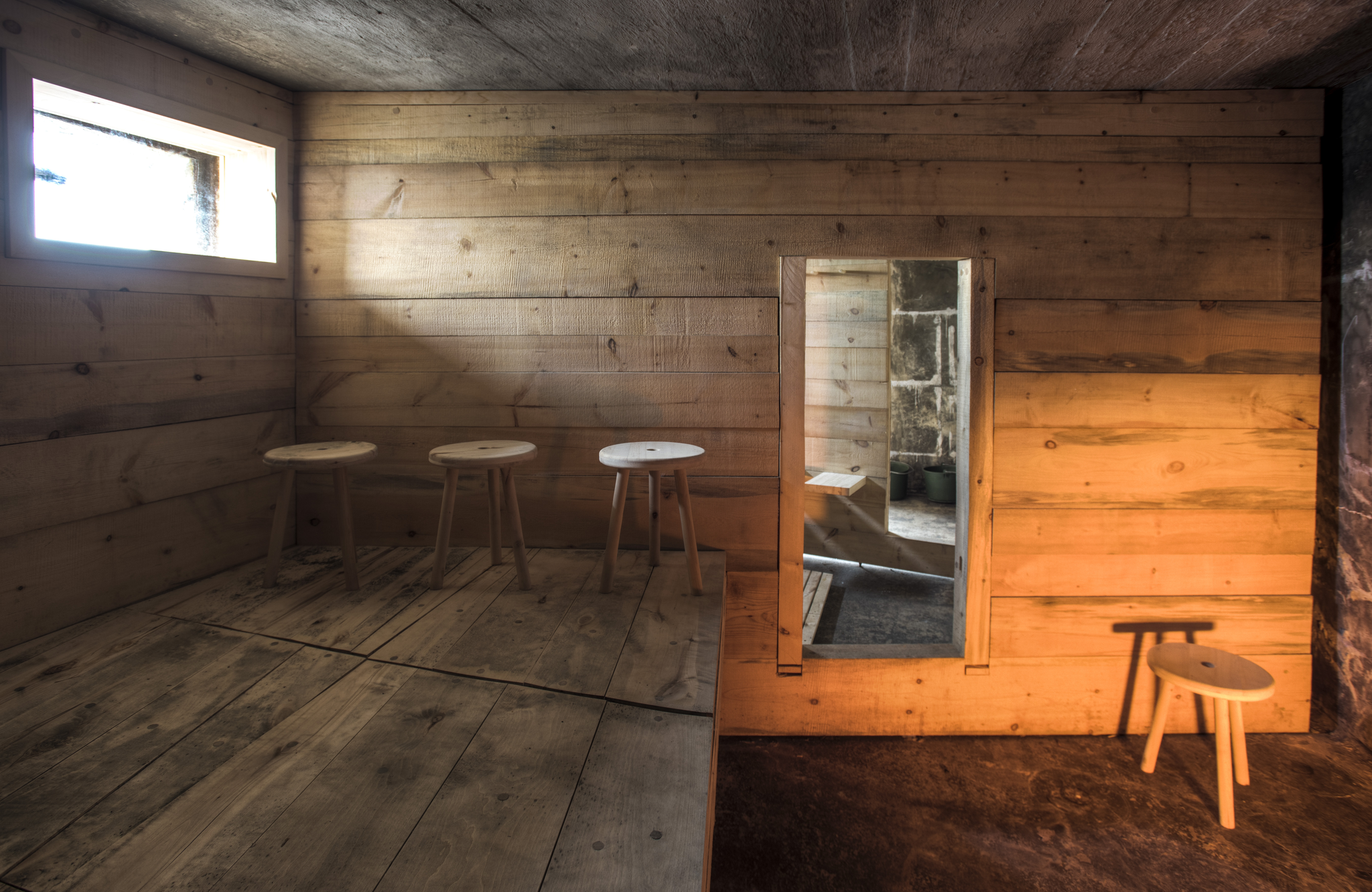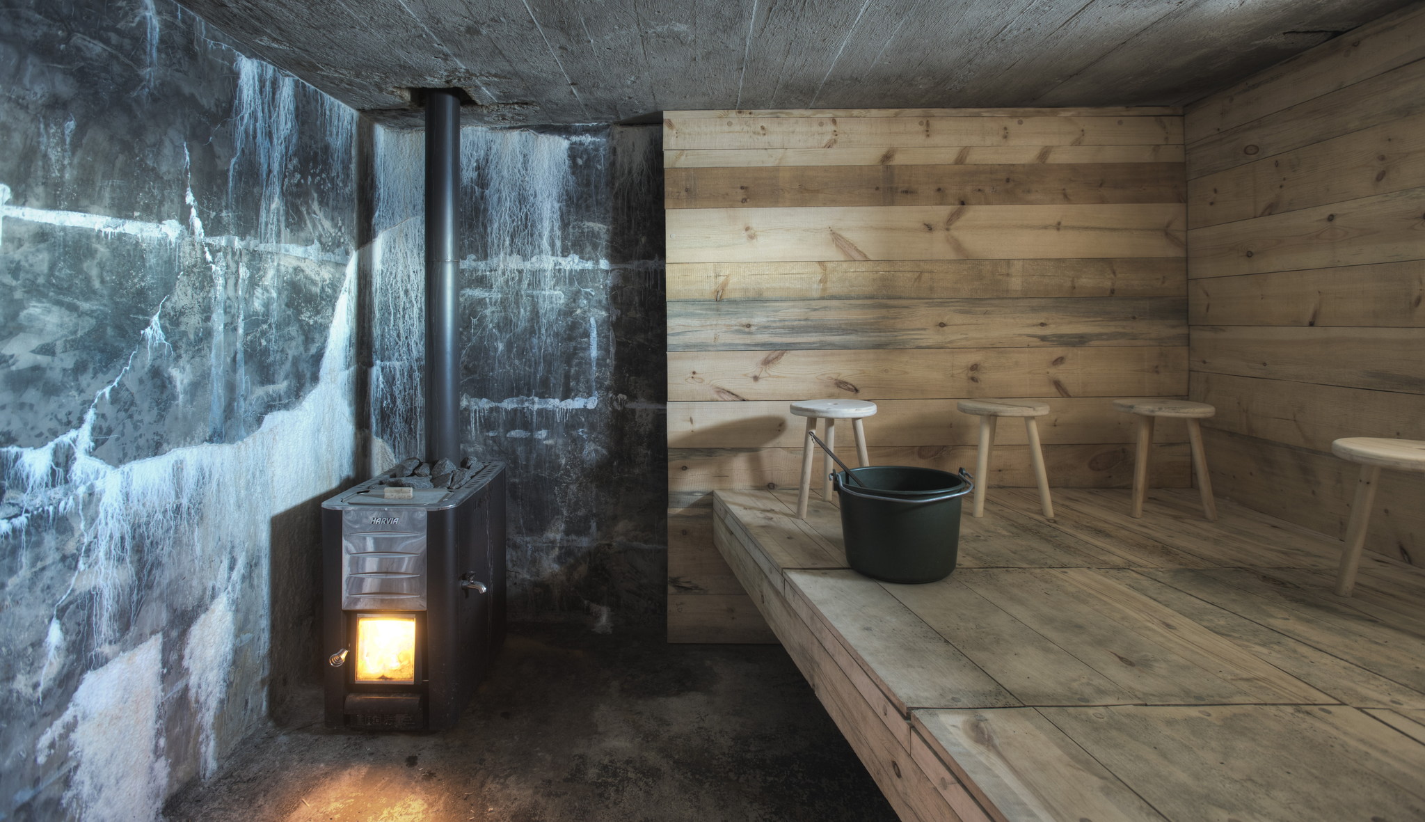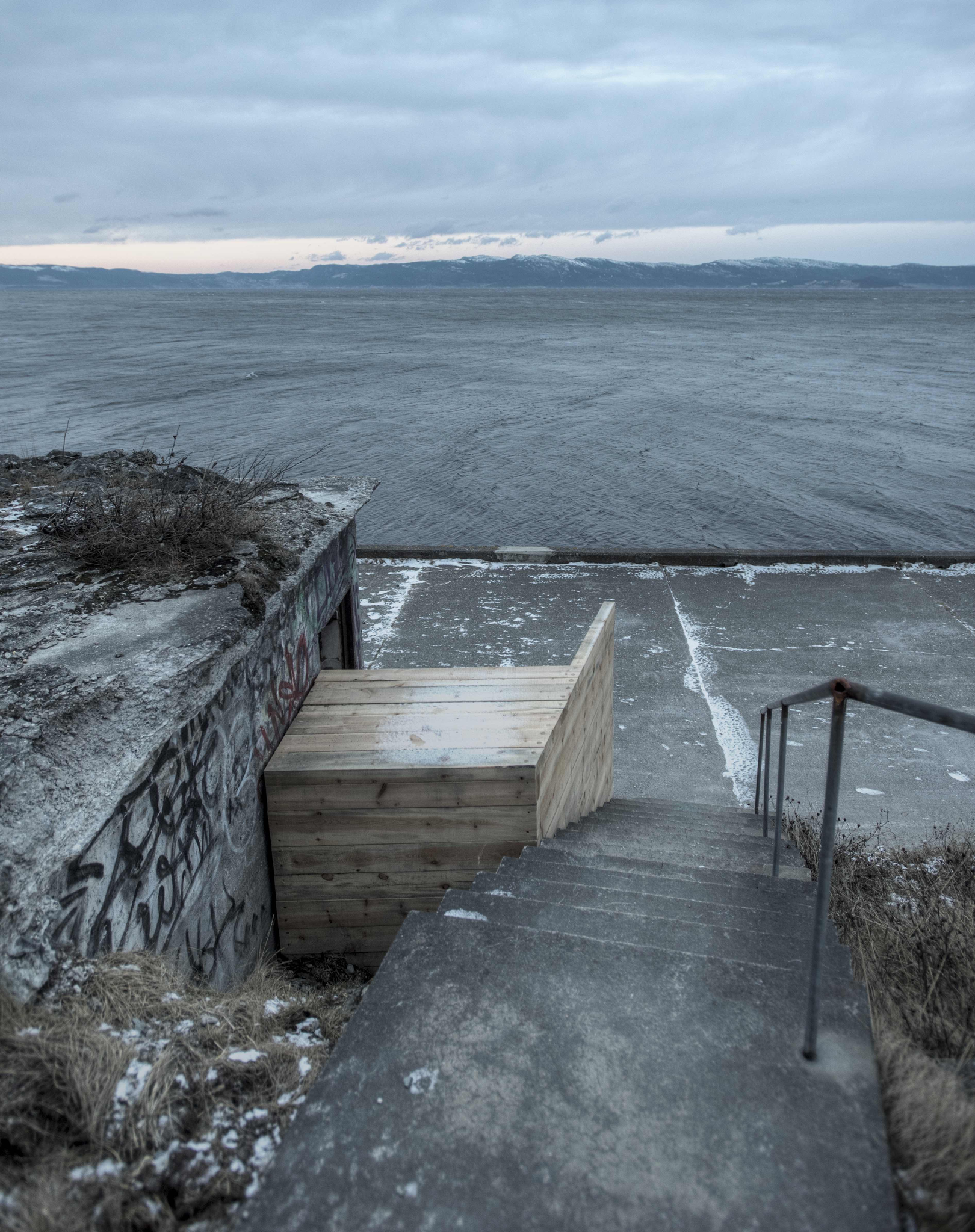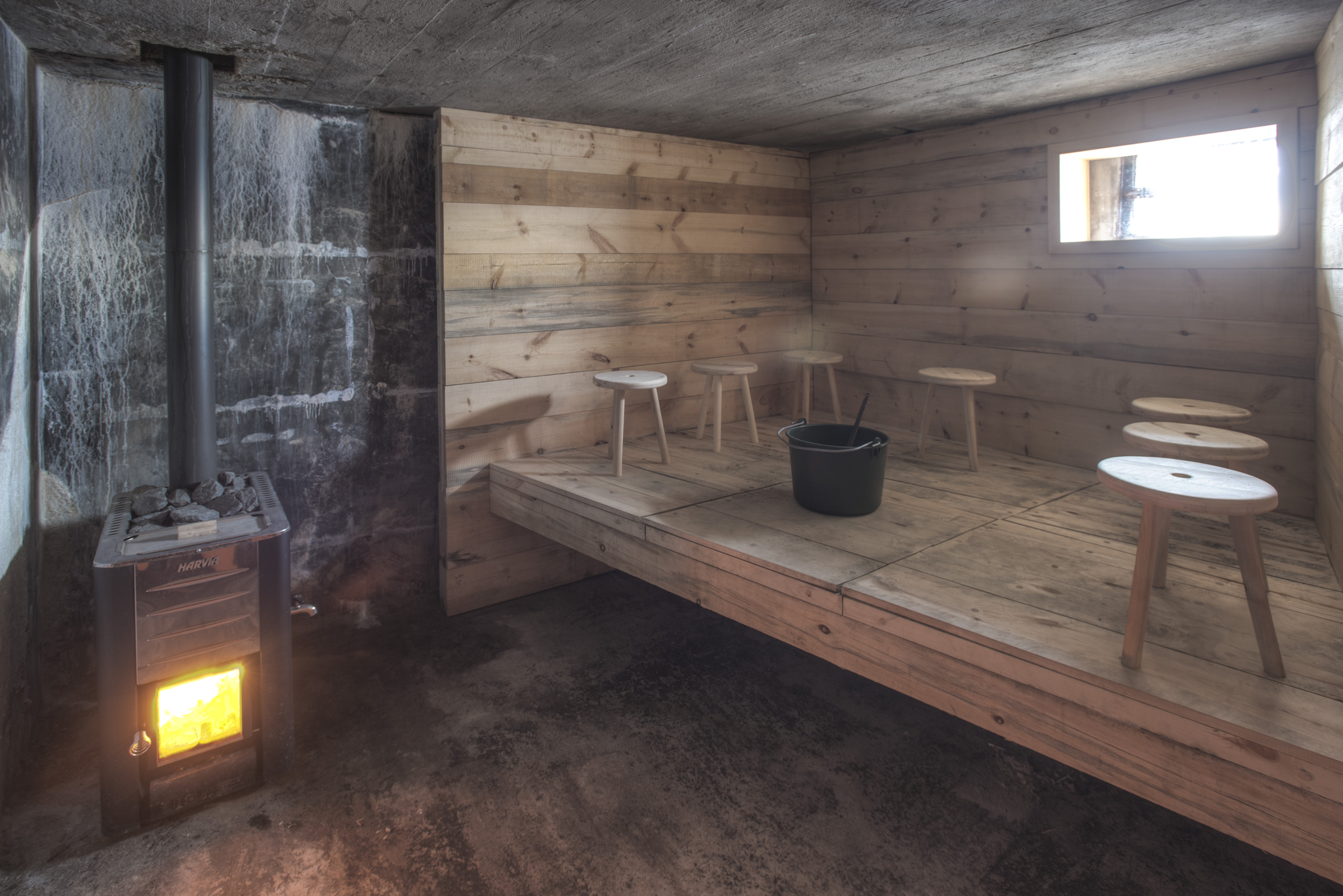 The Bunker is divided into 4 parts. The entrance, which is completely public, marks the Bunker apart from the other 4 and provides a sheltered cooling area for later on. The first room serves as a place for the outer garments necessary for the walk along the Fjord to the Sauna, while the undressing room gives a place to shed the rest of ones clothes before entering the Sauna proper. While entering, the coldness of the bunker is keenly felt, draining warmth from your feet and limbs. In the Sauna, the heat and humidity of the löyly provides a tactile and welcome contrast, only for the body to adjust and soon long for another change – the cool air of the outside.