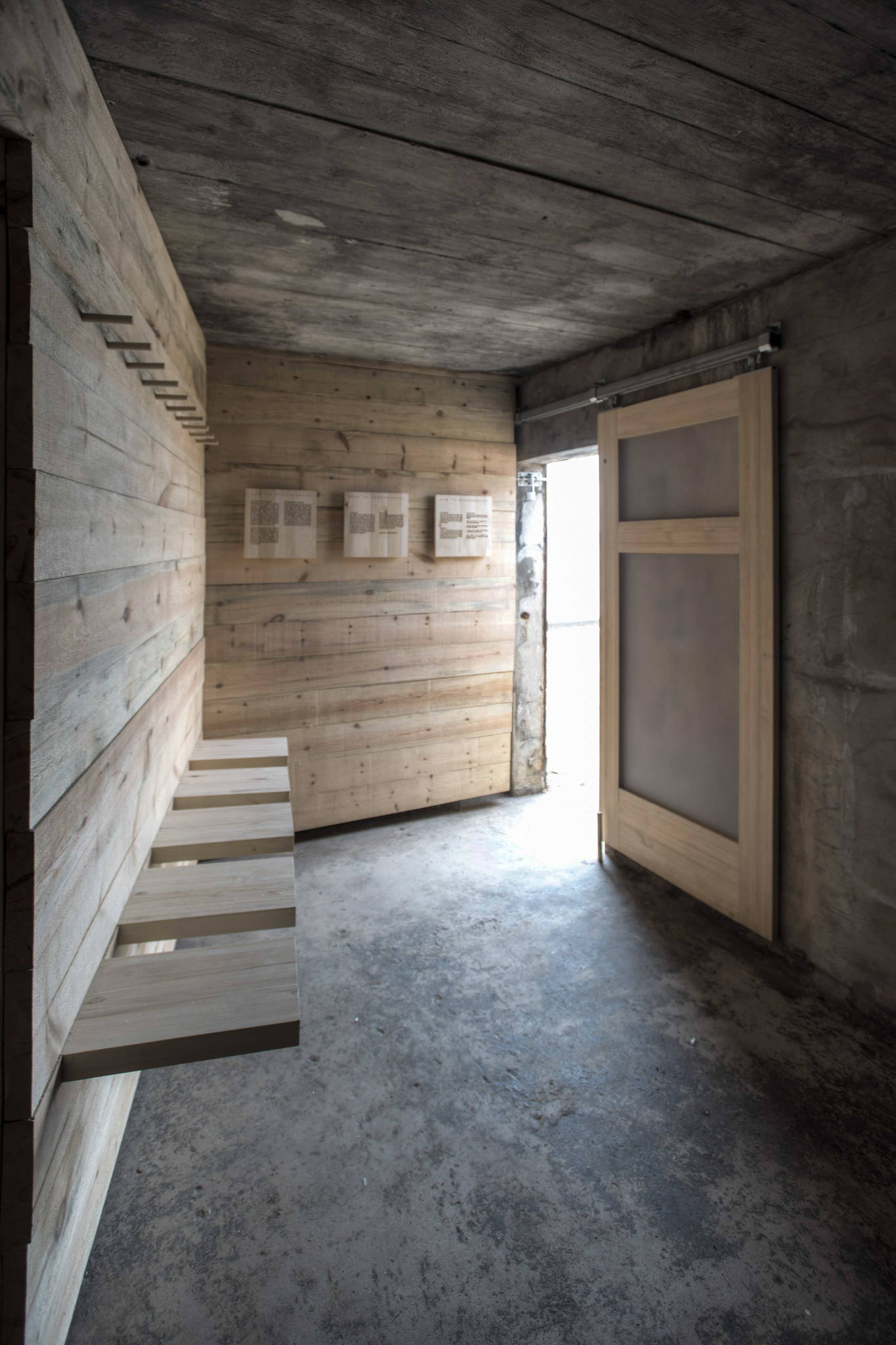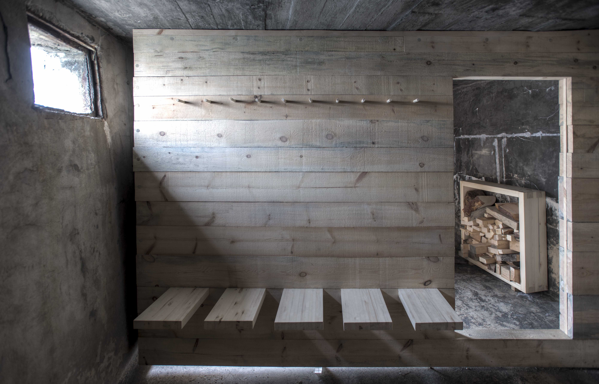 The bunker itself is cast concrete to which minimal changes have been made. With the exception of a few new bolts, the entire project can be taken apart and the project restored to its original state. The interior walls are made of massive stacked pine, making the interior more acoustically pleasing, as well as providing the necessary separation of hot and cold. The wall has a construction that allows for wood movement without risking the pressure building towards the bunker or the hot air leaking from the Sauna. To ensure thermal comfort, all tactile surfaces were made from planed aspen. The water runs on the floor from the Sauna, through the entrance and all the way to the Fjord. There is no plumbing or electricity installed in the bunker, only the comfort of a live fire.
