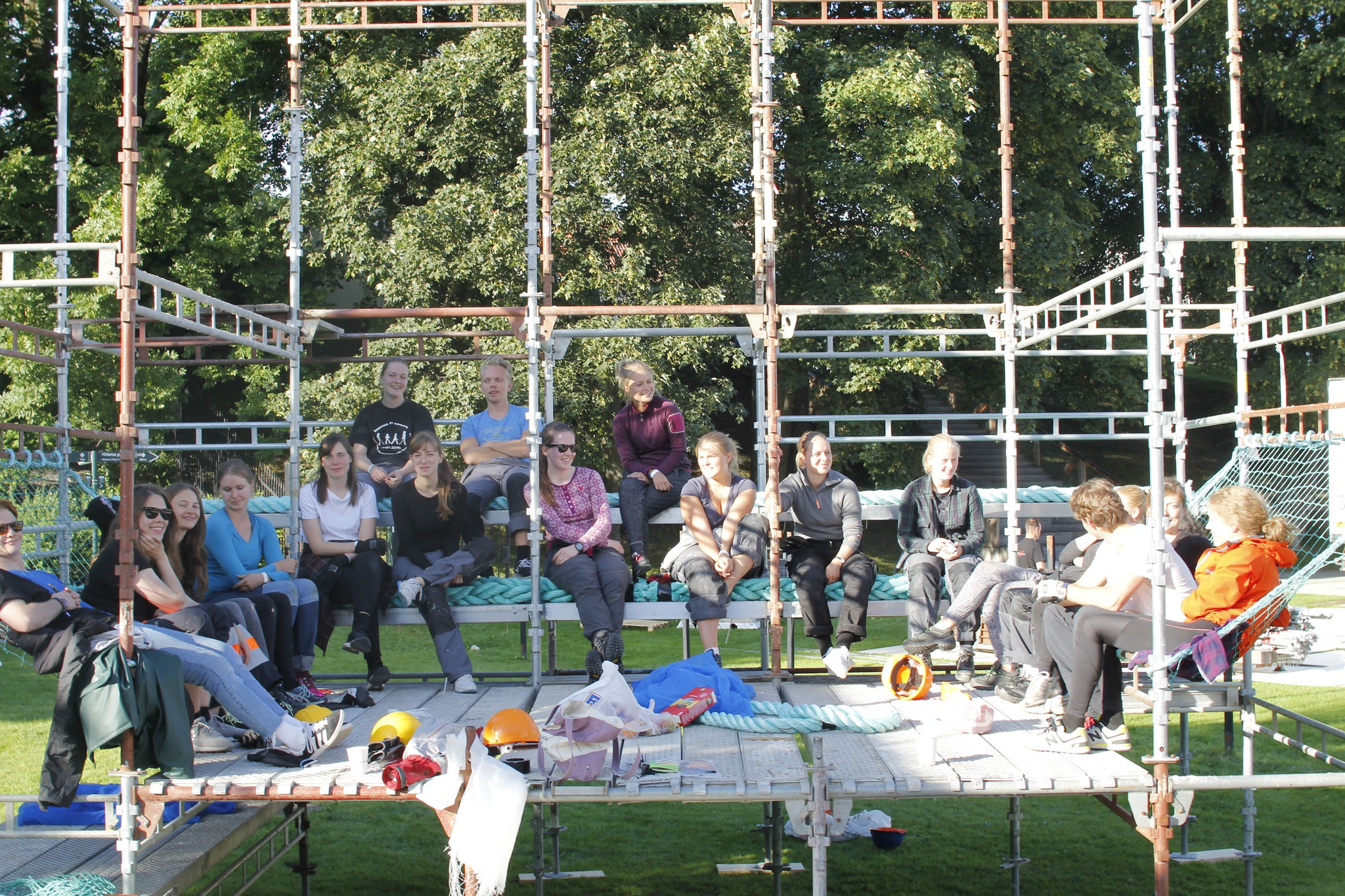 Konstruksjonen er et stillas som ble kledd inn og videre utformet ved bruk av ulike materialer som vi enten fant på Heggstadmoen eller fikk fra teatrene i byen.
