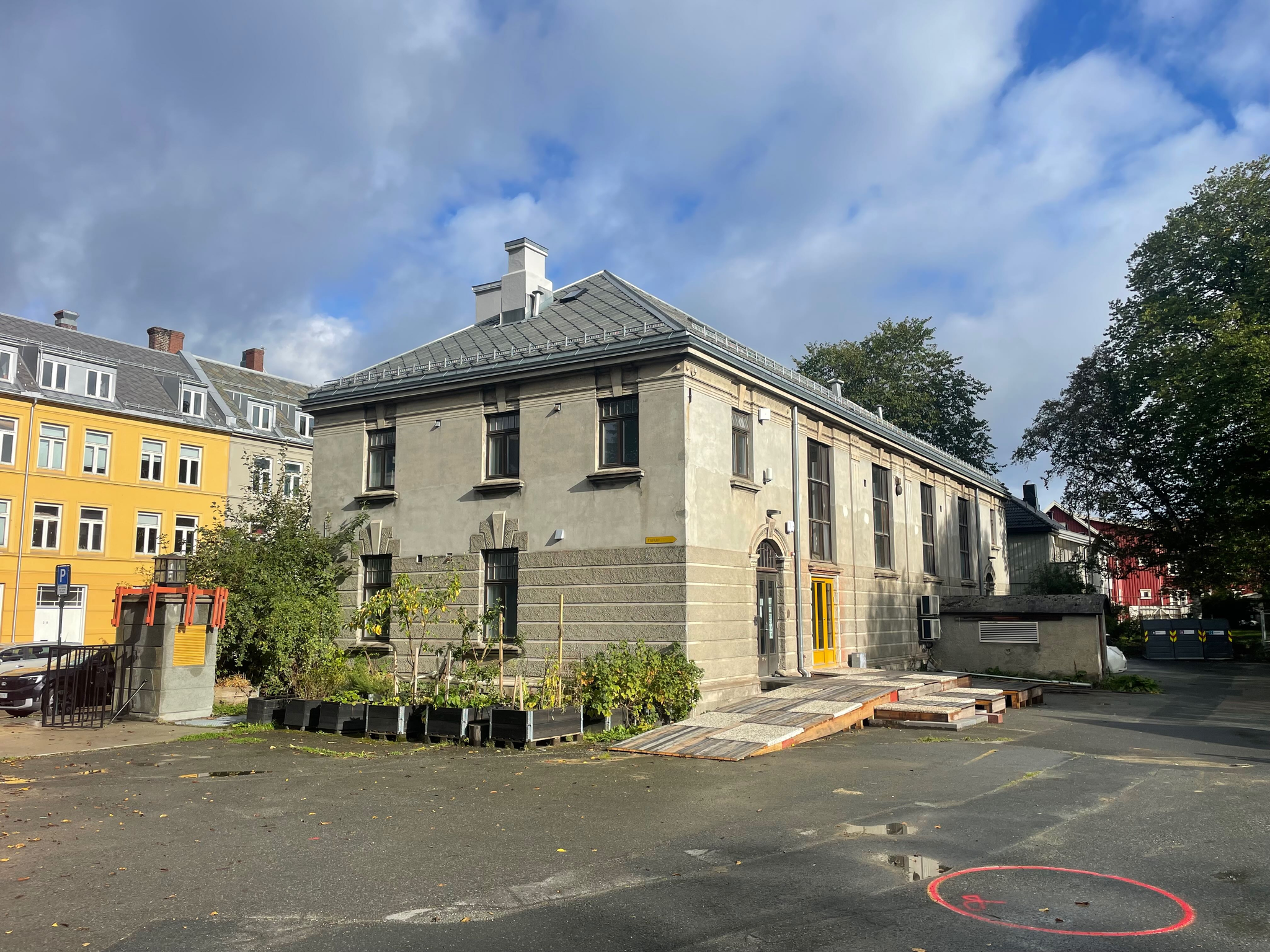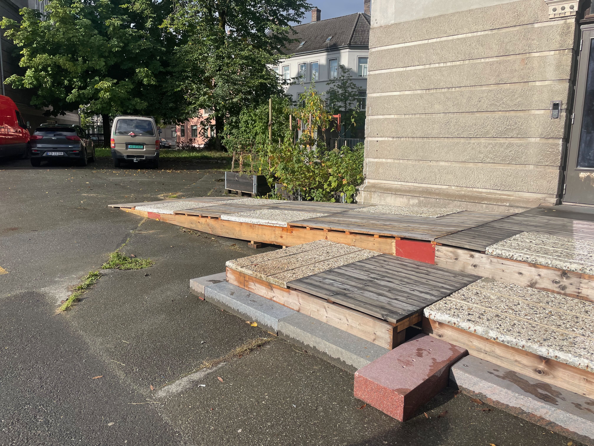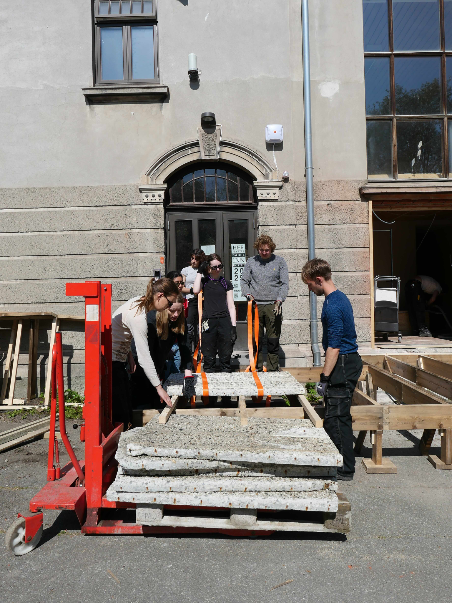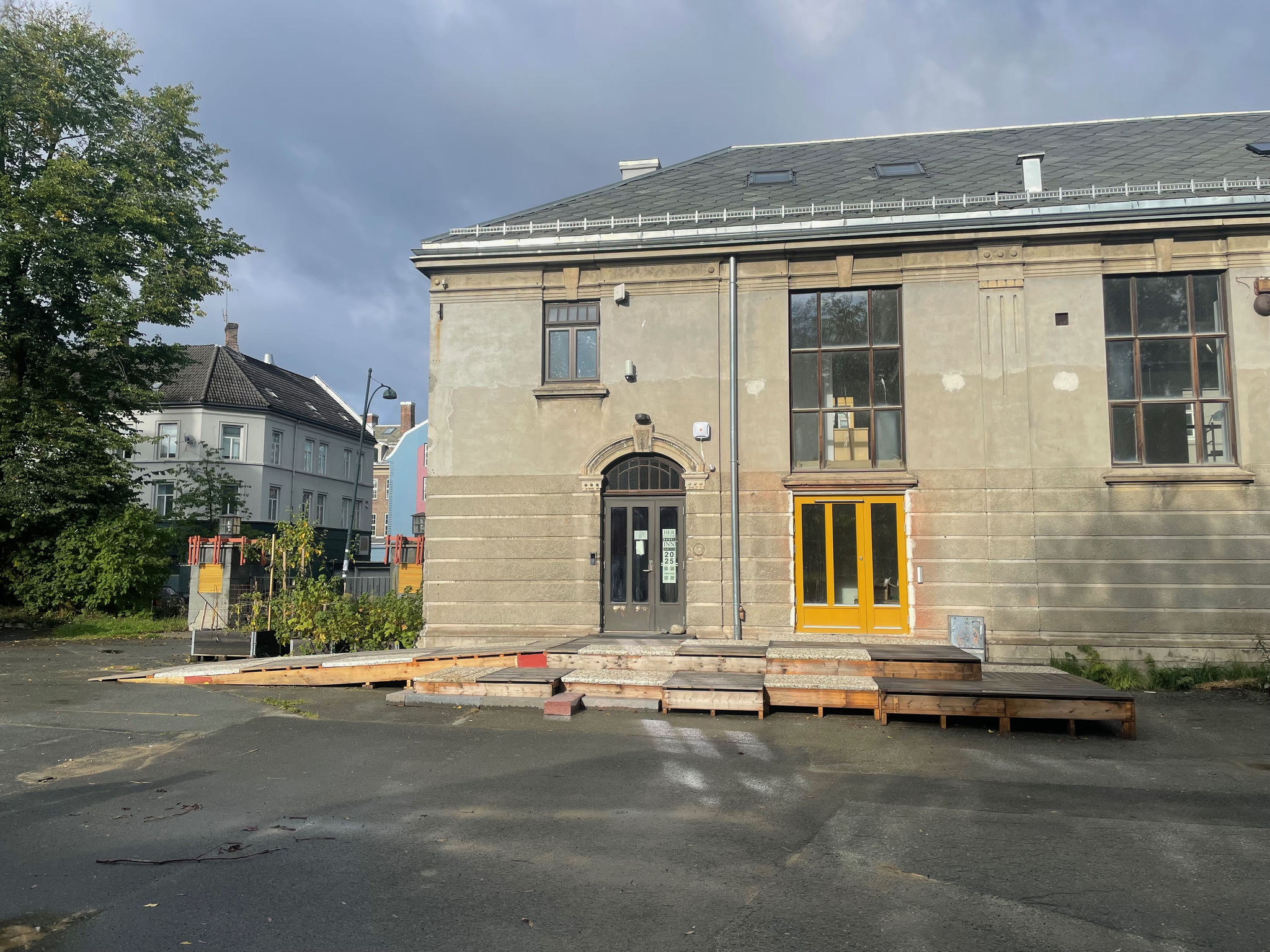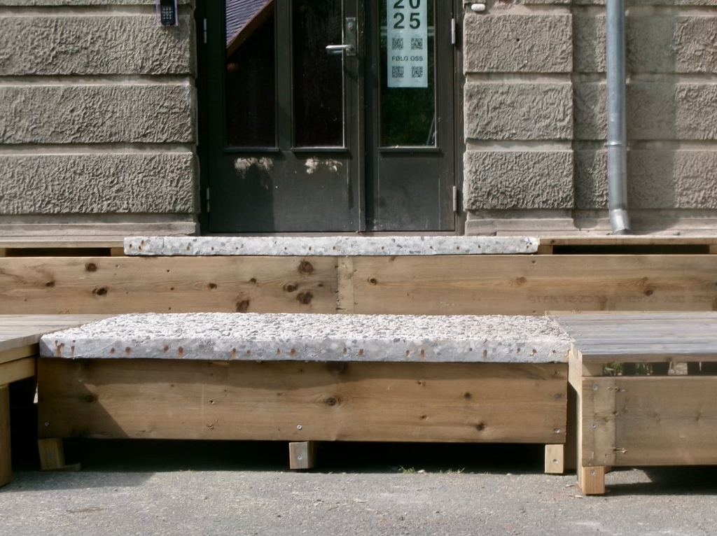 StudioBeta have designed and built the new entrance to Babel visningrom for kunst, an exhibition space run by Lademoen Kunstnerverksteder i Trondheim. The project is based on almost 100% reuse of materials. Most of the wooden structure is reused from another temporary entrance at the art museum in town. The concrete areas are repurposed fasade cladding from a building in Nordre gate, donated by Veidekke and Tverås maskin and the stone steps are leftover material from the local cementary.