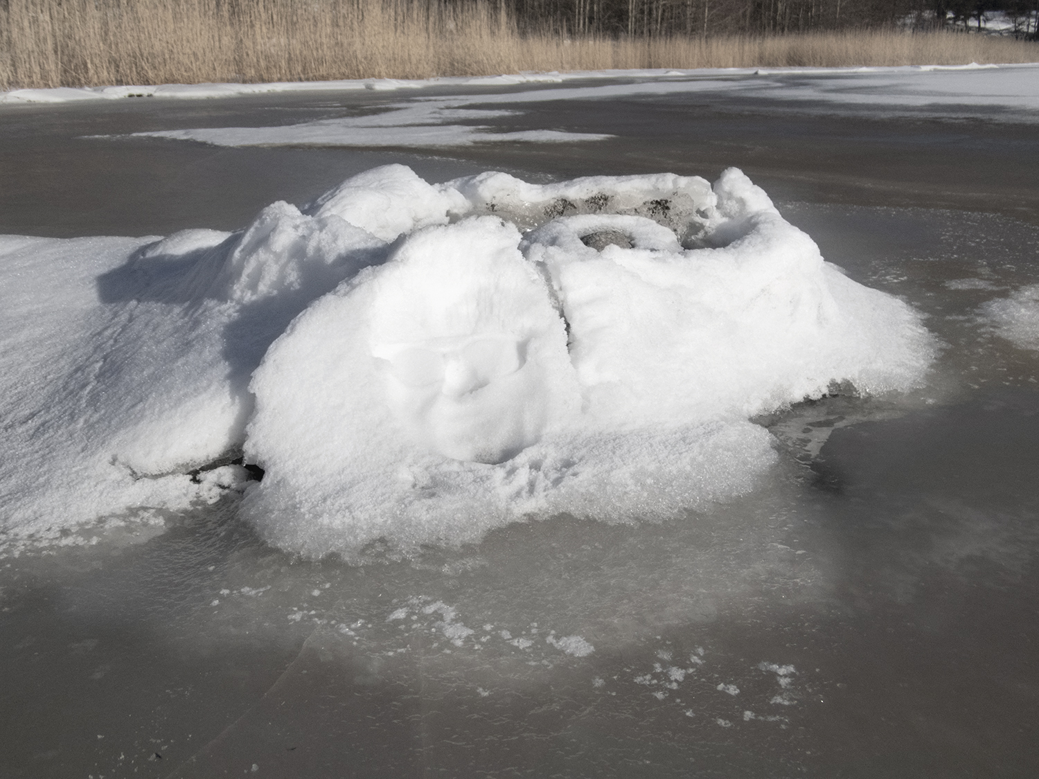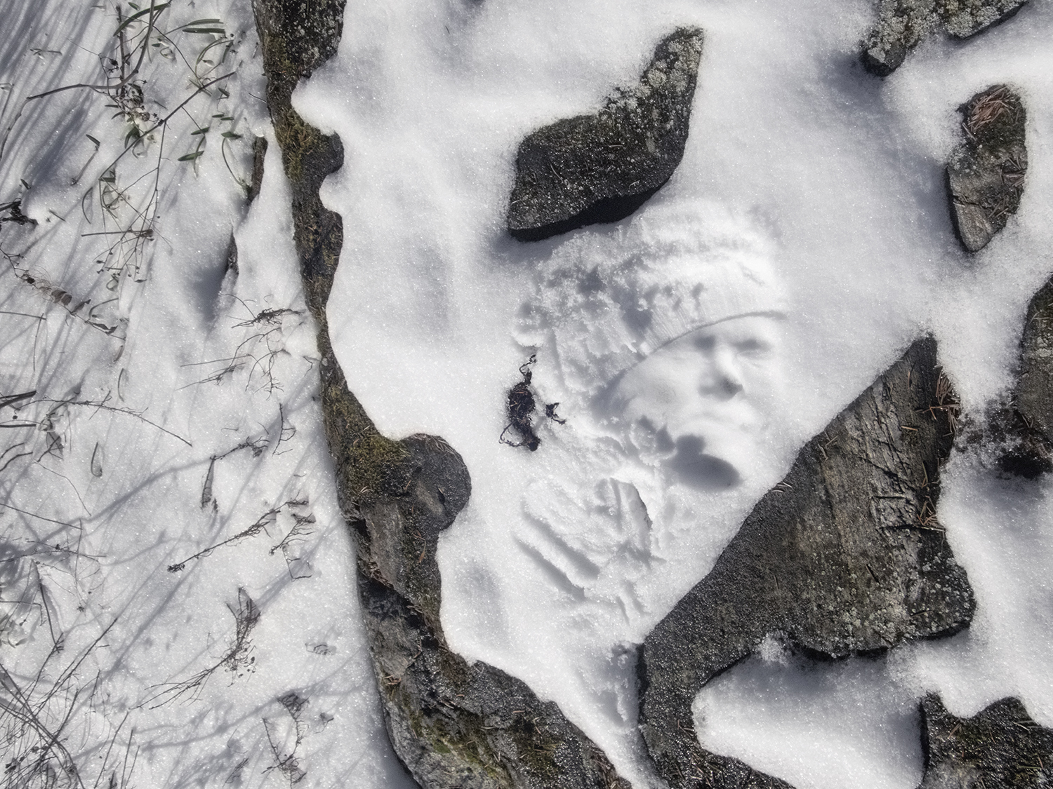 Tuula Närhinen’s work-in-progress Self-Portrait in Snow (2025) sets out to explore facial pareidolia, the tendency to see ‘hidden faces’ in the natural world. Snow is harnessed to work as a spiritual medium that provides access to a speculative pictorial heritage. Drawing on methods of visual empiricism, Dr Närhinen’s playful project explores anthropometric survey techniques. The work introduces a collection of facial imprints, generated by pressing the visage tightly against snow cover.