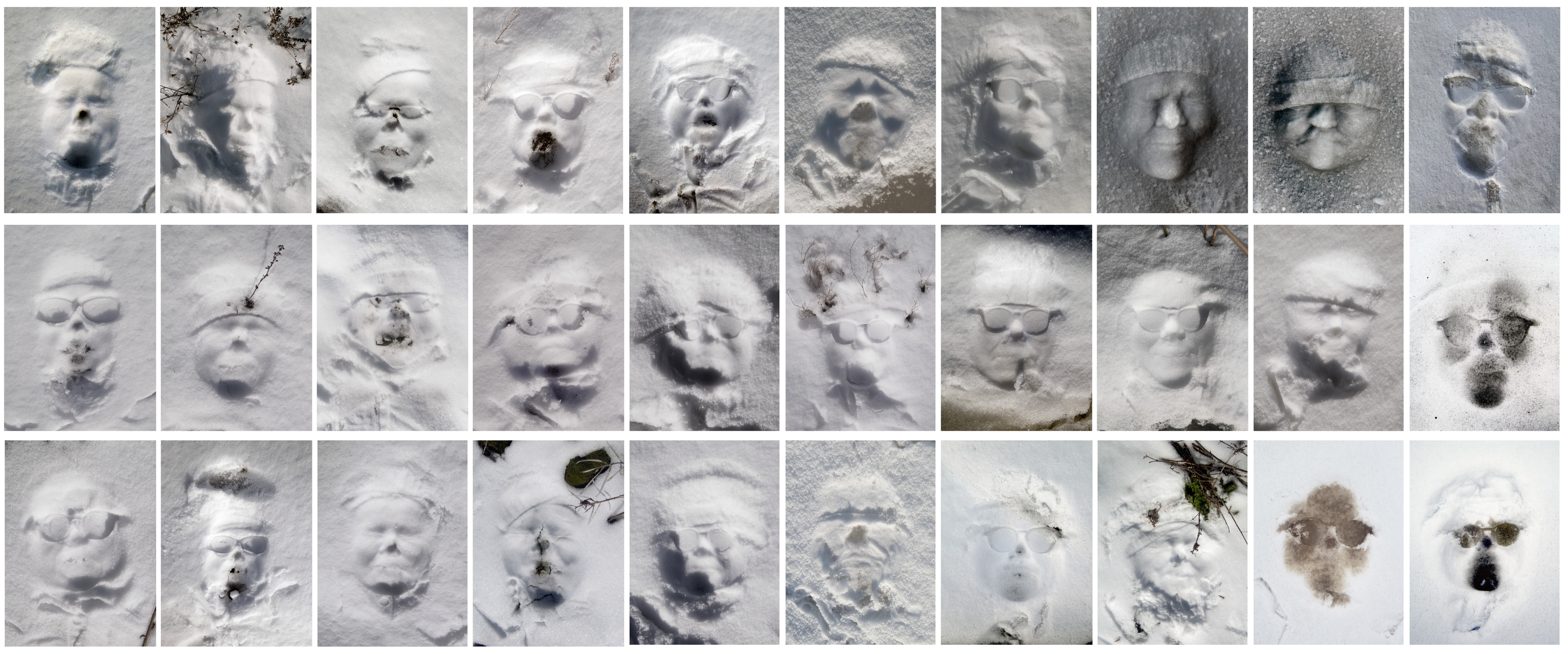 Counterintuitively, instead of auto-portraits, these head dives into snow generated depictions of strangers surfacing from the bosom of the earth. In browsing this ghostly archive, Närhinen was surprised to find the spitting image of her bearded late father and, subsequently, she spotted more vivid likenesses to other family members as well.