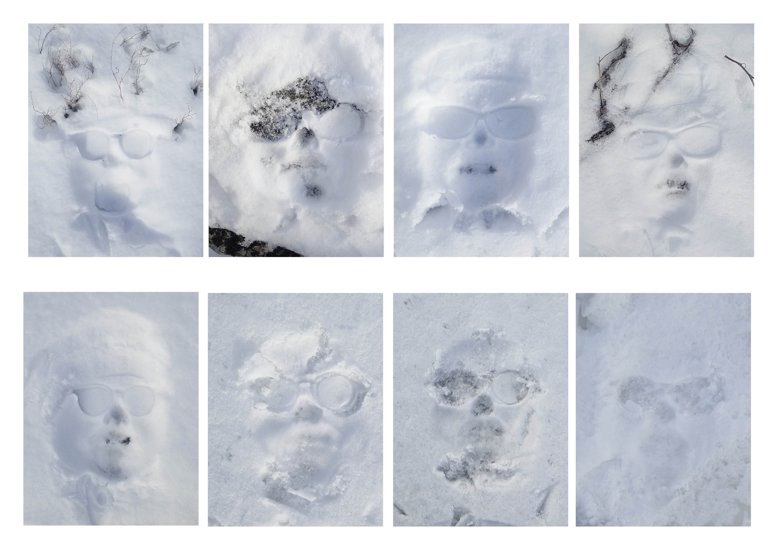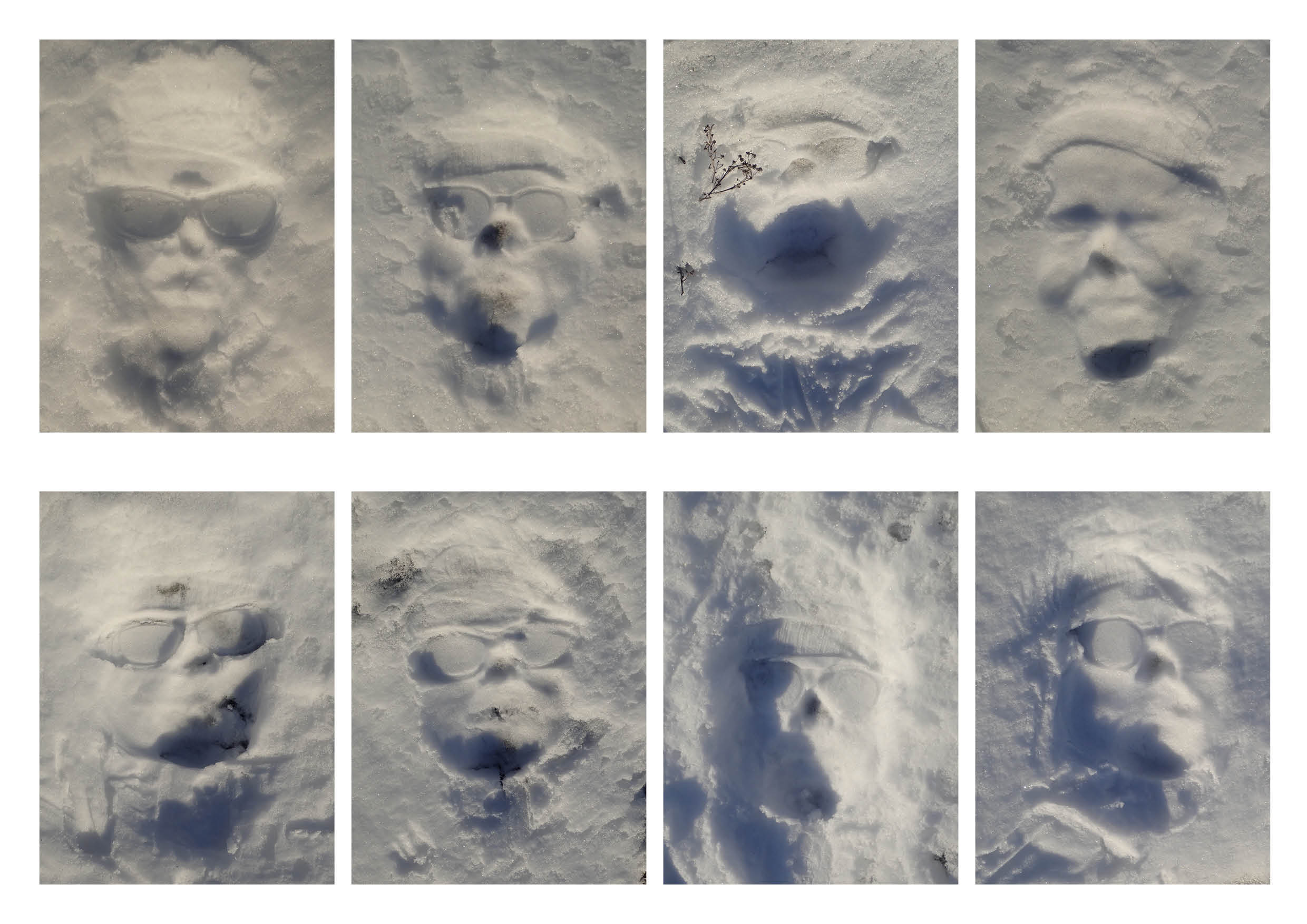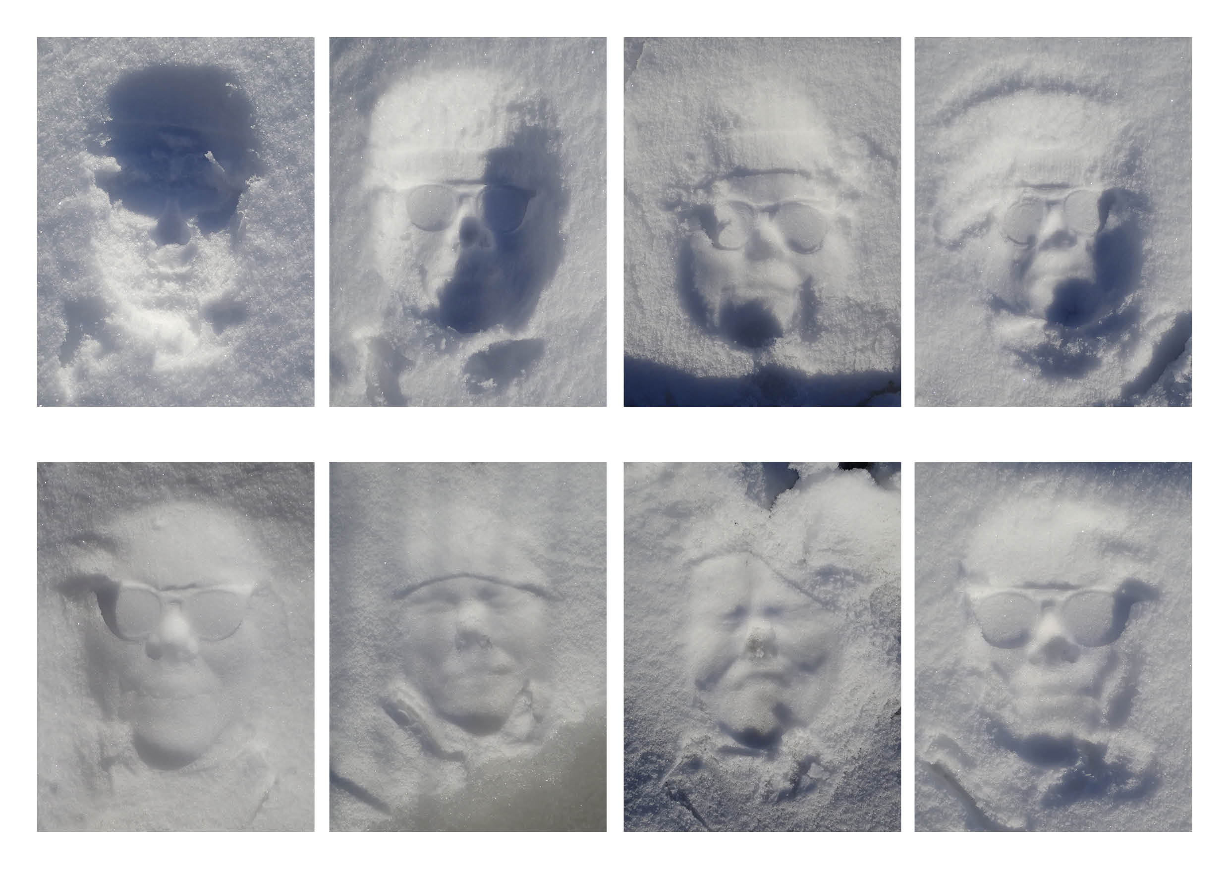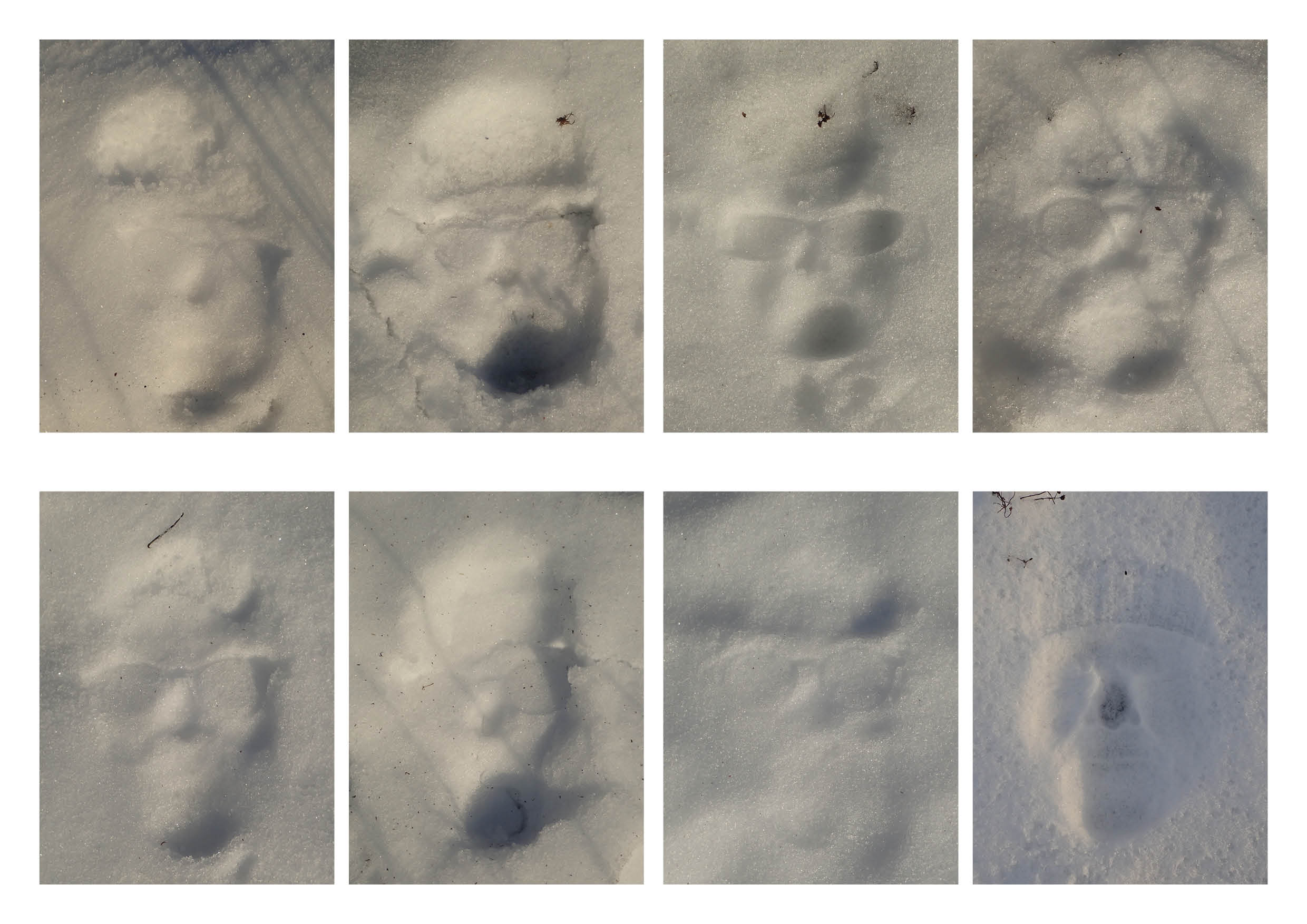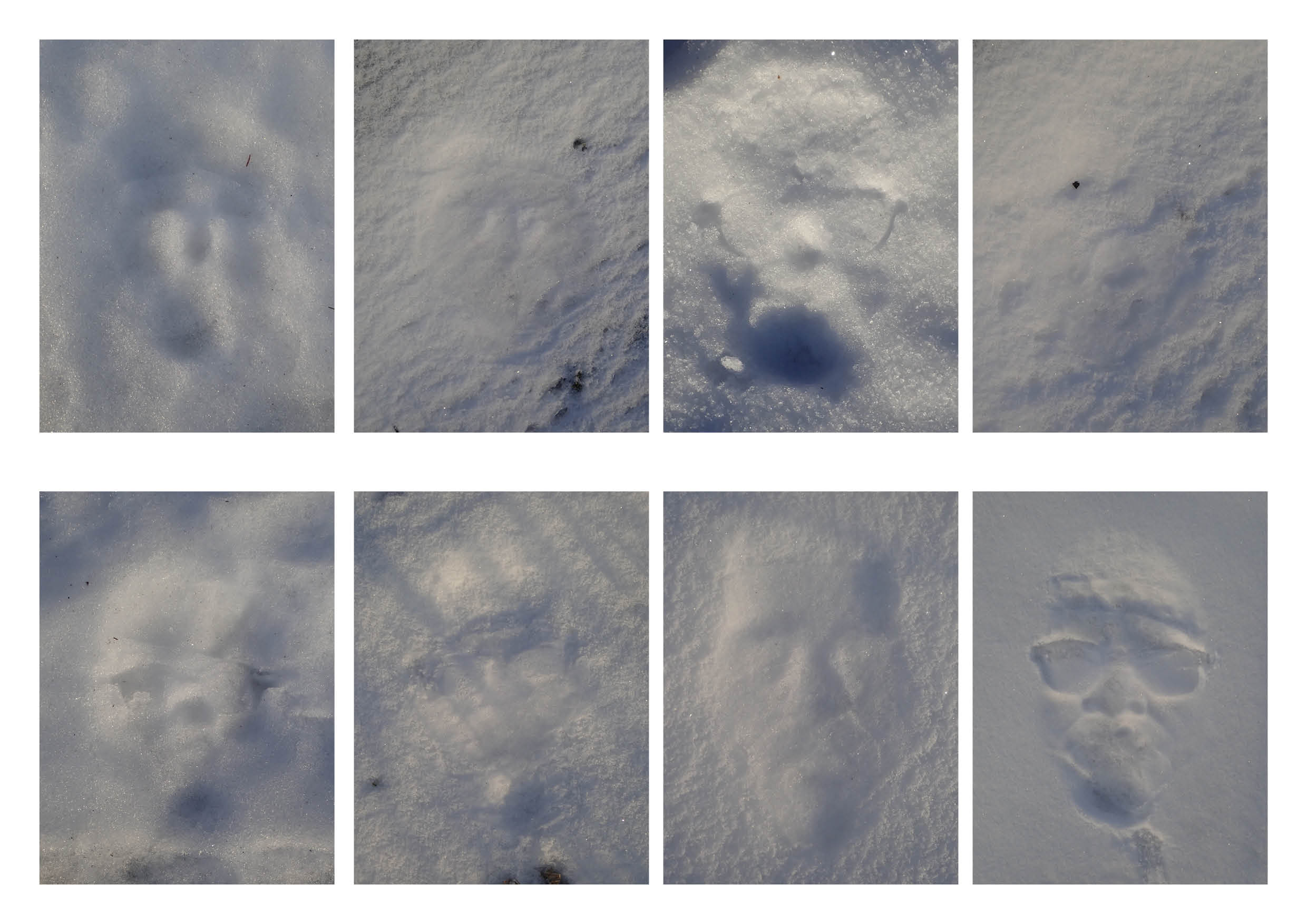 Tuula Närhinen’s recent work-in-progress Self-Portrait in Snow(2025) sets out to explore facial pareidolia, the tendency to see ‘hidden faces’ in the natural world. Snow is harnessed to work as a spiritual medium that provides access to a speculative pictorial heritage. Drawing from 19th century methods of visual empiricism, Närhinen’s playful project revisits anthropometric survey techniques. The work introduces a collection of facial imprints, generated by pressing the visage tightly against snow cover.