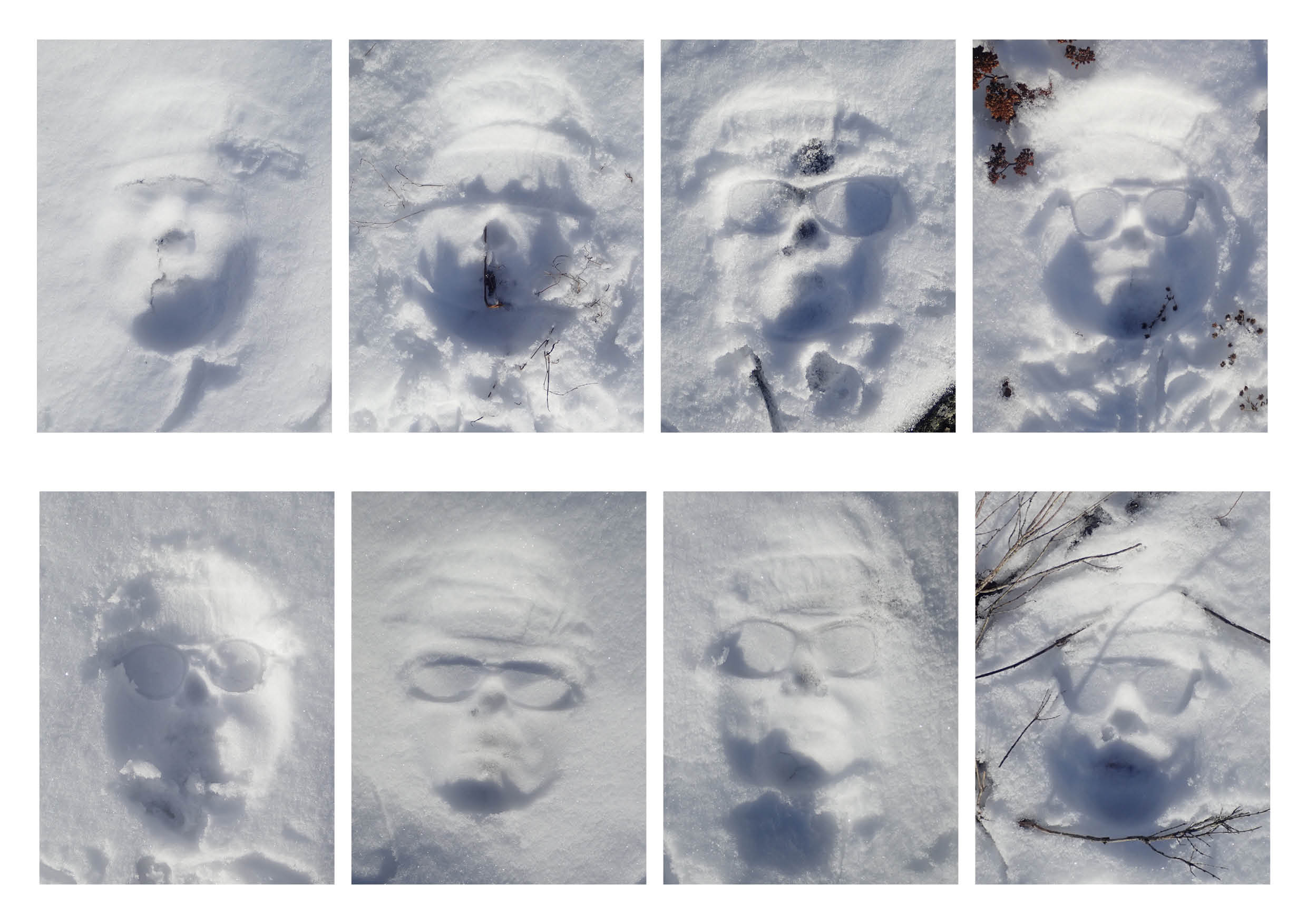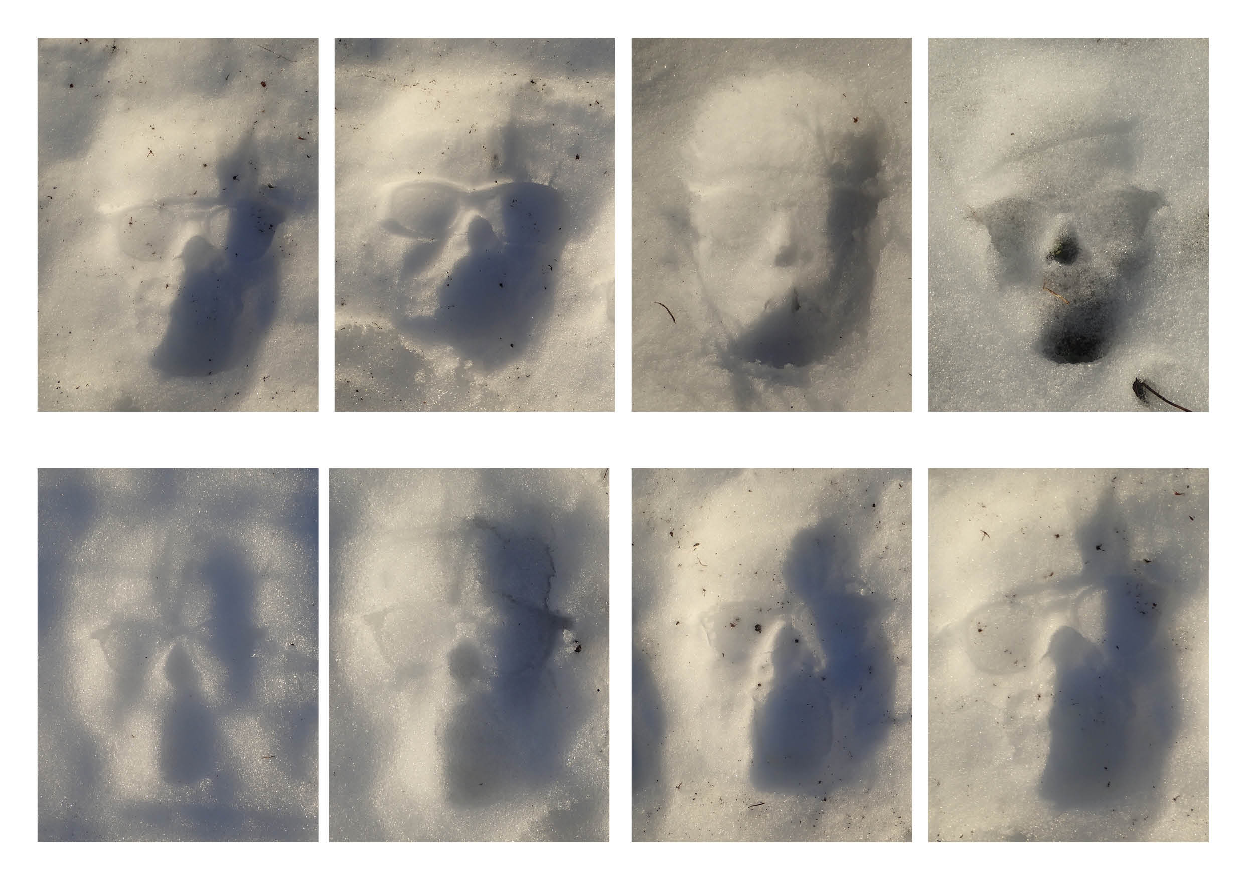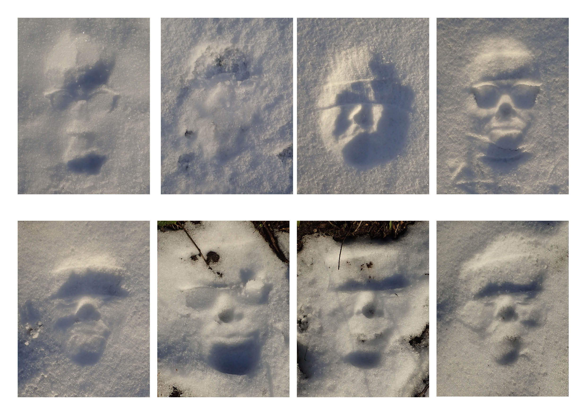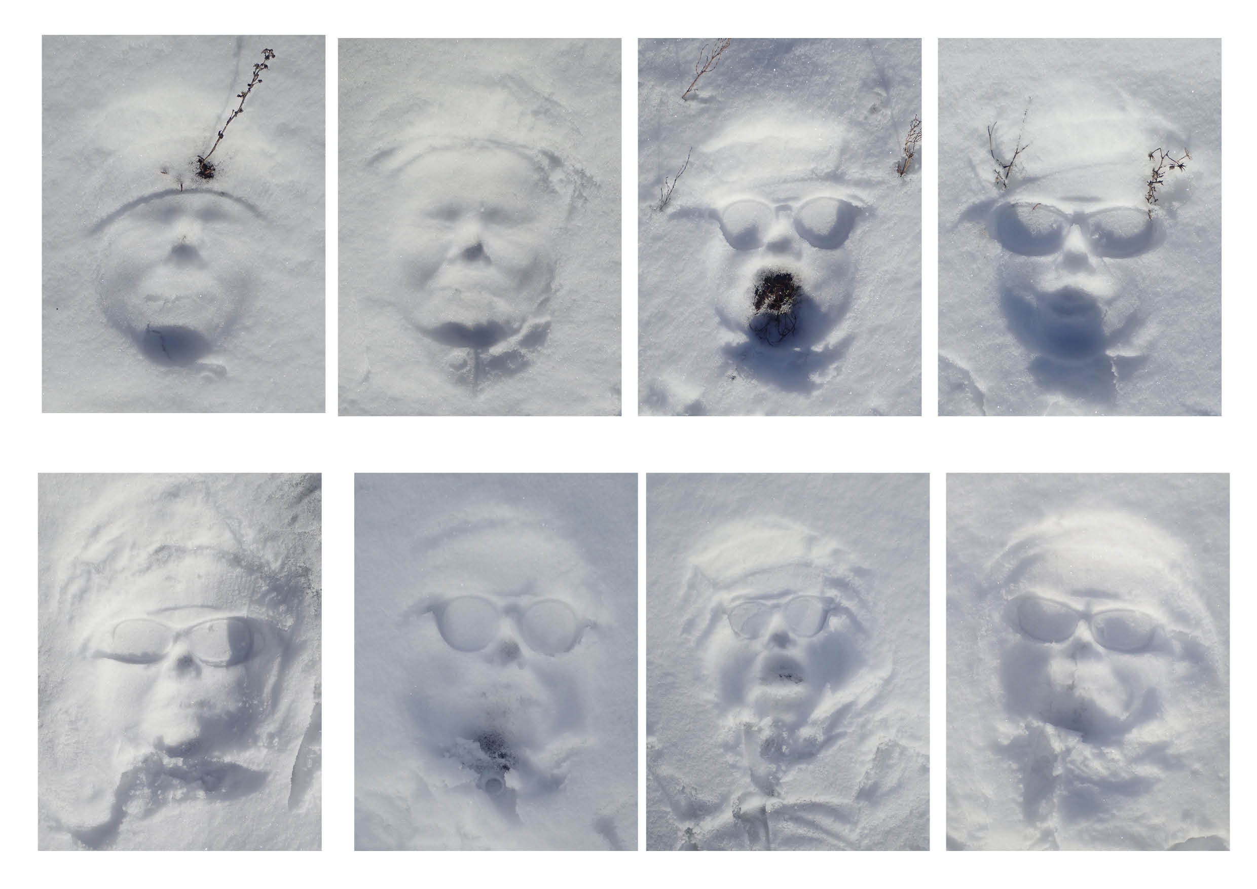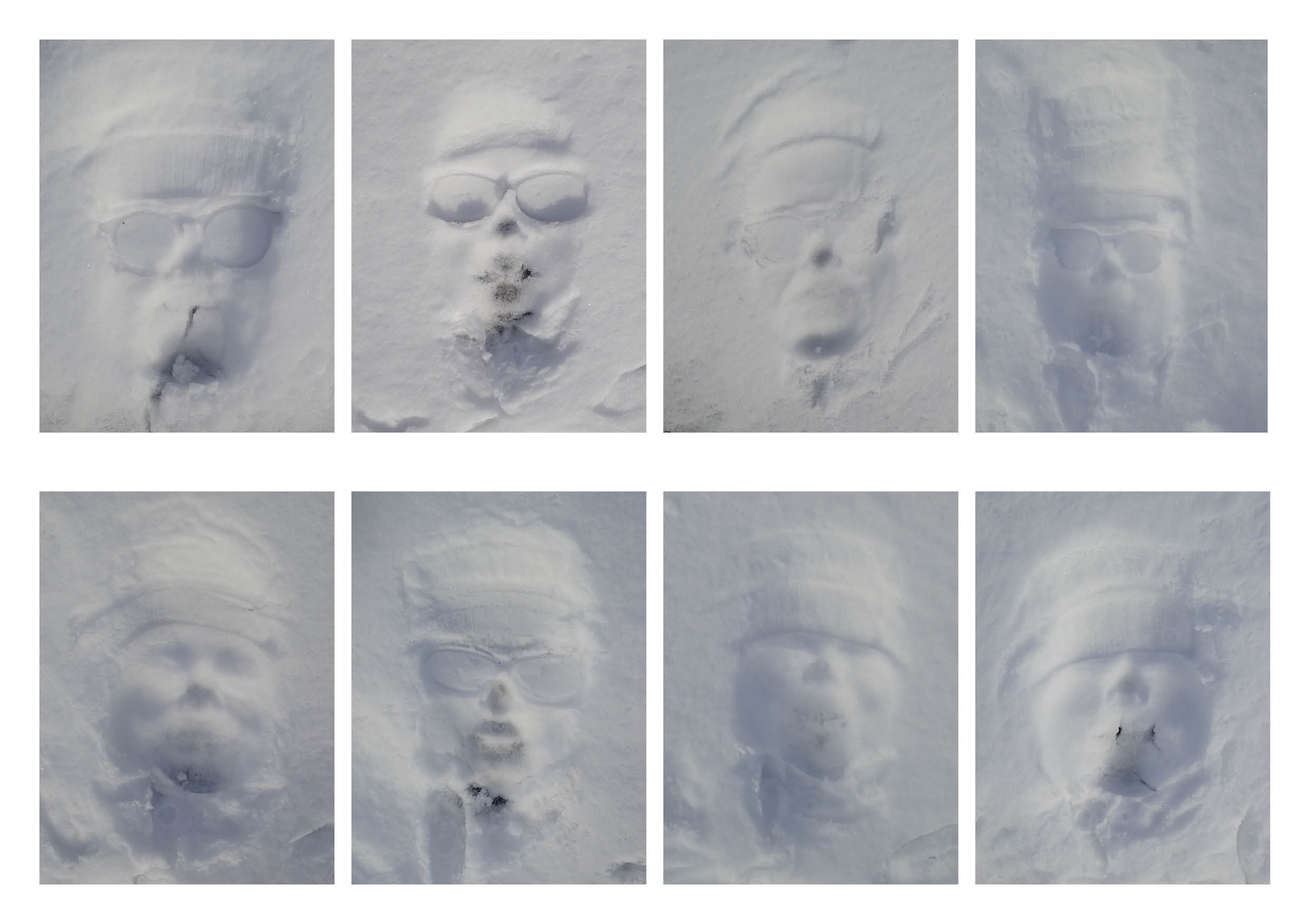 Tuula Närhinen’s recent work-in-progress Self-Portrait in Snow(2025) sets out to explore facial pareidolia, the tendency to see ‘hidden faces’ in the natural world. Snow is harnessed to work as a spiritual medium that provides access to a speculative pictorial heritage. Drawing from 19th century methods of visual empiricism, Närhinen’s playful project revisits anthropometric survey techniques. The work introduces a collection of facial imprints, generated by pressing the visage tightly against snow cover.