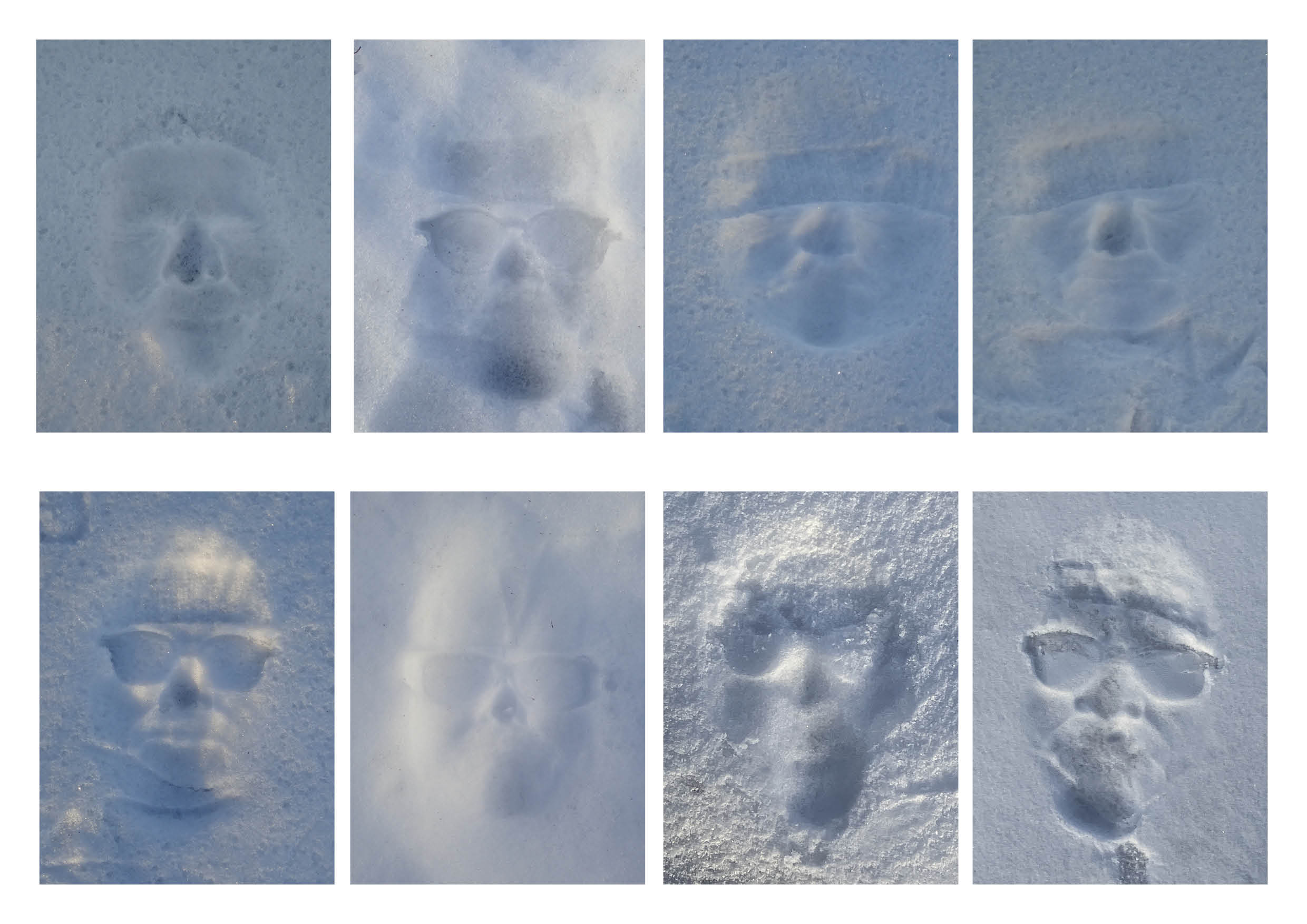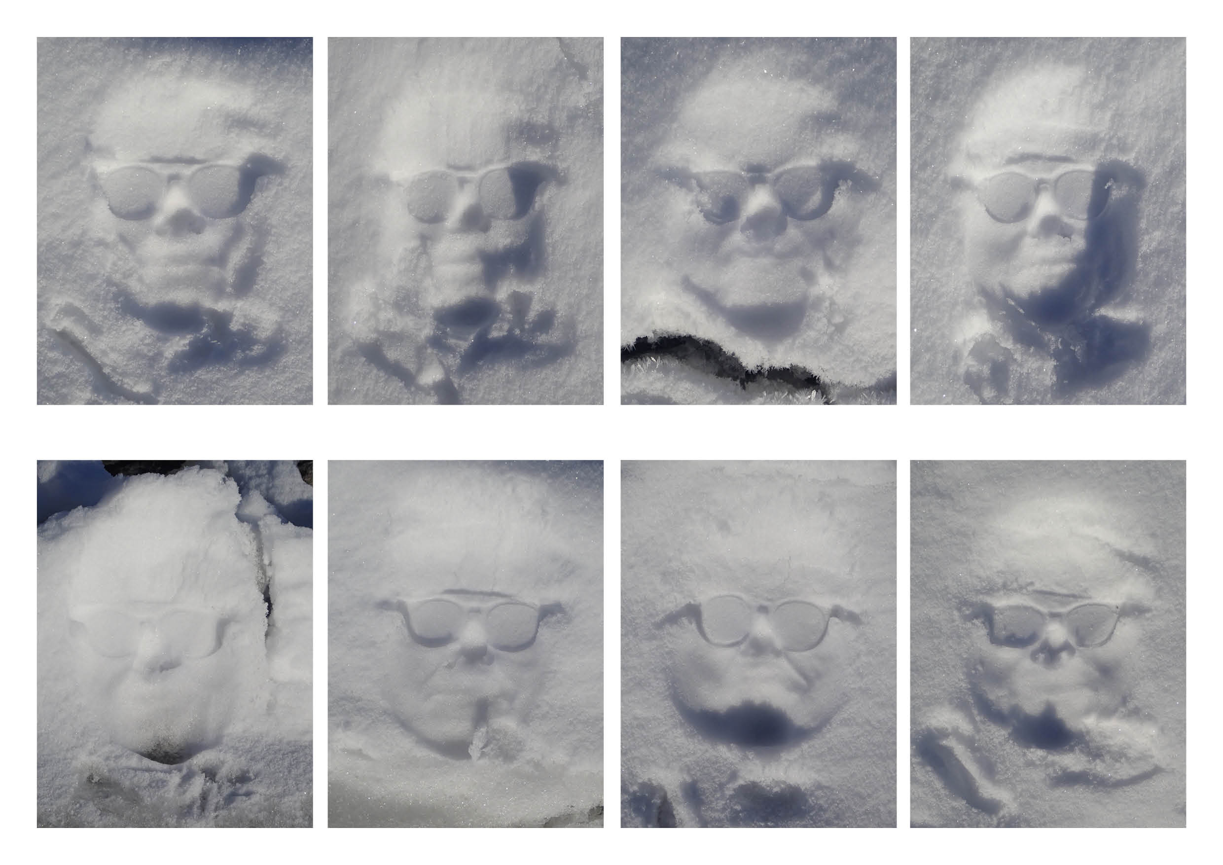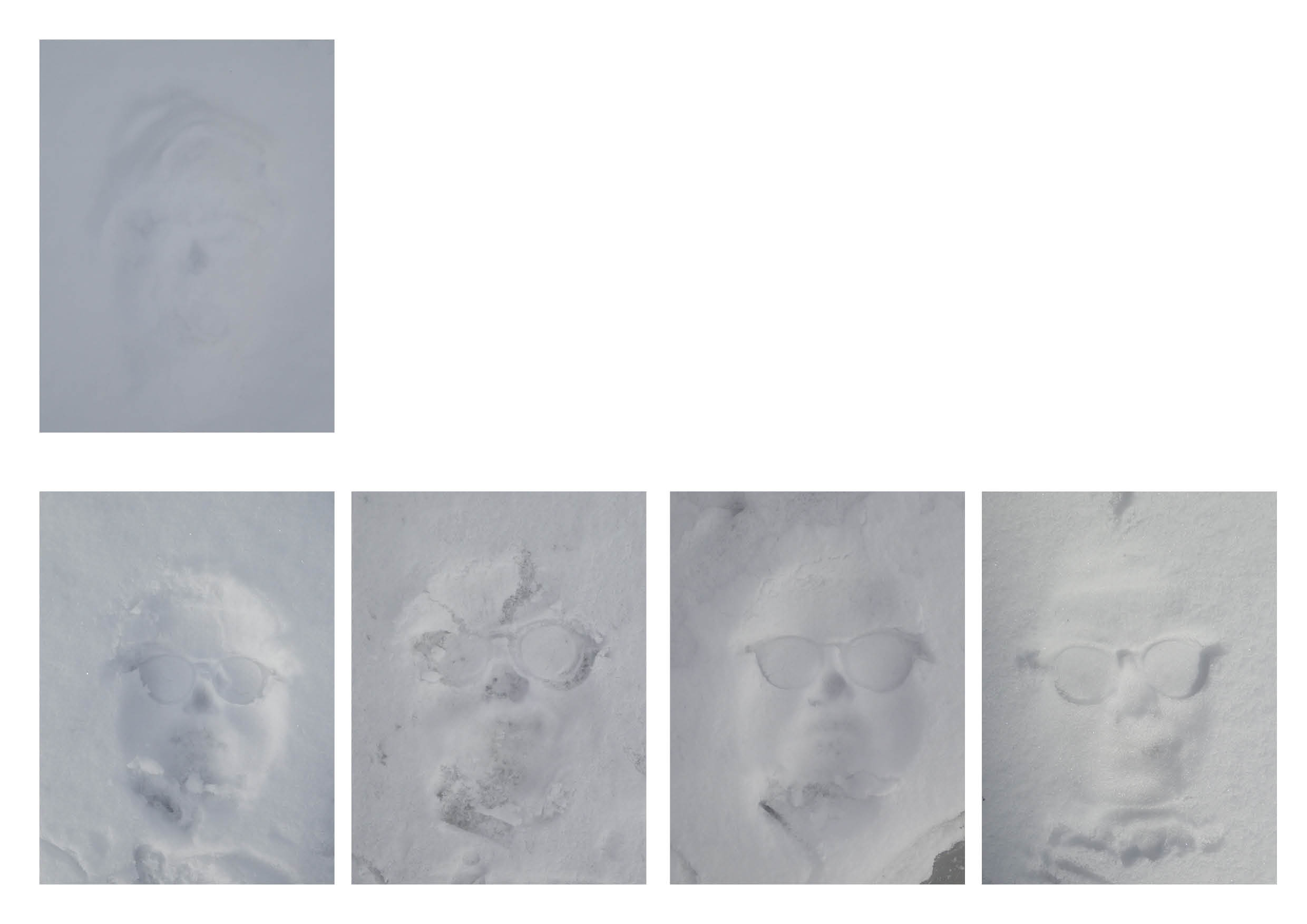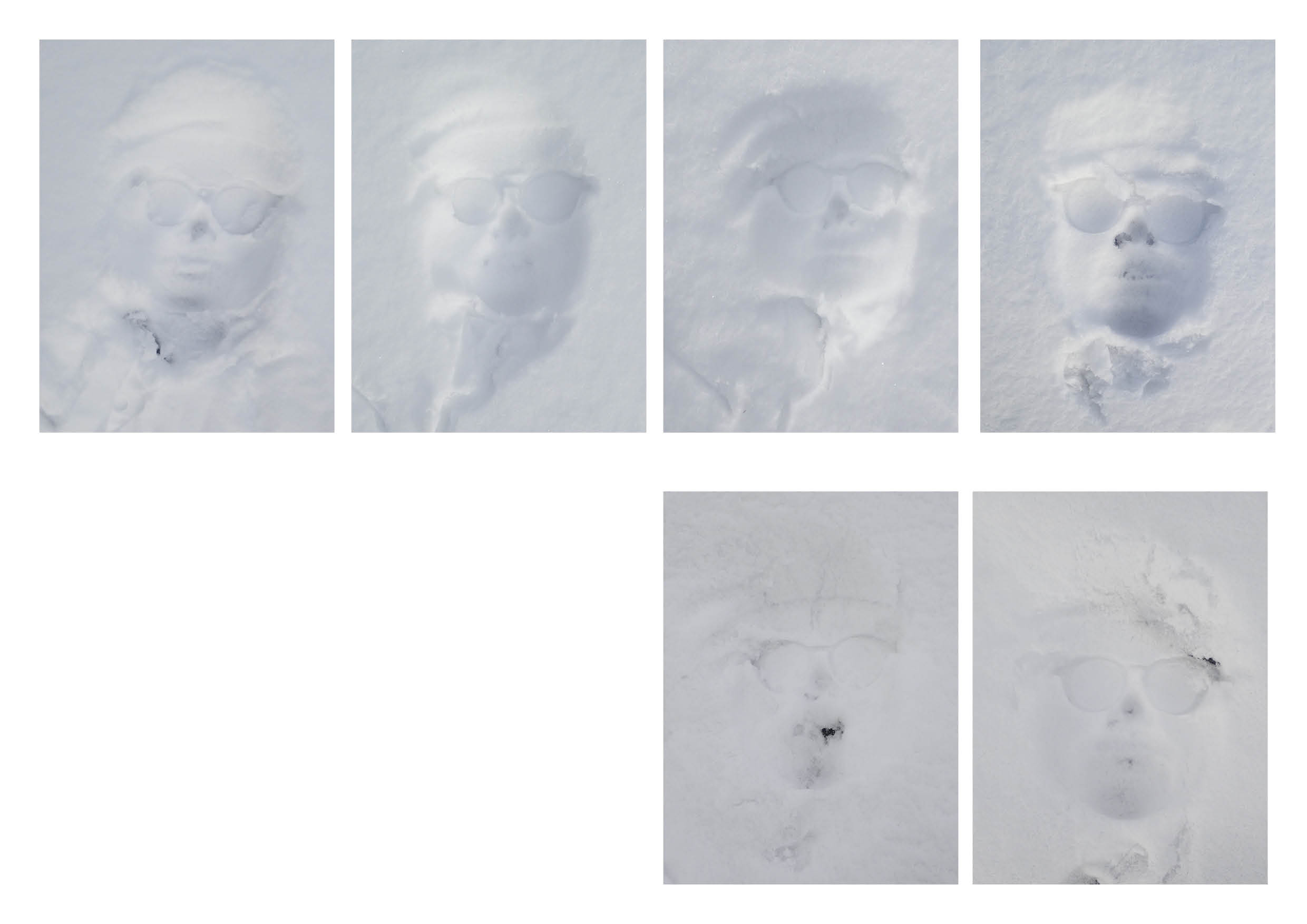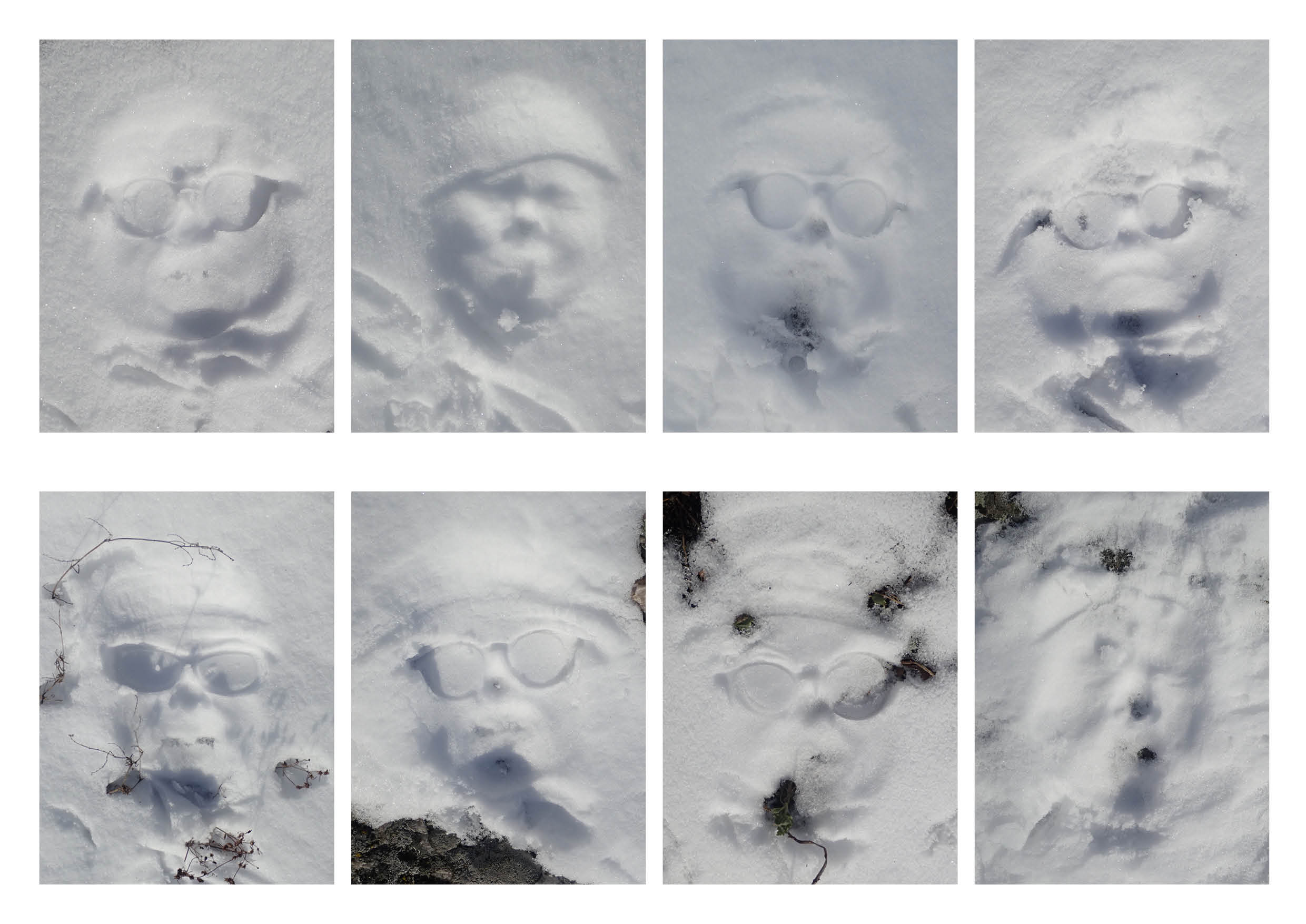 Tuula Närhinen’s recent work-in-progress Self-Portrait in Snow(2025) sets out to explore facial pareidolia, the tendency to see ‘hidden faces’ in the natural world. Snow is harnessed to work as a spiritual medium that provides access to a speculative pictorial heritage. Drawing from 19th century methods of visual empiricism, Närhinen’s playful project revisits anthropometric survey techniques. The work introduces a collection of facial imprints, generated by pressing the visage tightly against snow cover.