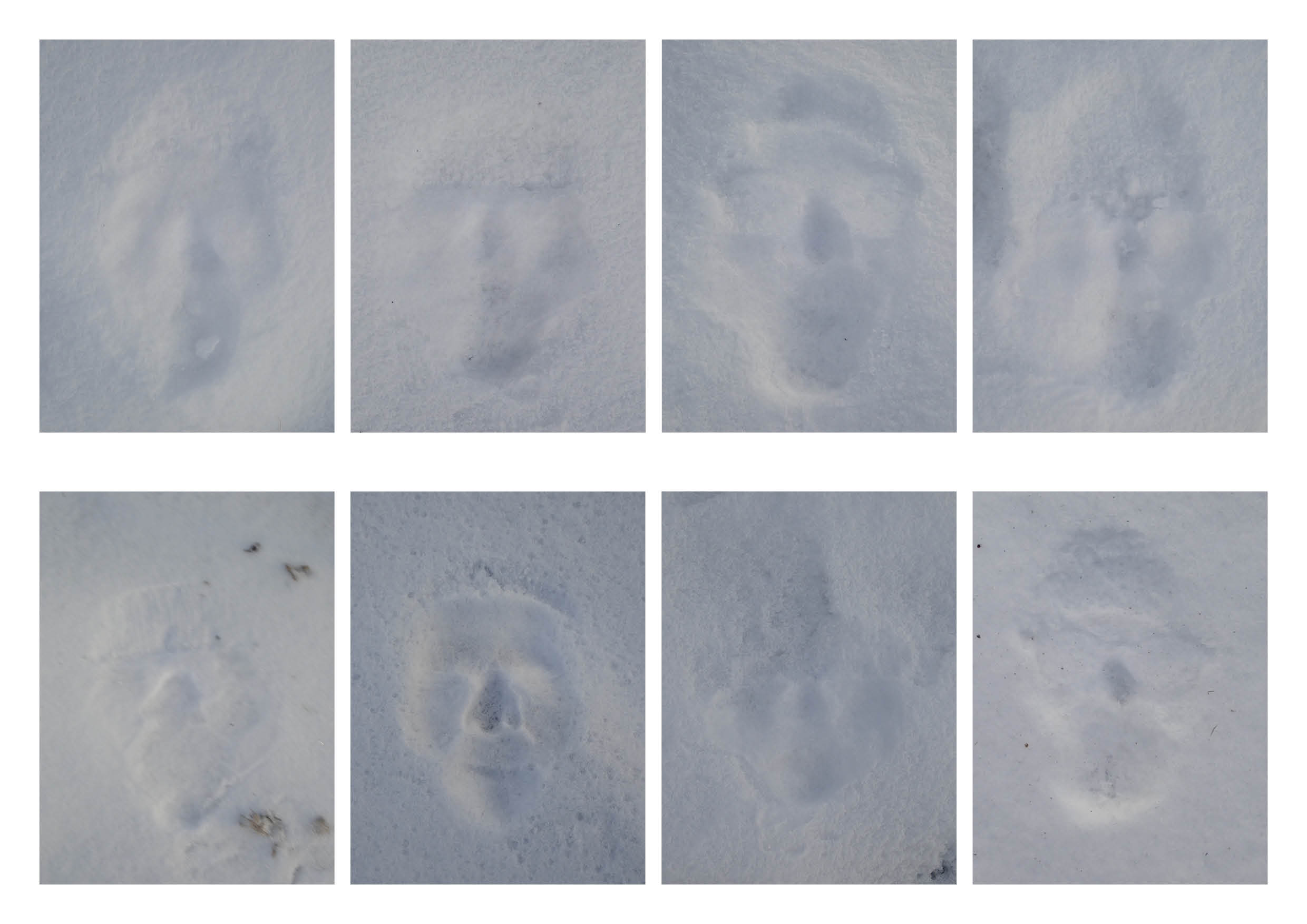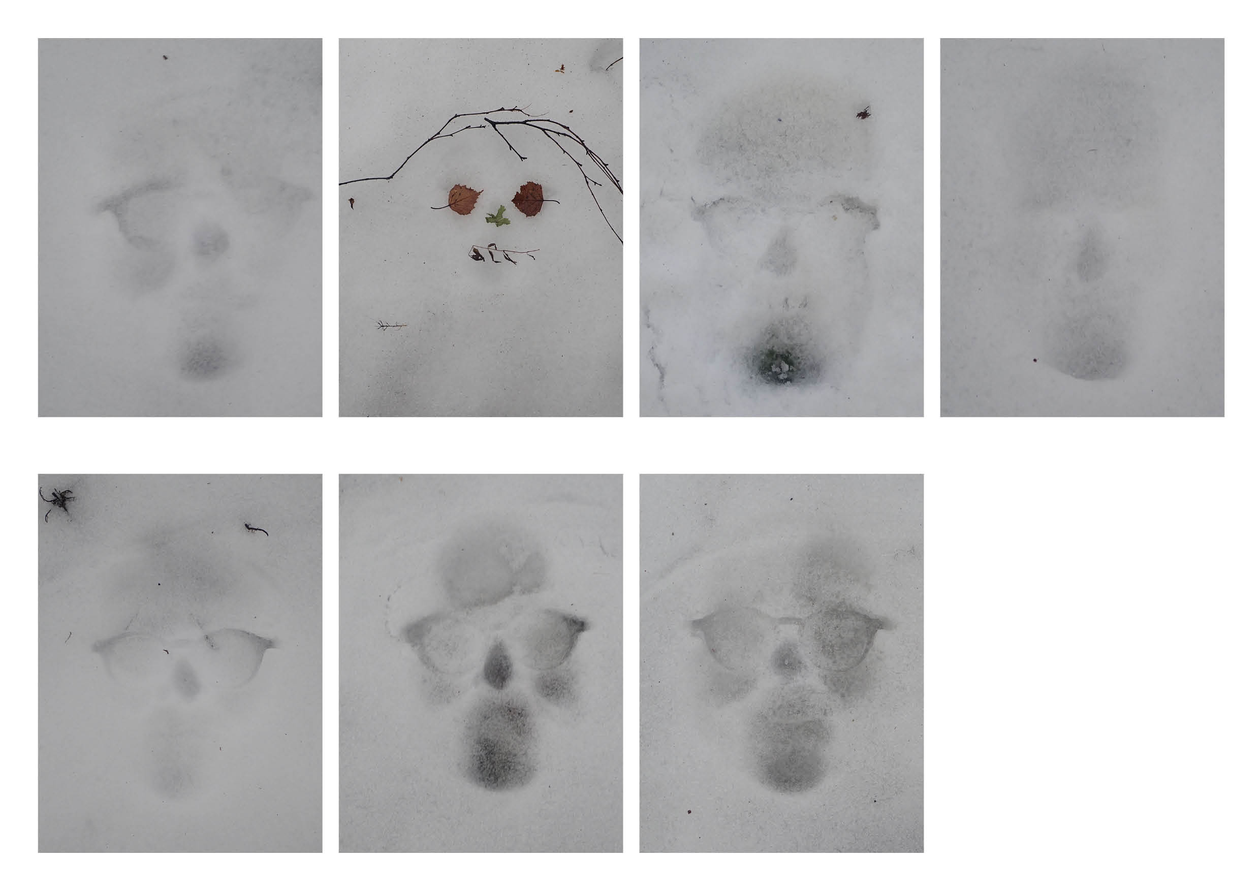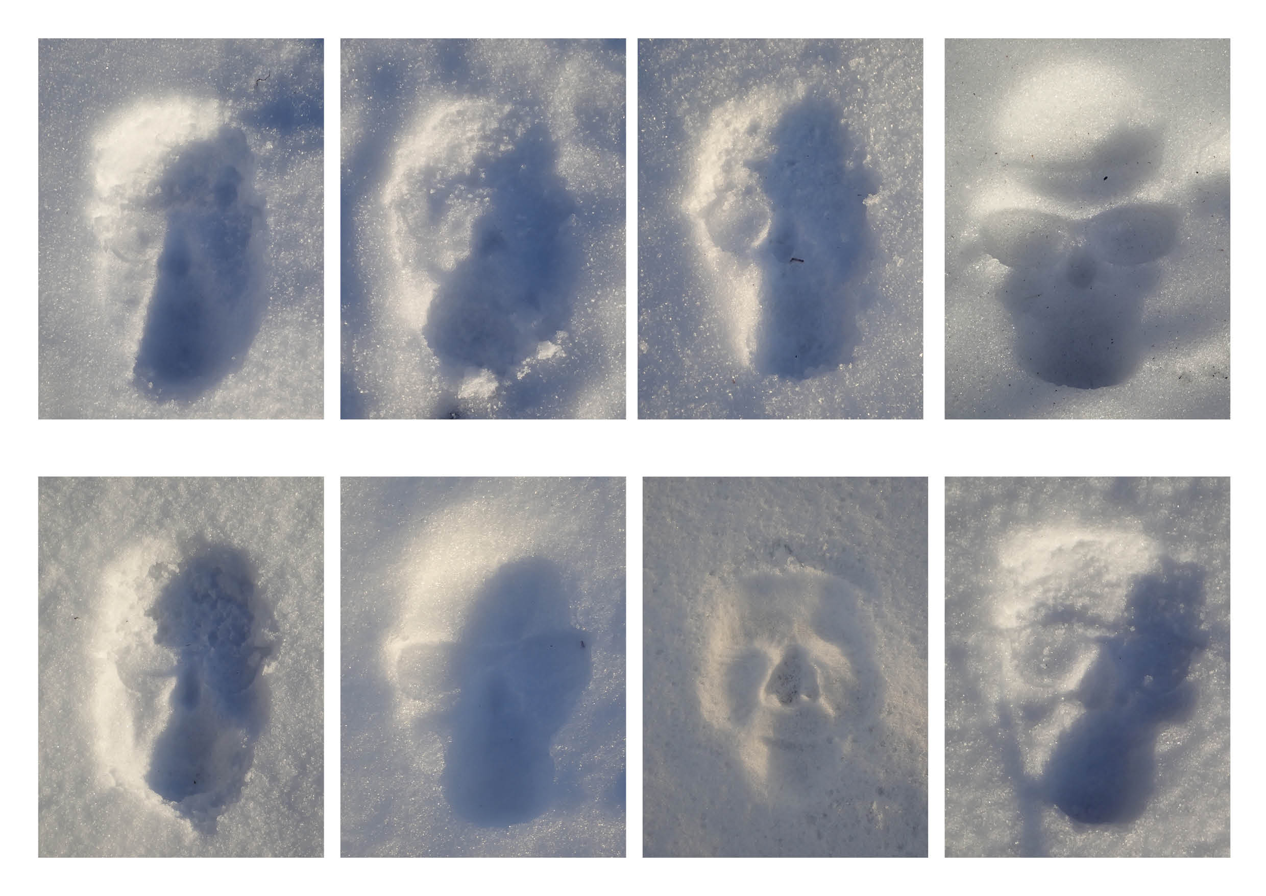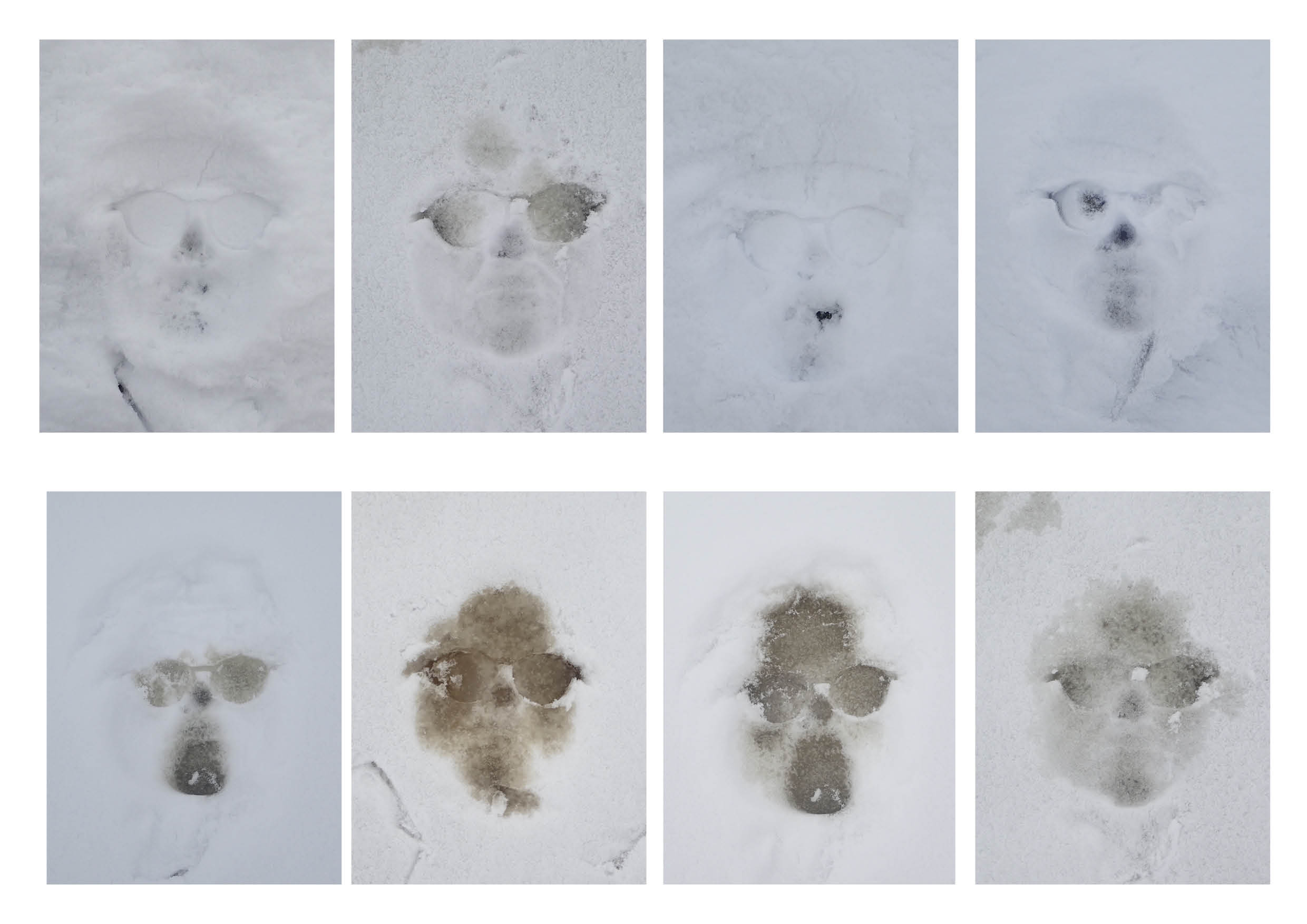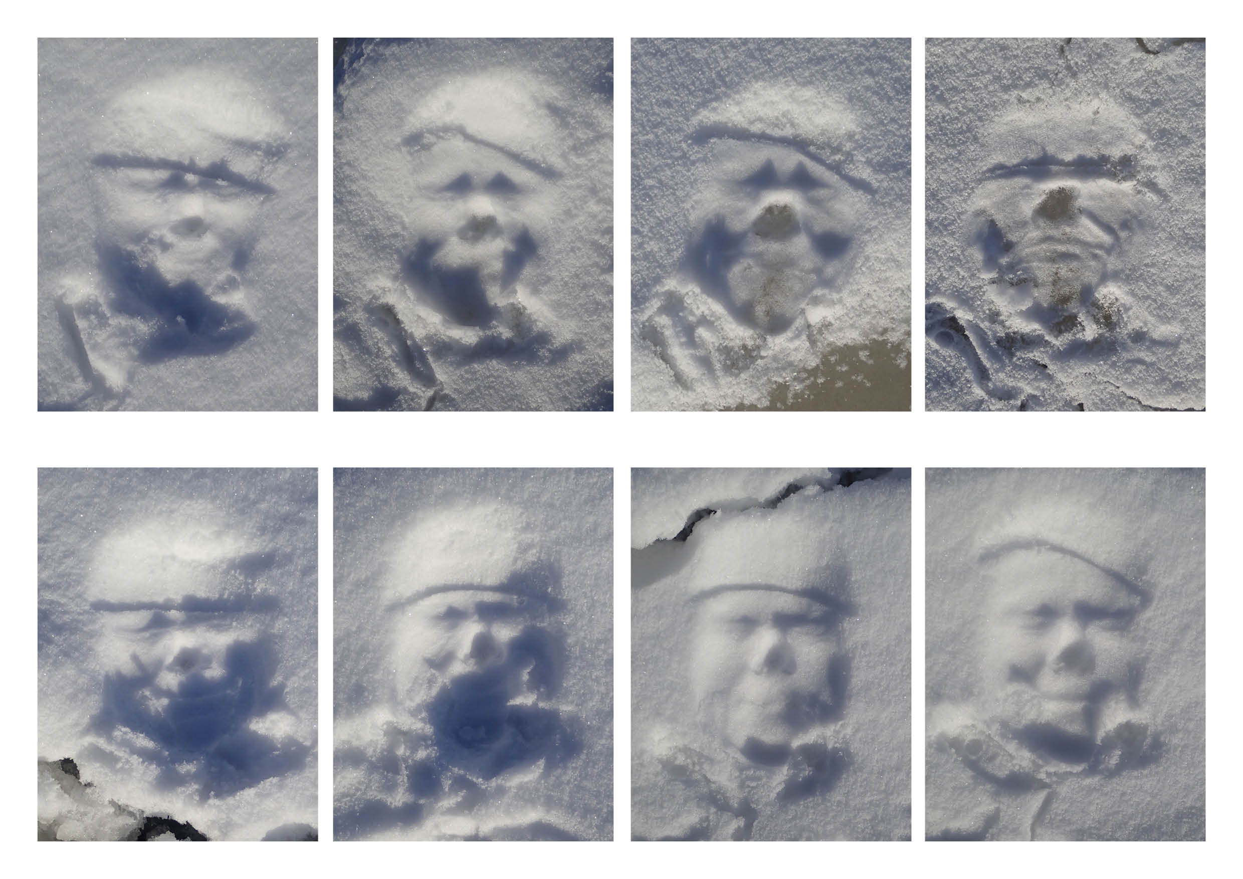 Tuula Närhinen’s recent work-in-progress Self-Portrait in Snow(2025) sets out to explore facial pareidolia, the tendency to see ‘hidden faces’ in the natural world. Snow is harnessed to work as a spiritual medium that provides access to a speculative pictorial heritage. Drawing from 19th century methods of visual empiricism, Närhinen’s playful project revisits anthropometric survey techniques. The work introduces a collection of facial imprints, generated by pressing the visage tightly against snow cover.