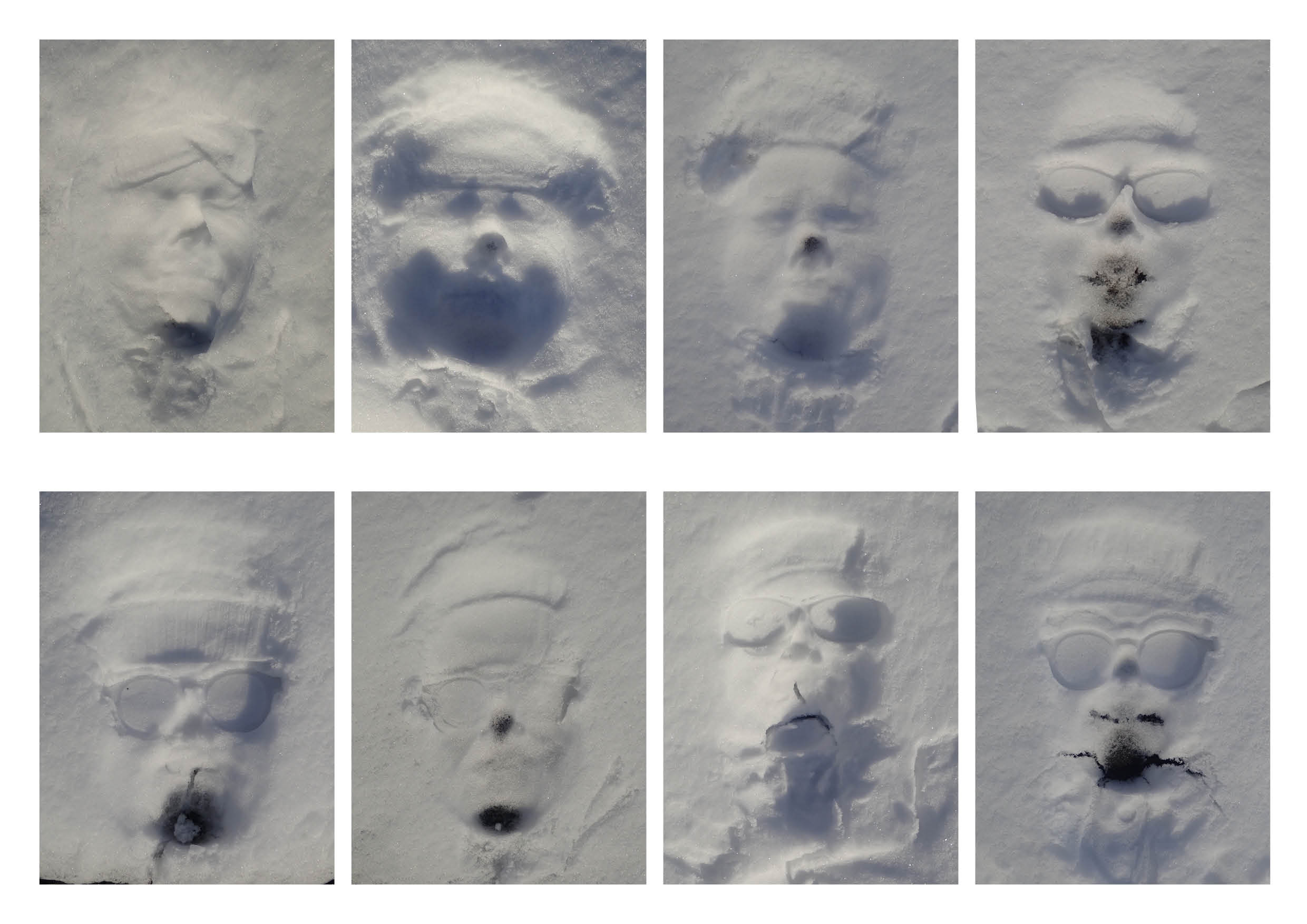 Counterintuitively, instead of auto-portraits, these head dives into snow generated depictions of strangers surfacing from the bosom of the earth. In browsing this ghostly archive, Närhinen was surprised to find the spitting image of her bearded late father and, subsequently, she spotted more vivid likenesses to other family members as well. Starting with the images of her ancestors to portrayals of her unborn children, the speculative record yielded the phenotype of her entire clan.