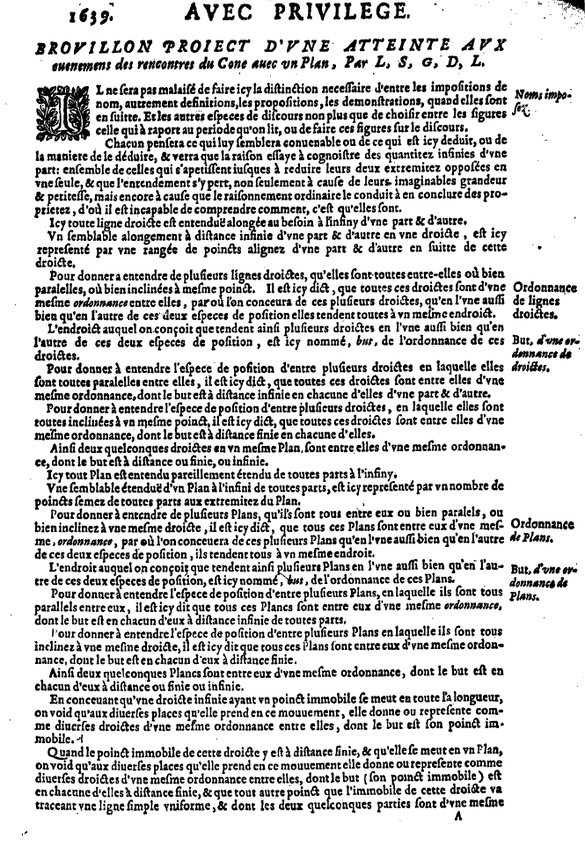 Desargues, Girard (1639), Brouillon :project: projet d'une Atteinte aux :evenemens, événements, des rencontres du cone avec un plan , par L,S,G,D,L.