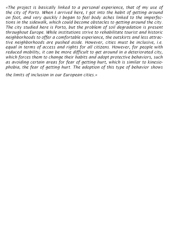 P.A.F. is a project designed to give visibility to road defects that can become obstacles in urban traffic. Taking care of our cities is a real challenge. In Europe, tourist and historic districts are subject to rehabilitation, leaving other areas neglected. Awareness starts with the importance we attach to things. Making things visible is a way of raising awareness. Our cities need to be inclusive, and we need to take care of them in order to take care of our bodies and our uses. The city studied here is Porto (Portugal), but the project is adaptable to a European scale.