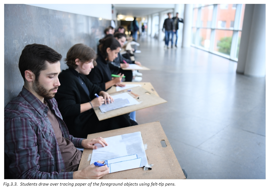 Fig.3.3. Students draw over tracing paper of the foreground objects using felt-tip pens.