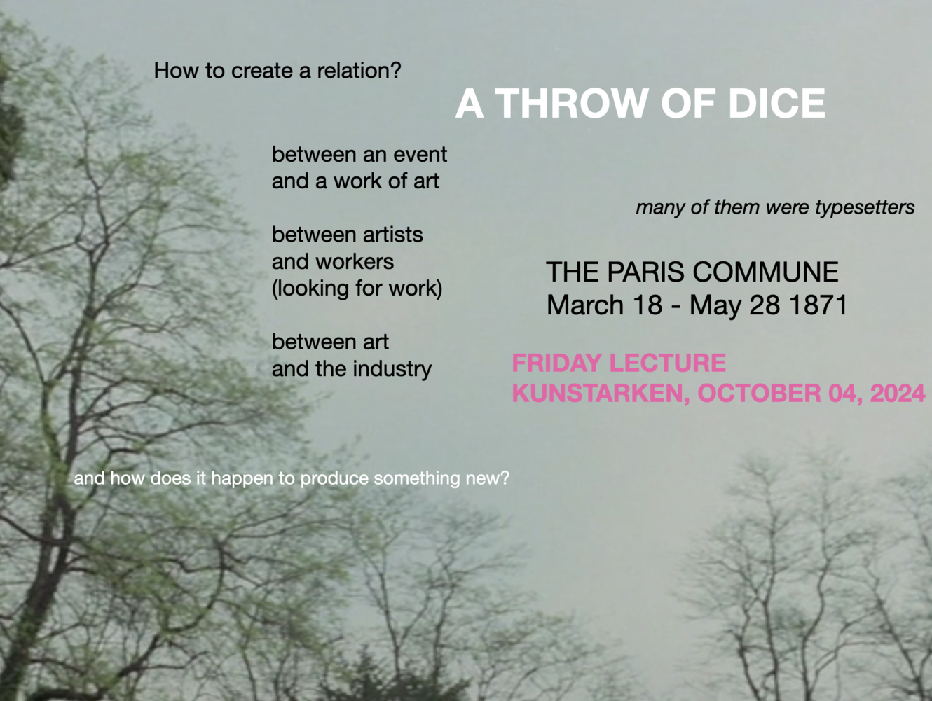 Further Reading Listening, Watching: Every Revolution is a Throw of Dice, by Danièle Huillet and Jean-Marie Straub, 1977. Bookmarking Book Art – “Un Coup de Dés Jamais N’Abolira l’Appropriation.” An Online Exhibition. Anarchist Currents: A Short History of Anarchism, Pëtr Kropotkin: The Commune of Paris, Playing Against Type: What happened when Stéphane Mallarmé reimagined the book, Union des femmes pour la défense de Paris, Manifesto of the Paris Commune’s Federation of Artists, Nikolay Chernyshevsky: Vital Question ... Or what is to be done, Alain Dalotel: The Paris Commune 1871, Gustave Courbet, Realism and the Paris Commune, Bertholt Brecht: The Days of the Commune and The Play, tricontinental: Paris 150 Commune, Blog de Michèle Audin: La Commune de Paris, The Paris Commune: Selection of Books, Peter Lamborn Wilson, Mallarmé: Anarchist