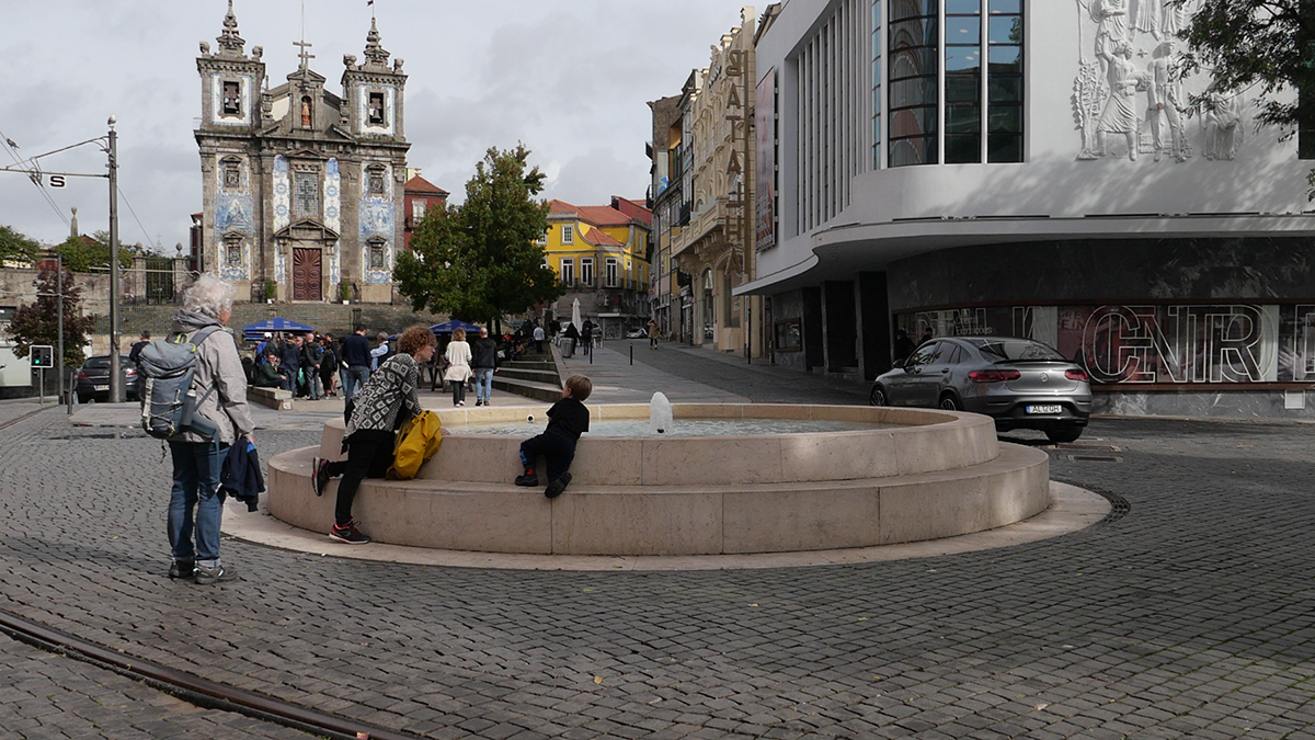 Moving on to the spatial approach, a reflection on urban space as an experience and on the relationship between physical structure and its appropriation emerged. This part of the analysis documented the transformation of space in Praça da Batalha, focusing on the fountain, and highlighted differences between public and private areas, such as the contrast between the street and more cultural spaces, like the cinema. The result was a conceptual video using the idea of a timeline to document the changes around the fountain throughout the day.