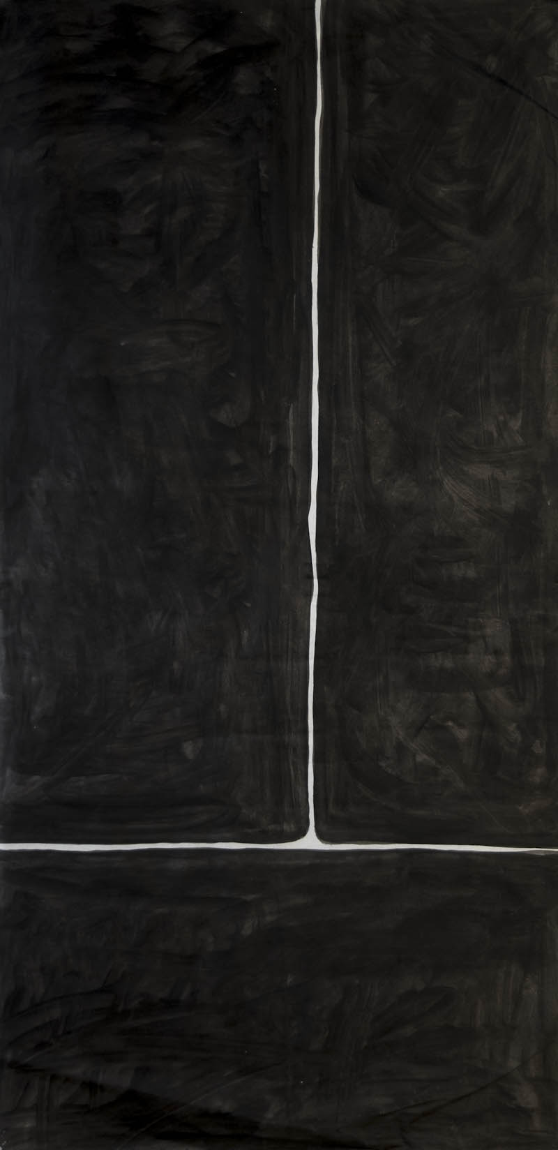 Yesterday I was in the studio for a short while and started a new drawing. It is big, 230 x 145 cm. Unlike the drawings I discussed earlier, I have not started with a clear form, but I sprinkled some charcoal powder on the paper to start with. There is a connection to previous abstract work I made: two blocks (fields) hovering over a third. Just black ink, nothing else. The lines and sides are drawn by hand, which upon closer observation, give the blocks a more organic character (picture 9). I think of some of the works of Brice Marden, for example: “Dark”, 1963. (In: Garrels, 2006: 134) Two dark grey fields, put together. It is the expressive way Marden applied his paint that brings this painting to life.