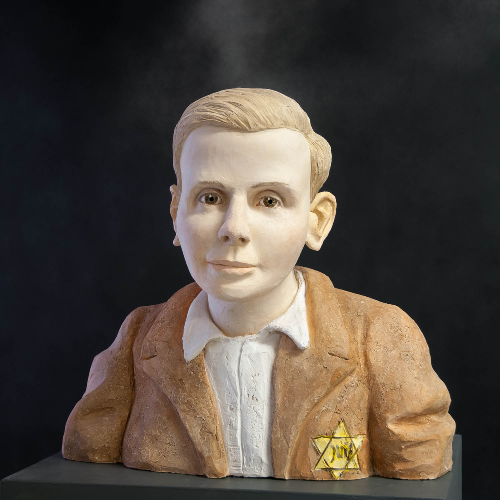 The drawings in this project are entitled “Naive and Sentimental Drawings” after the composition “Naive and Sentimental Music” by the American composer John Adams. (Adams, 1988) Adams based his title on an essay of Friedrich von Schiller, “Über Naive und sentimentalische Dichtung” (Schiller, 1795) in which Schiller describes two types of poets: those “who are not conscious of any rift between themselves and their milieu, or within themselves; and those who are so conscious” (quote of Isaiah Berlin on the website of John Adams). Those who are not conscious are naive, those who are conscious, sentimental. My drawings balance between this conscious and unconscious state of being. sculpture The portraits are done in a plain naturalistic style. They depict ordinary people, in this case children. Over the years I have refined my technique, especially for crafting the eyes, so that looking at these sculptures gives a very life-like experience. I emphasize this experience by painting them with watercolours and presenting them life-size. So a girl of seven years will be met at a height of 123 cm, a boy of 4 at 98 cm. Regarding these sculptures of children can be an ordinary aesthetic experience, with regards to expression and technique, except the emotional content is concealed. Once the title of the sculpture is read, there is no escape: these are not ordinary children, but children abducted from their parents, from society, and indiscriminately put to death. The title is essential: “Jacques Wisznia was born on October 15, 1937, in Paris, where he lived at 108 rue de la Folie-Mericourt (11th arr.). He was deported to Auschwitz on February 9, 1943, on convoy 46.” (Klarsfeld, 1996: 1361) This is as dry and descriptive as the portrait itself (picture 13).