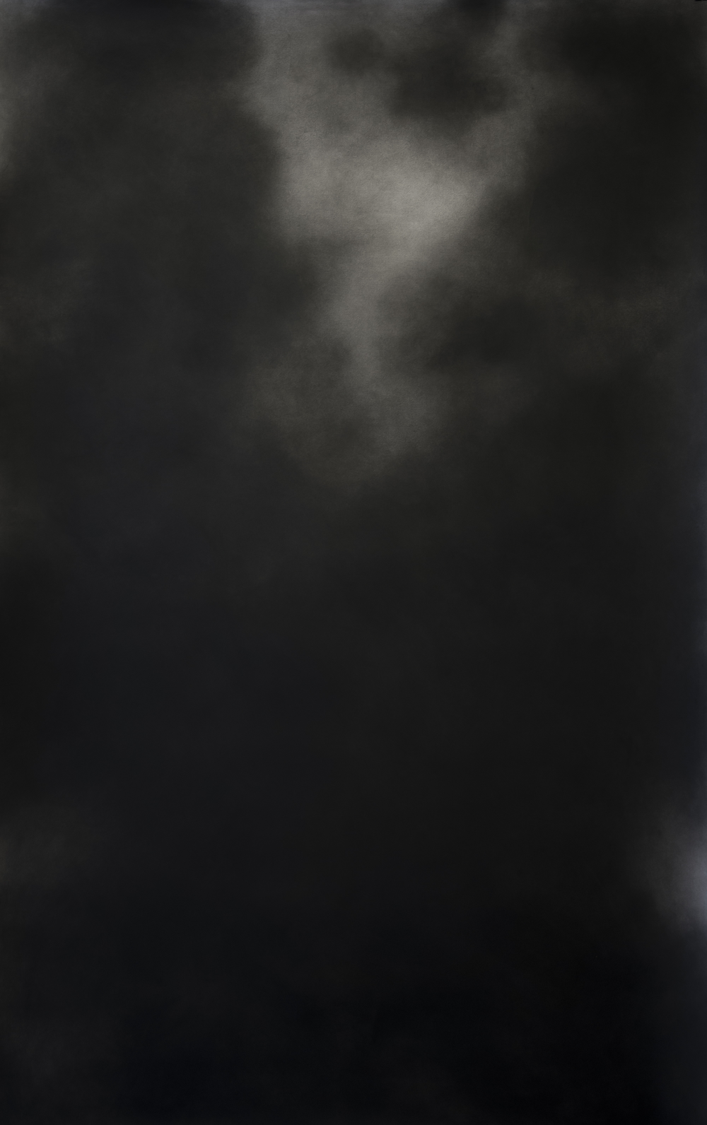 The black space holds clouds, enclosed. They are in direct contrast with the very dense black space/form around, which has become a container. The clouds meet the dense surface, precipitate, sublimate.