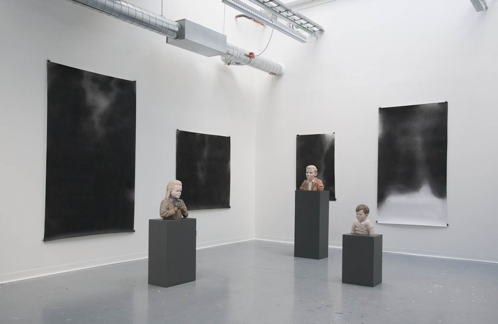 I have recently returned to drawing again after a fifteen-year period of neglect. I was looking for a way to open up my process, since I had the feeling that I started to reiterate myself in my sculpture. My drawings hold a position of absolute contrast to my sculpture. They are non-figurative, black and white, and flat. There is no direct formal relationship between my sculptures and drawings. Different to my sculpture, where I try to get as close as I can to the person I depict, I simply start with a piece of paper on which I scatter some charcoal powder. The outcome is highly coincidental and I work until I am intuitively pleased with the result.