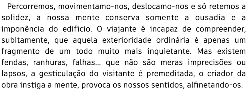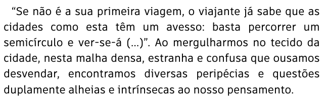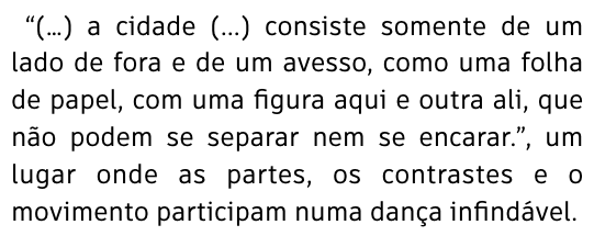 "(...) a cidade (...) consiste somente de um lado de fora e de um avesso, como uma folha de papel, com uma figura aqui e outra ali, que não podem se separar nem se encarar", um lugar onde as partes, os contrastes e o movimento participam numa dança infindável. E é a busca pela compreensão da linha ténue entre o sim e o não, o claro e o escuro, o tudo e o nada, que dá nome ao nosso trabalho, Oppositions. “(…) the city (…) consists only of an outside and a reverse, like a sheet of paper, with a figure here and there, which cannot be separated nor face each other.”, a place where the parts, contrasts and movement participate in an endless dance. And it is the search for understanding the fine line between yes and no, light and dark, everything and nothing, that gives name to our work, Oppositions.