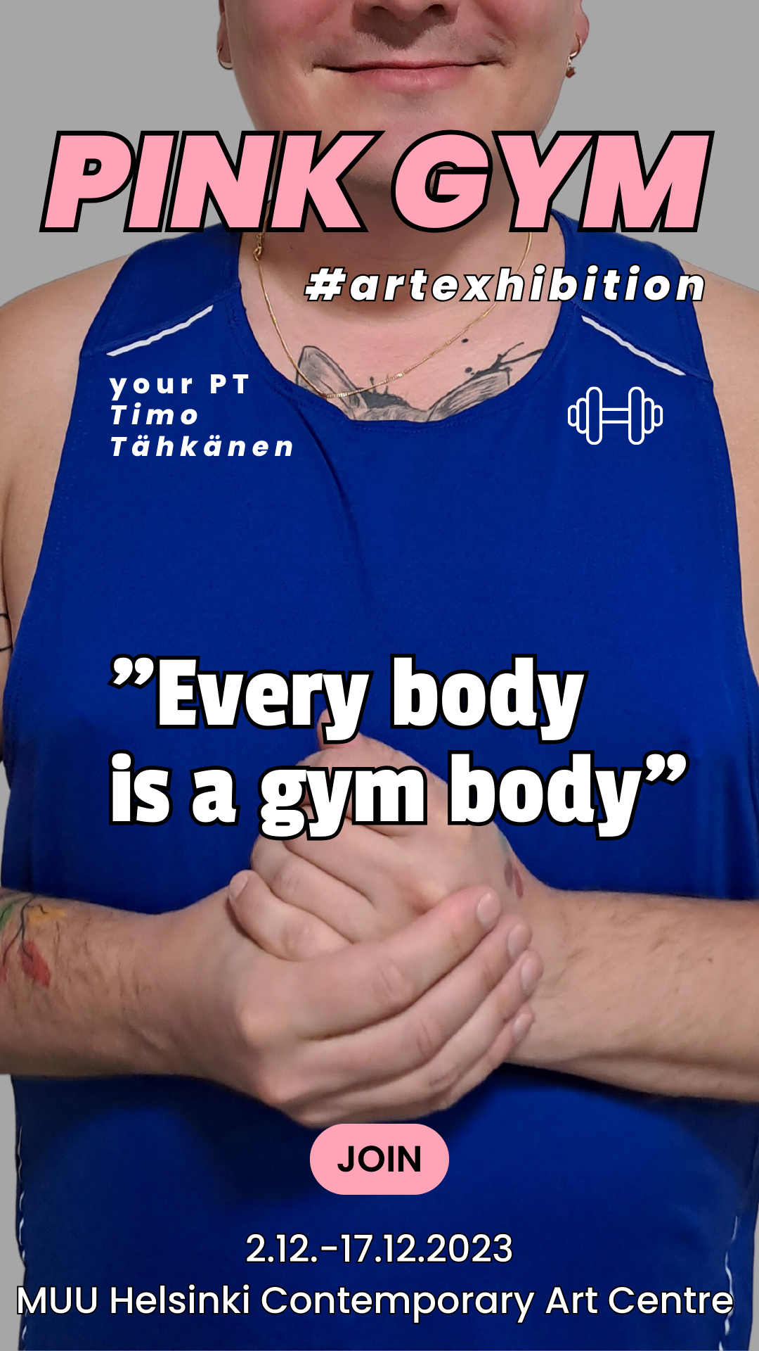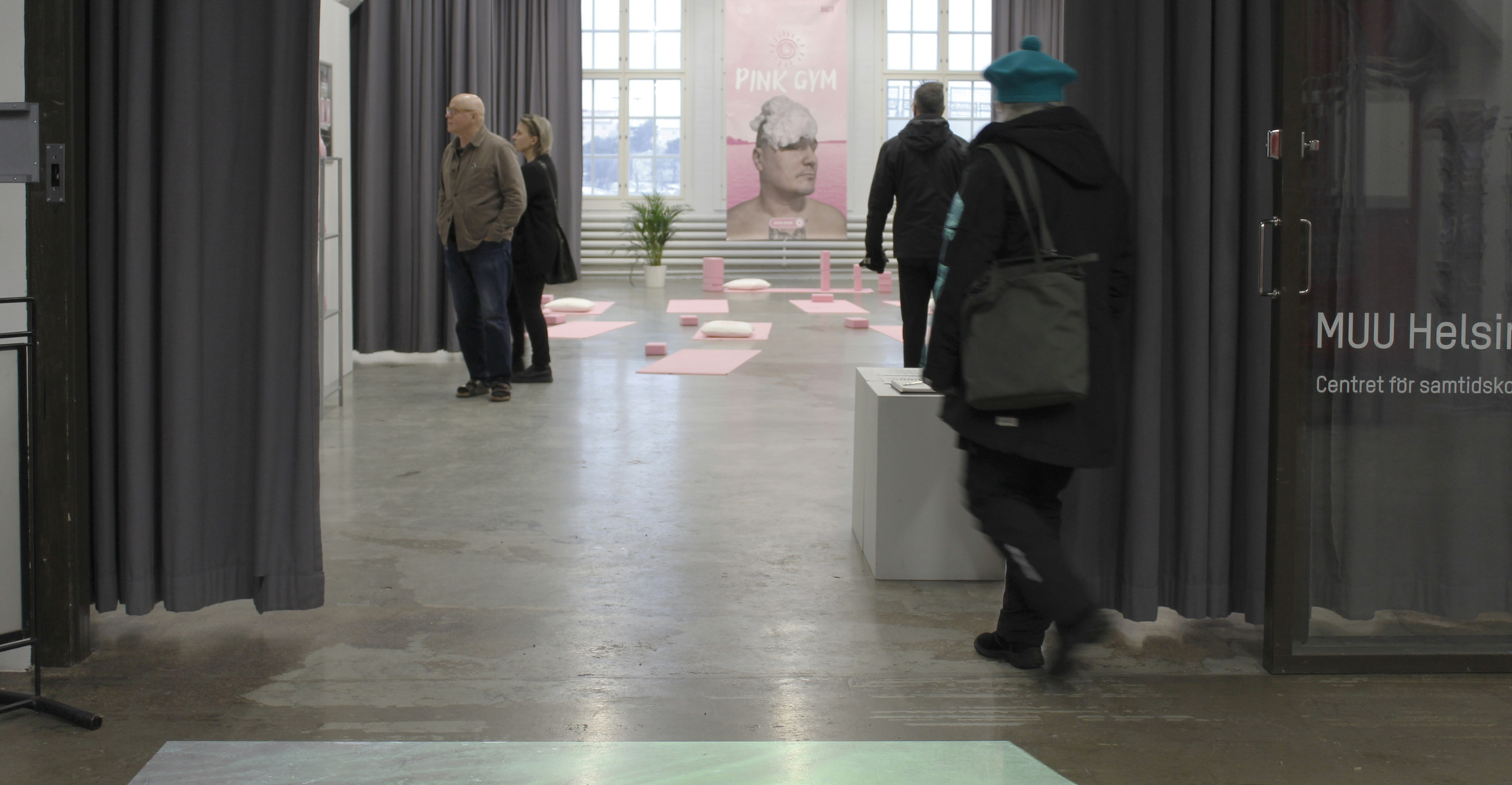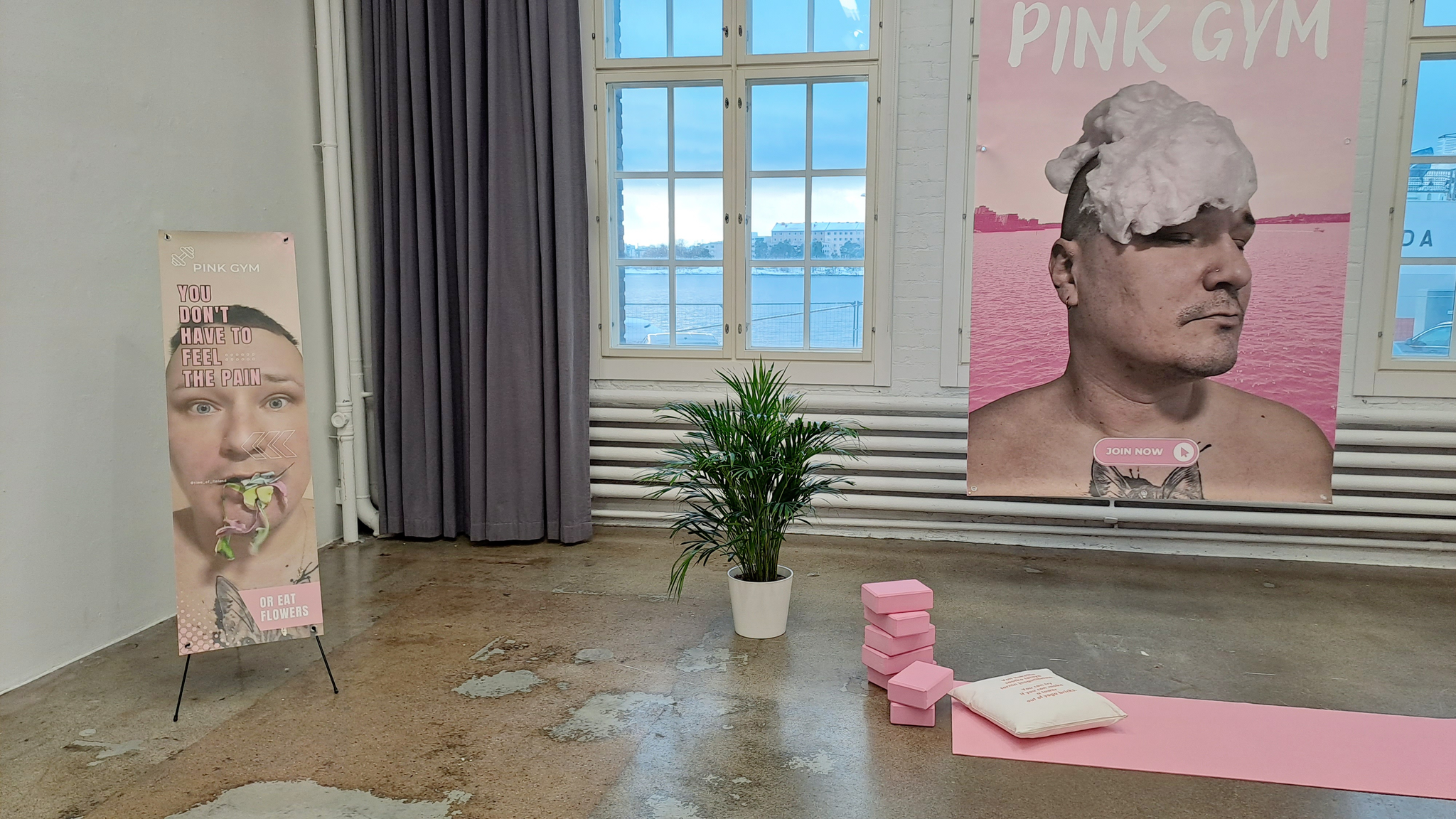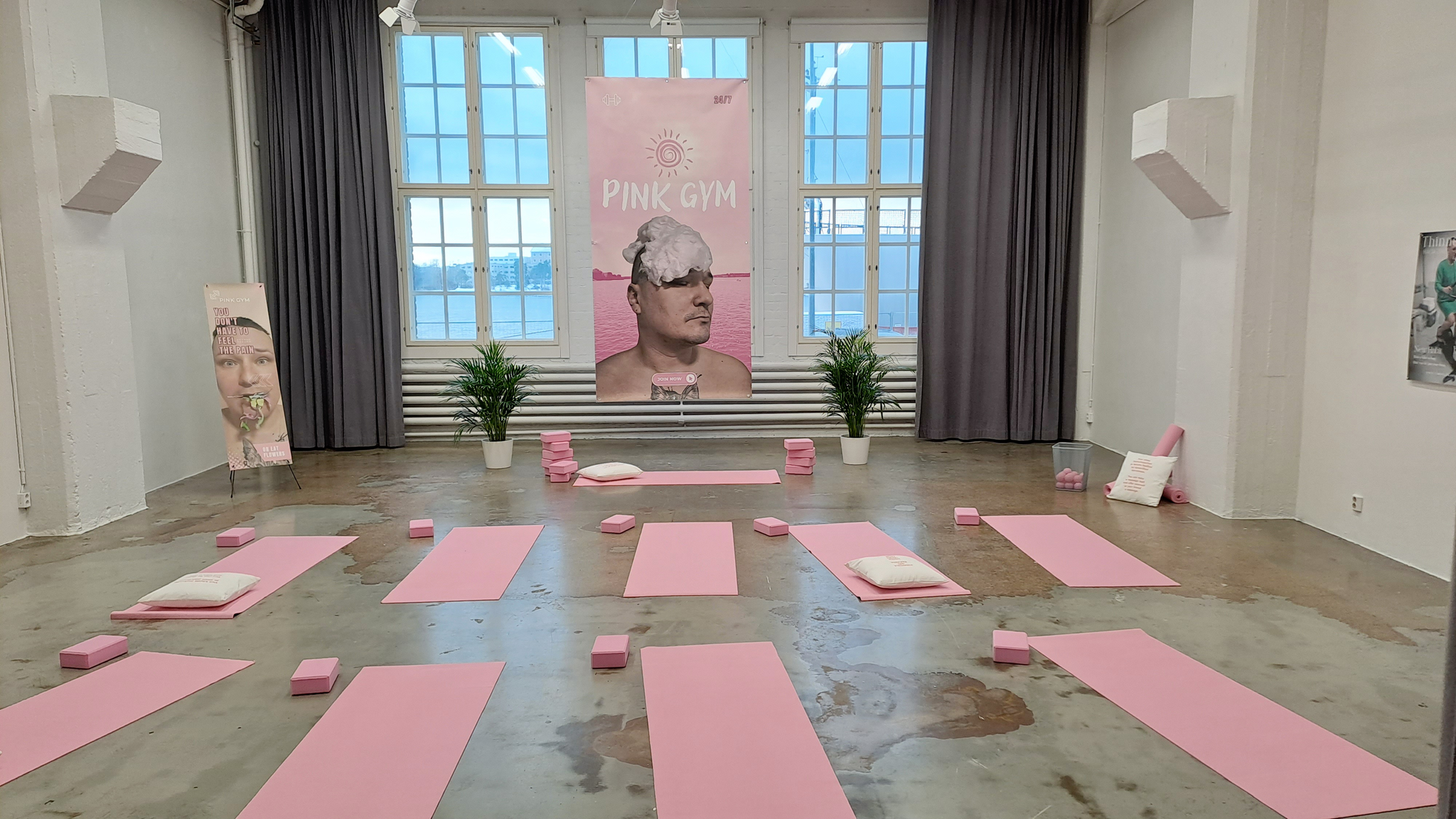 The Pink Gym exhibition is based on the questions: What kind of bodies are welcome in the gyms? Is it okay to be loved and accepted as you are in the gym? What is the ideal body and what are the means to achieve it? Could training be thought of as care?