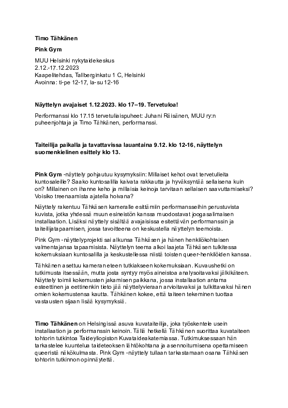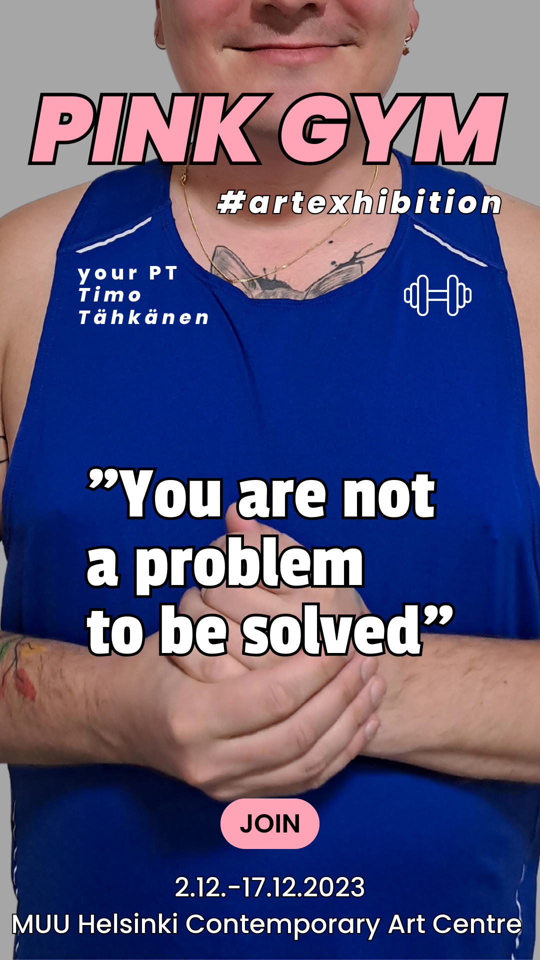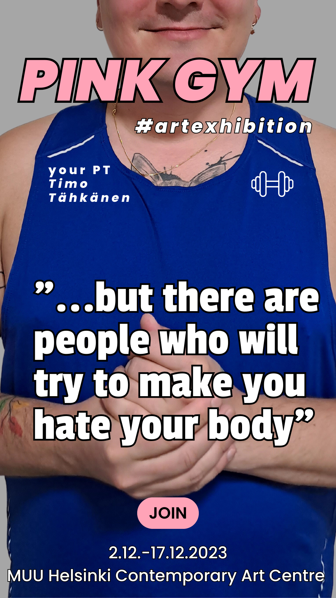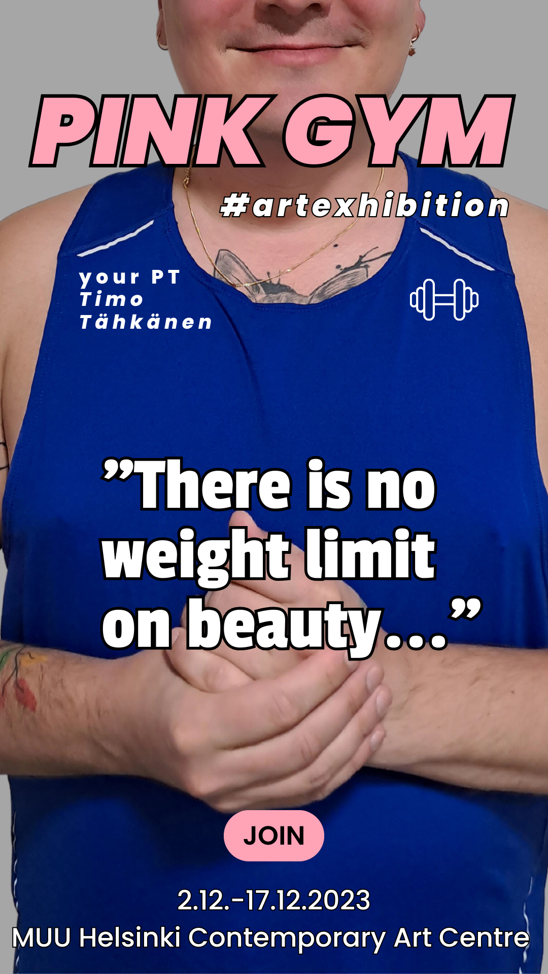 The Pink Gym exhibition is based on the questions: What kind of bodies are welcome in the gyms? Is it okay to be loved and accepted as you are in the gym? What is the ideal body and what are the means to achieve it? Could training be thought of as care?