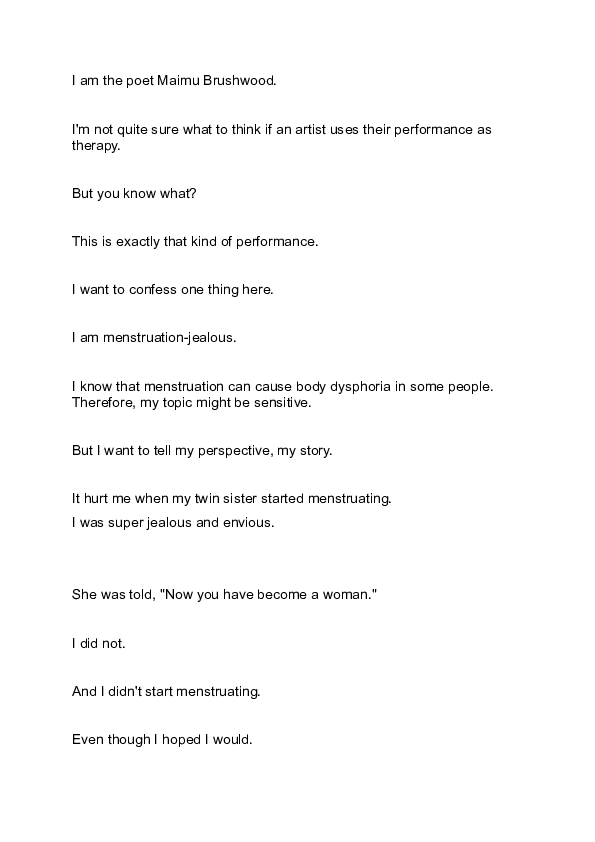 Maimu Brushwood is my poem, speech and story writing drag alter ego that was born 2016. (Pronouns she, her / they, them)