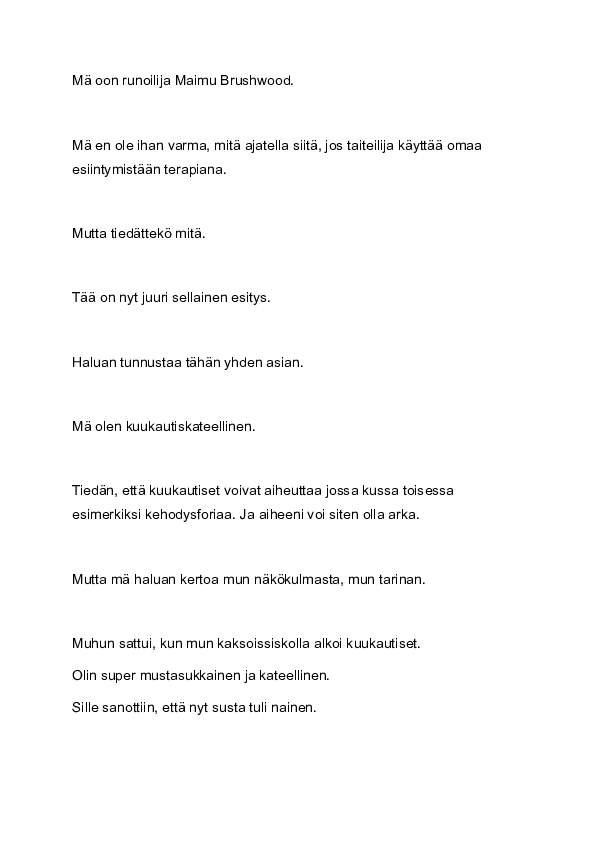 Maimu’s writings often reflect love, identity, growing pains – both in growing up in the shadows of norms as well as the painfulness of growing in weight. Maimu’s life experience can be detected in her poems. Despite her tragic experiences Maimu still wants to believe in a better tomorrow, and in peace and love. She´s a softly anarchist person and she wants to make the world a better place.