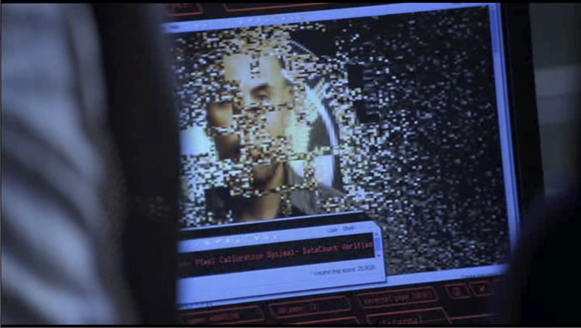 In this context, the sound effects of the dynamic CSI-shot are not added for verisimilitude, rather the opposite. In the FUI, we see more science fiction than science, so the screens in these narratives show us what cannot be done by computers in reality, but only in fiction. That is, the FUI offers what it cannot provide. It enables us to see that the very activity that embedded screens purportedly enable — seeing the imperceptible — is precisely what the medium is unable to do. That is, TV shows with extreme degrees of embedded screens attempt to distract the viewer from the thing they cannot do by seeming to achieve it. The noise of the FUI distracts us from the mundane reality that forensic and other scientific processes on computers take time, that they often produce no valid results, and that results are not usually rendered in immediately readable visualizations. The noise is both noisy and informational, therefore, so it distracts us from the implausibility of the computer’s work with implausible signals. The signal-to-noise ratio is both high and low at the same time.