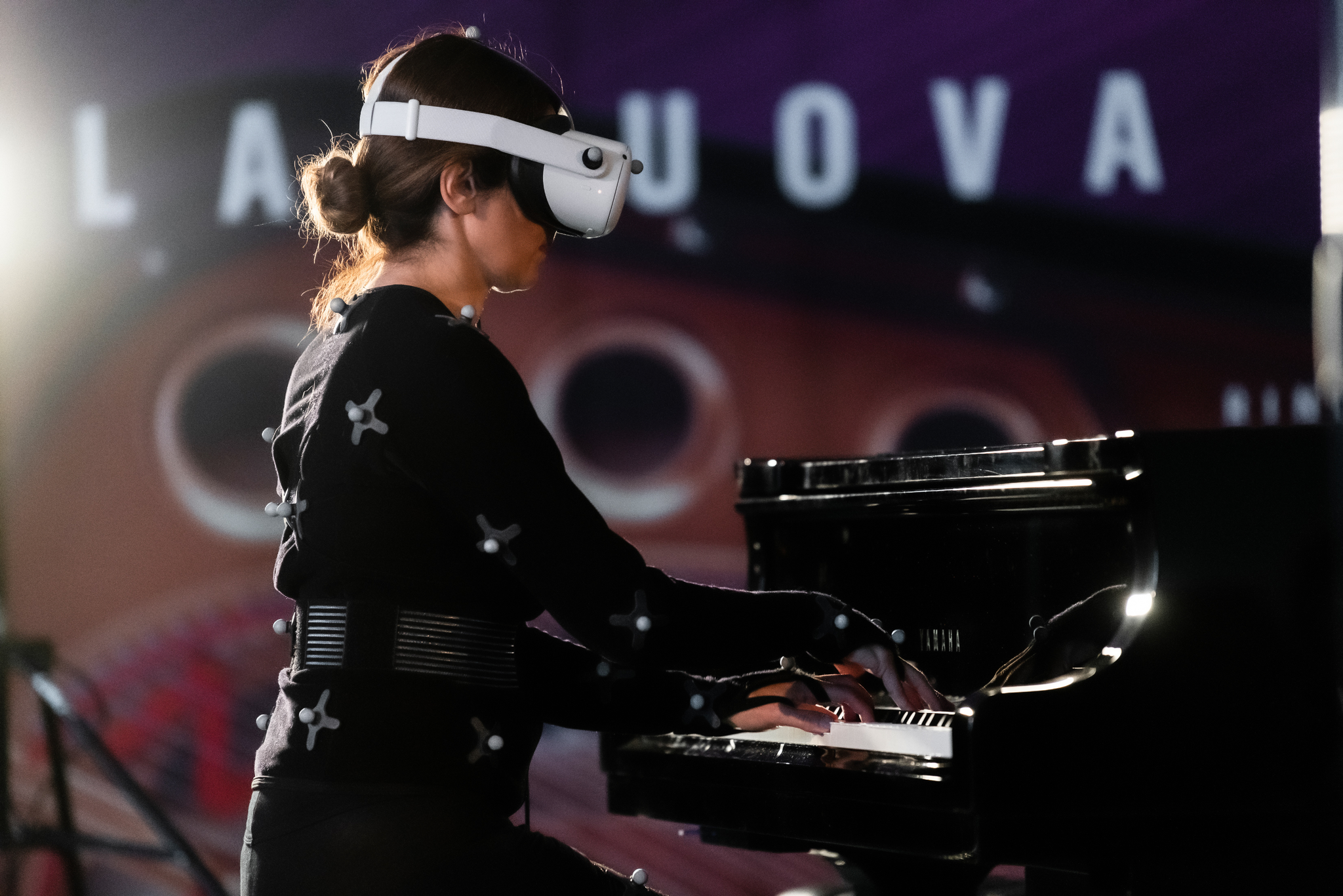 While playing in the virtual environment, I experienced the adaptation of my proprioception in relation to an unconventional performance scene and a phygital condition. The connection with the physical world was always very present due to my contact with the real piano keyboard and the awareness of an audience in presence, but the general sensation was to play 'like in the water', immersed in the new flow of the virtual horizon. Looking at my embodied avatar after my motion recording, I noticed, for example, the necessity to remodulate some movements of my body to obtain a more explicit choreography. To facilitate the real-time interaction with my avatar in performance, I decided to emphasise the movements of my head nod, with respect to my solo practice in a real condition (Filippelli 2025: 298-299). However, the expedient of 'augmented' expressions is often applied in real chamber music performances to find a better connection (Bishop & Goebl 2017).