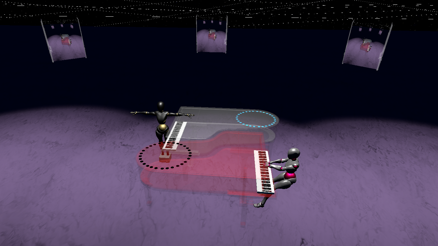 Concerning the visual rendering, I chose how to built the visual space by following my tastes. In accordance with LWT3 team, my aesthetics were more oriented to be linked to Reich's music and avoid gaming representations. Fresh and warm colours of a minimal ambience were chosen and, for the same reason, the animation of the virtual pianists was reduced to a minimum resembling semi-abstract sculptures rather than cartoon figures. In the virtual stage, a micro-constellation of two particles systems were generated by the audio signal on the basis of the dynamics: one by the recorded audio track of the first virtual performer and one by the real-time audio track of me playing as a second performer.