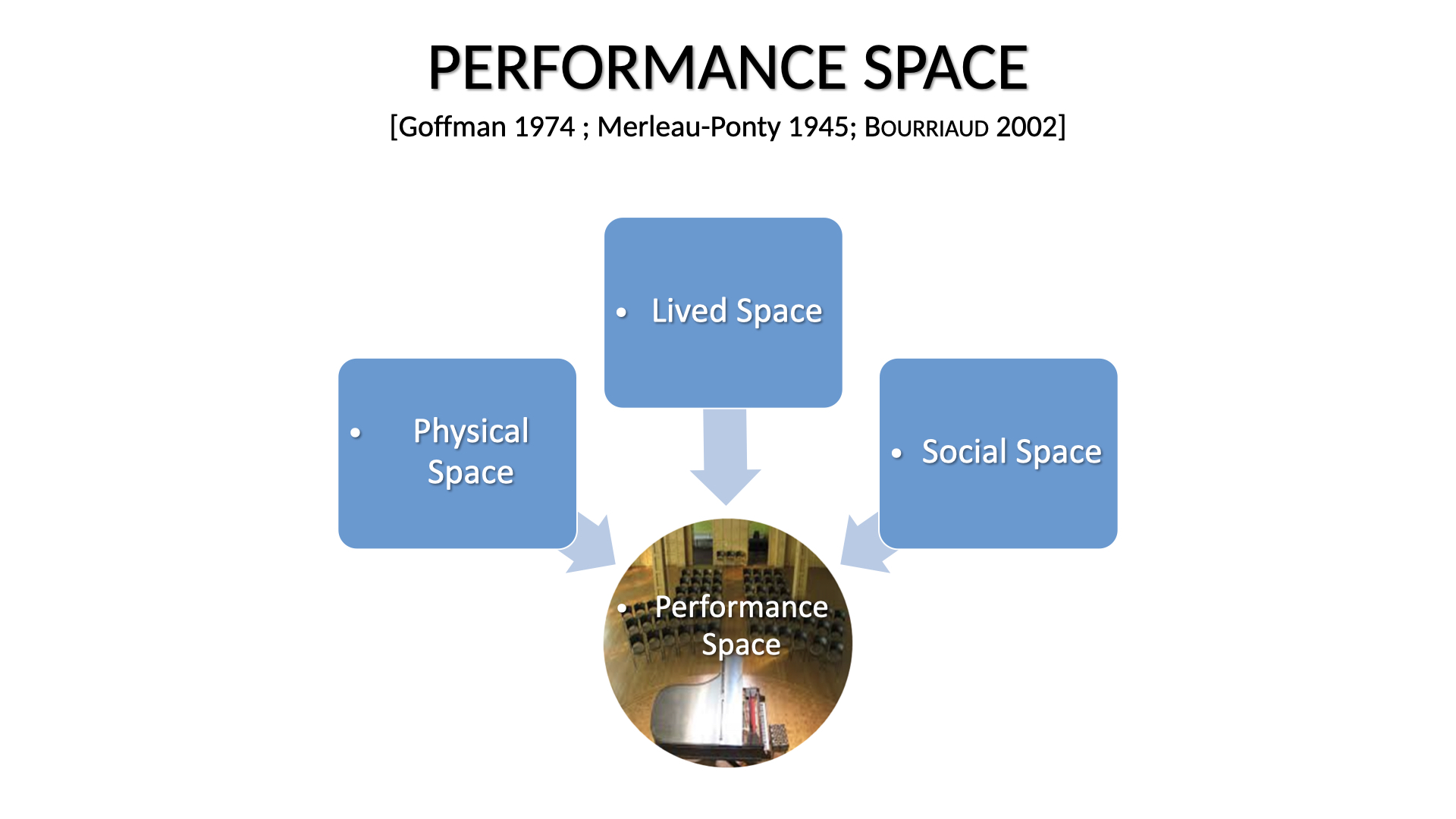 This scheme summarises how a social frame determines the identity of a performance space, the nature and purpose of spectators' behaviours, and how they should be interpreted. The space where a performance is executed implies different modalities of perception both by the performers, who are the 'actors', and by the spectators, who are not passive recipients (Goffman 1974; Bourriaud 1998. From these perspectives, the performance space entails three different dimensions: