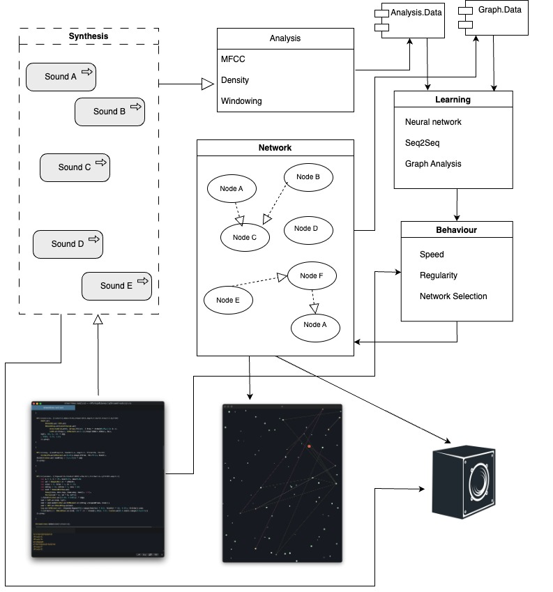 This project and the explored threads all feature a set of components that contribute to a collective whole. The starting point is usually digital sound synthesis. It is followed by sound analysis and windowing of that information. Analysis data is then gathered, stored, processed and submitted to a learning algorithm. Once a model has been trained, it is used in a performative mode that involves providing input, receiving output and interpreting it via compositional algorithms. The collective whole also features visual representations of the process, interfaces and post-processing of sound.