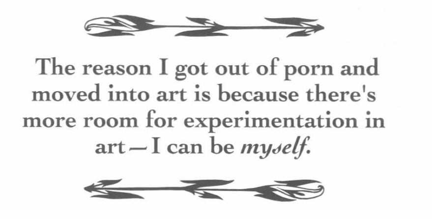 Right now, I am interested in porn—post-porn, feminist porn, other kinds of porn and did a lot of research. Like in RE:SEARCH, I found Annie Sprinkle, the post-porn modernist. But Music is equally important for this, and especially the rap artist Cardi B...