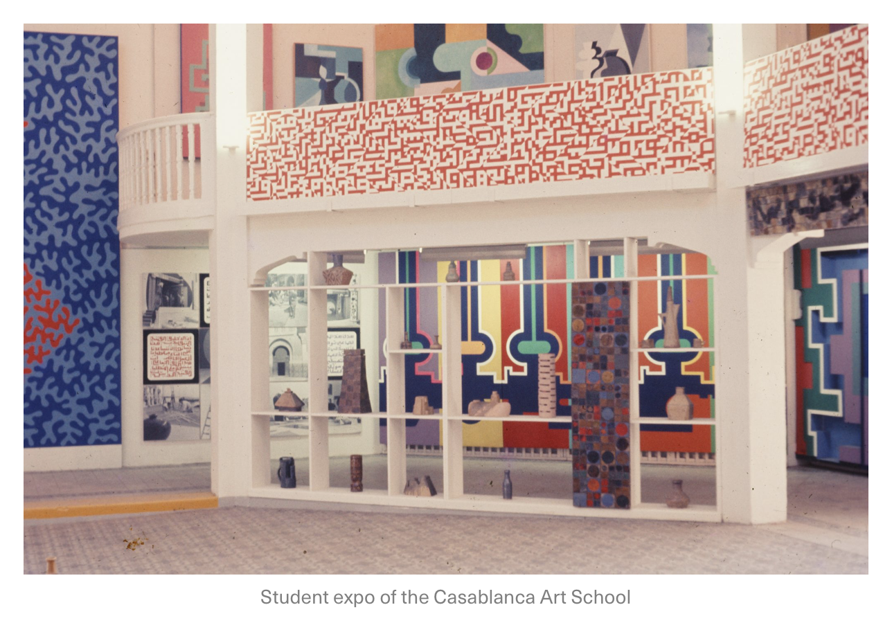 In the French Protectorate of Morocco (1912-–56), Moroccan craft guilds were industrialised and controlled by the administration but were physically separated into walled medinas and culturally segregated, seen as inferior to the European paradigms of art – the likes of Eugene Delacroix, Henri Matisse and Paul Klee, who all visited Morocco in the nineteenth and twentieth centuries. Morocco’s modern visual art scene evolved in tandem with this postcolonial period of flux, grappling with the nation’s new political identity while making sense of the recent legacy of the French-influenced arts education. At the same time, Morocco’s prominent cities continued to be cosmopolitan, international meeting points that attracted artists from all over the world – and who inevitably formed relationships with local artists. At this charged moment in time, the Casablanca Art School emerged as a site for experimentation, political discussion and exuberant exchange – initiating a major shift in the development of Moroccan Modernism away from the European hierarchical view of the country’s art.