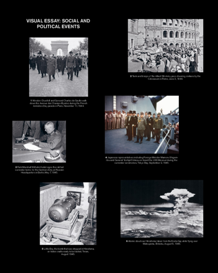 "World War II was in fact several wars, fought across continents and among countries and territories, among ideological and political beliefs. The war stamped multiple enduring images on the global imagination. The extent of the horrors came into focus slowly, with photographs, films, and writings documenting the cities, towns, and countryside in ruin and desolation, the grotesque concentration camps, the industrial-scale annihilation of the Holocaust, and finally the cataclysmic devastation of the atom bombs that vaporized Hiroshima and Nagasaki. The growing awareness of what had happened introduced the sense of a new possibility: that humanity possessed the capability literally to destroy itself. With tens of millions dead and many more millions left homeless, displaced, and stateless, the aftermath of World War II demonstrated the crisis of humankind in extremis.