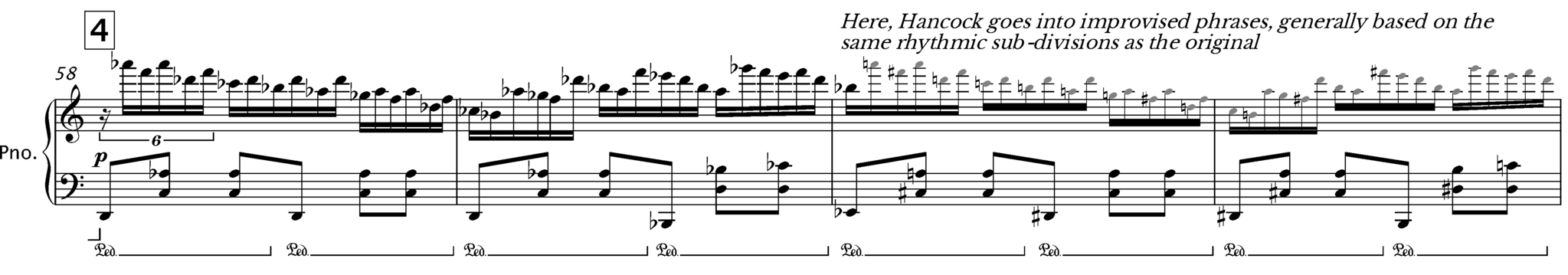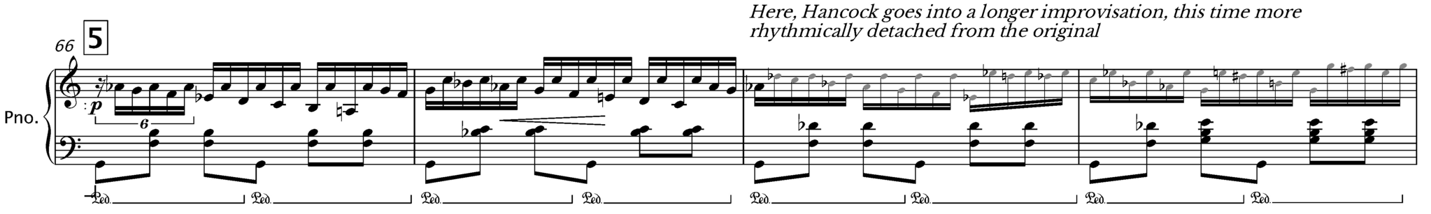 One thing that stands out from this recording is that everything besides the piano is preserved from the original, i.e., all the parts played by the orchestra are intact. In the beginning, the piano plays a free interpretation of the original introduction, with Hancock's characteristic touch and signature chord voicings interspersed with Ravel's melody lines, before landing in the tremolo from the original that brings in the orchestra. When the piano returns (at 3:39), Hancock stays close to Ravel's written piano part for approx. a minute. Then, at 4:39, Hancock takes Ravel’s written figurations as a starting point, holding onto Ravel's lines for two measures before going into improvisation.
