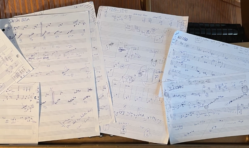 The duo describes an imaginary axis going from interpretation, which is fairly close to the original, over to something that resembles composing, where the contour of the music is still intact, the main outline of the story. An example of sketches are presented below: