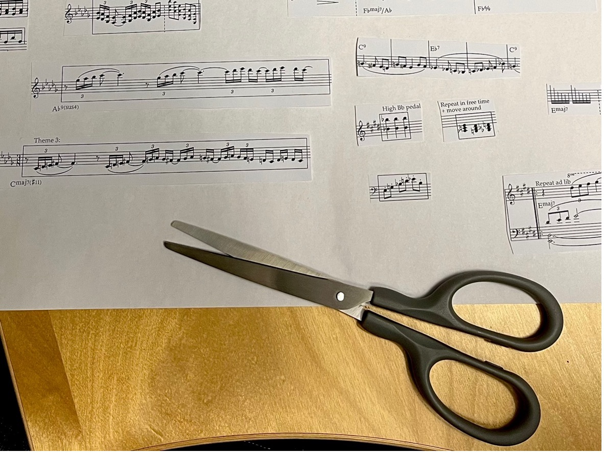 Besides wanting to break free from the chronology of traditional scores, I also wanted to create more space for the improvisers by minimizing the amount of notated material. This led me to focus even more on the main themes and building blocks. Instead of creating a new score in the computer, I realized that all the material was already there, in the sketch score from earlier, if I could prioritize certain elements. So, I physically cut the score into pieces, with a pair of scissors: