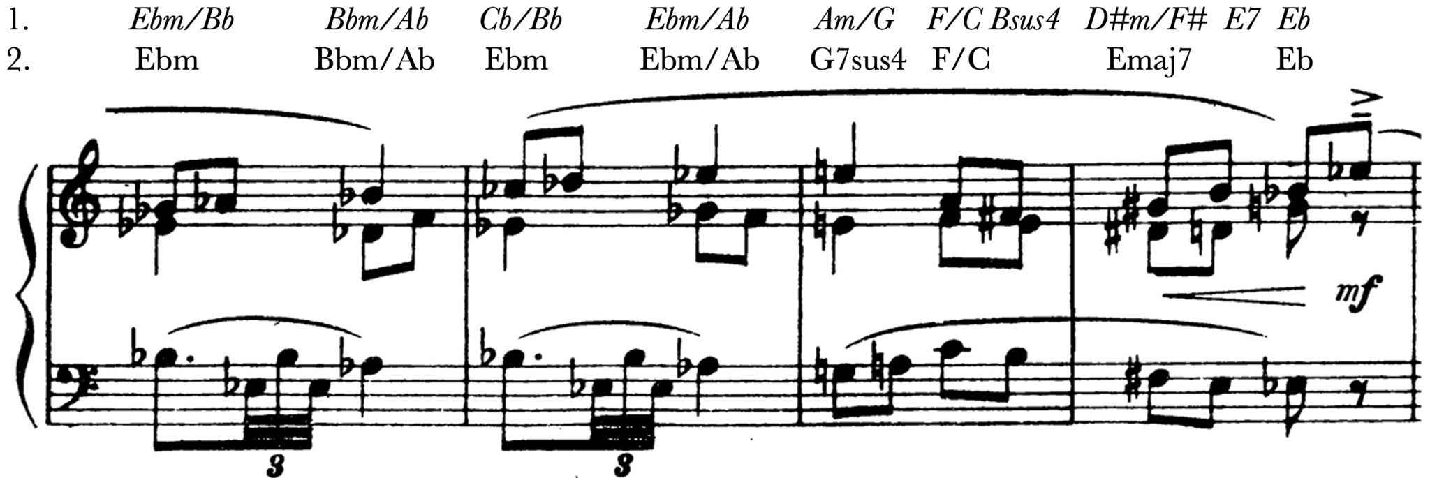 Although the aid of chord analysis in this case helped to give us a way in to improvising over the music, it can be pointed out that the character is somewhat different to Hindemith's original. This may relate to this way of interpreting the chords, as it makes the harmony sound more functional. The harmonization with a major third (G) in the bass in the first two bars might contribute to this, which reflects how I initially heard this passage, as a result of the pitch G appearing in the third measure. But it doesn't create the same ambiguity that is there in the original, which is a general challenge with using chord analysis.