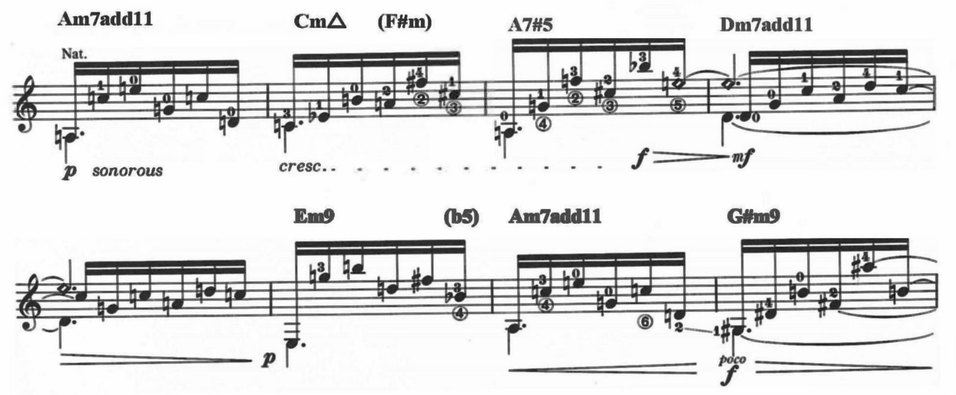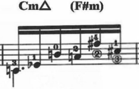 Thus, three different interpretations could provide departure points for the same sonority – Bb melodic minor, Gb melodic minor, and D melodic minor – which is not unusual with sounds that are based on symmetrical structures, such as augmented triads.