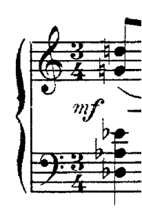 Several pieces in the repertoire had sonorities that could be analyzed as “polychords”– i.e. the combination of chords where one triad/tetrad is superimposed over another – such as seen in the example below: