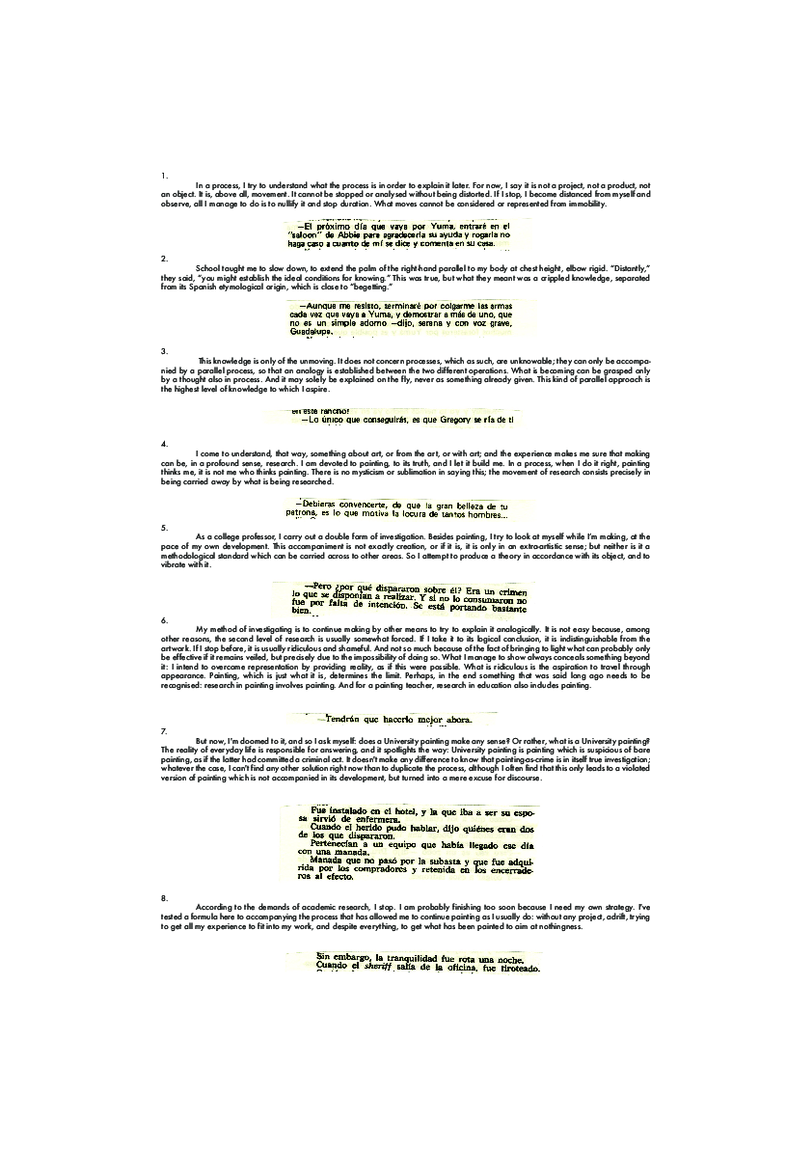 From the conviction that artistic practise is, in a deep sense, investigation, this exhibition is about its relationship to teaching. It is about the search for a balanced way to articulate the discursive and the material; it is about making art while speaking or writing about it without renderning it banal or attempting to exhaust the meaning of producing and what is produced; without intending to justify it solely through the ineffable nature of the material. As a possible means of resolving this, I propose transduction as a methodological resource for making the passage from the studio into the classroom a natural, effective movement. Transduction is then seen as an exemplary resource for supporting artistic discovery without the need to analyse or explain it while making full use of it. The most important contribution of this exhibition is that here, transduction is not seen merely as an object for speculation and analysis, but as the way in which the exhibition has grown and taken shape. These texts were written while the paintings were being made and the exhibition environment designed, in different styles (summary, theoretical reflection, manifesto). The relationship between text and image is not exactly the habitual relationship between work and its representation, but is constructive and structural in the sense that I have attempted to form the exhibition as a work in itself. I consider this exhibition to be of interest to anyone preoccupied with art education as a practice.