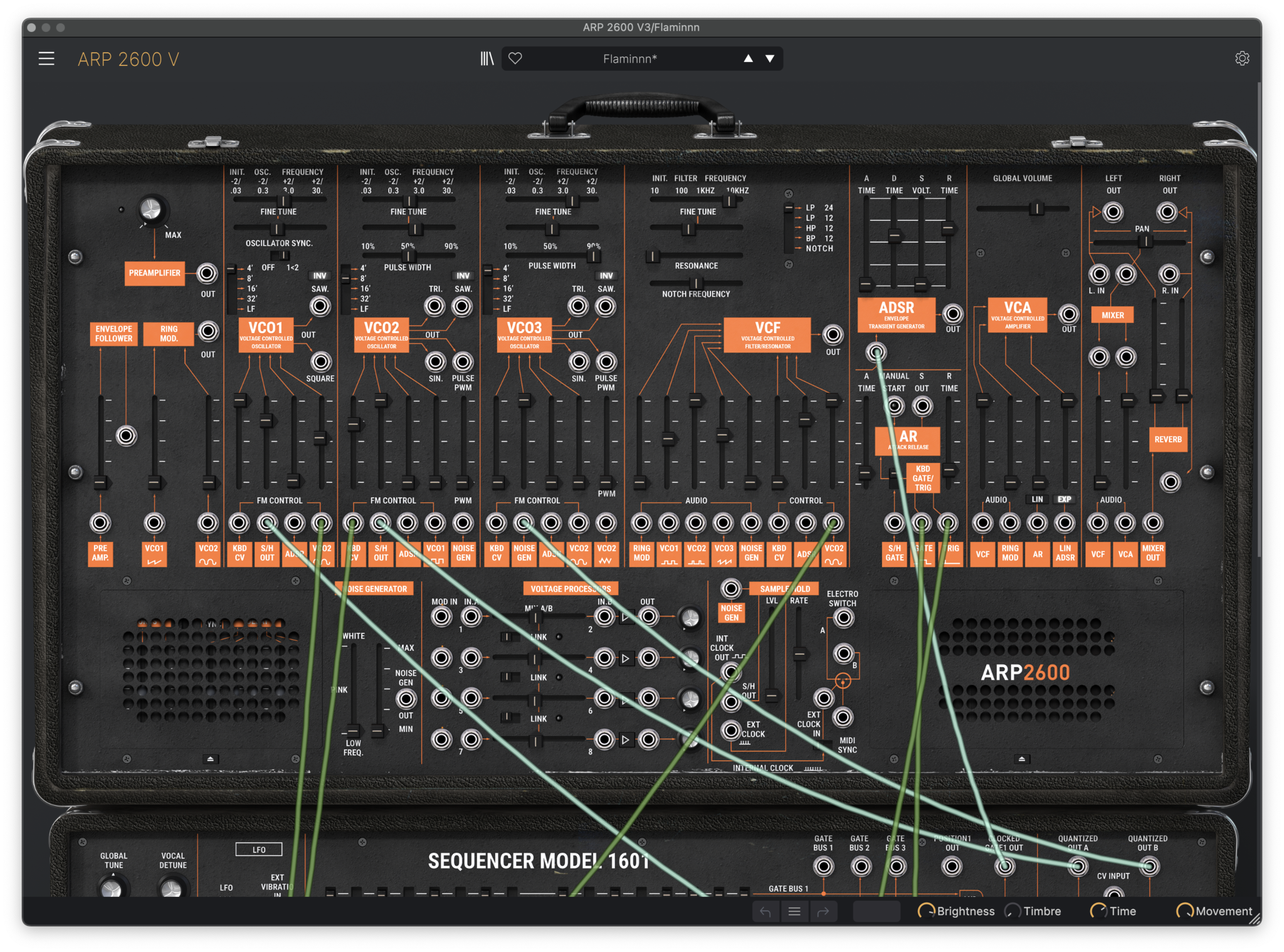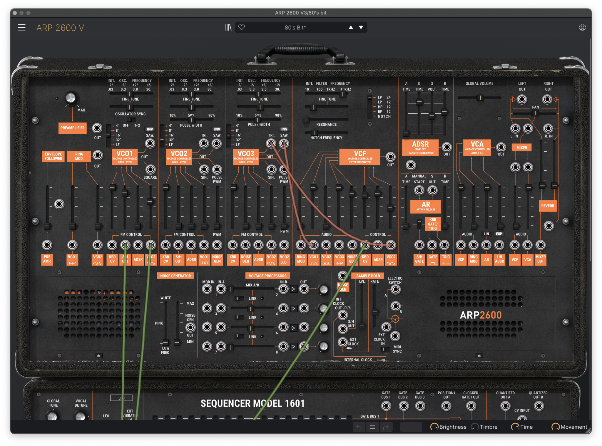 På dette stadiet av eksperimenteringen hadde jeg funnet fram til mange av groovene, idéene og lydene som endte opp i den ferdige låta. Selv om jeg syntes det fungerte godt med en 7-takters bass-sekvens, var jeg ikke helt fornøyd med sounden av det – det inspirerte meg ikke til å bygge videre på melodiske idéer. Jeg testet derfor ut nye ting jeg kunne trigge med kicktriggeren. En av tilbakemeldingene fra interpret var å bruke større kontraster. Jeg så derfor for meg at jeg kunne bytte på å trigge en hard basslyd og en softere pad eller synth. Etter å ha sett en video hvor Adam Betts viser hybridoppsettet sitt (med Ableton og mange av de samme MIDI-kontrollerne jeg bruker), fikk jeg lyst til å teste trigging av arpeggio med kicktriggeren. Jeg gikk vekk fra pad-idéen, men endte opp med en arpeggio (Flaminnn) og en slags saw-bass (80’s Bit), som begge er presets i Arturia sin Arp 2600 V plugin: