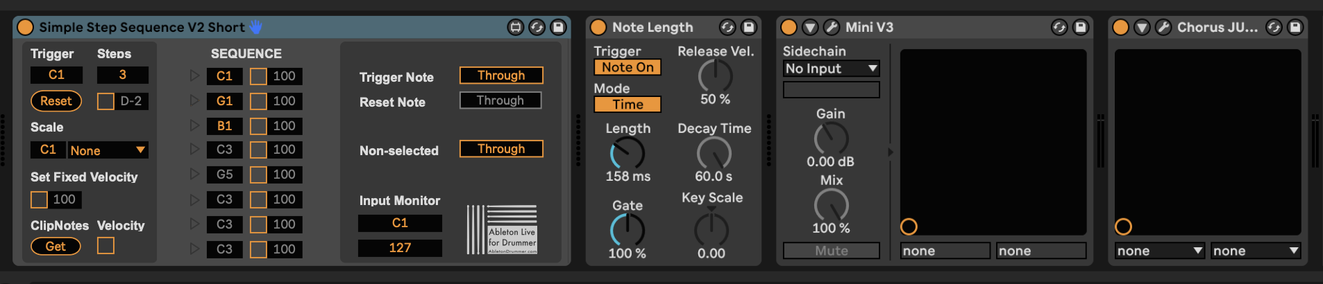 I denne forbindelsen tok jeg utgangspunkt i videoen til LANDR (2020). Her viser Andrew Marshall, trommeslageren til Billie Eilish, hvordan et 808-sample automeres til å endre tone ved hjelp av Abletons chainselector, slik at en basslinje spilles sammen med basstromma. Jeg ønsket ikke å automere en forhåndsbestemt basslinje som fulgte en grid (for eksempel at tonen endret seg hver takt). En helt tilfeldig basslinje utenfor min kontroll mens jeg spilte var heller ikke ønskelig. Det virket imidlertid interessant å kunne ha en forhåndsbestemt sekvens av basstoner, hvor tonen endret seg for hver gang jeg spilte min eksterne kick-trigger. Jeg hadde kjøpt en rekke plugins fra AbletonDrummer.com som jeg ønsket å teste, og endte opp med å bruke den som heter Simple Step Sequence V2 Short for å gjennomføre idéen med en sequenced bass-linje som trigges av kick-triggeren min: