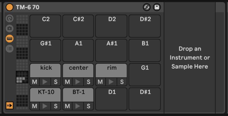TM-6 70 er et Drum Rack jeg har lagret så jeg enkelt kan huske hvilken MIDI-note som samsvarer med de ulike triggerne på triggermodulen TM-6. Jeg har også laget en preset (som heter 70) på TM-6-modulen.