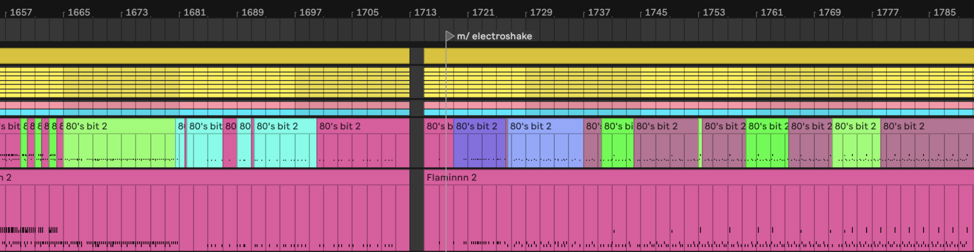 På dette tidspunktet var jeg ferdig med play time og improviseringen, som jeg hadde brukt til å generere musikalske idéer. Som diskutert i kapittel 2 kan man anse improvisasjon som komposisjon som oppstår i øyeblikket. Så langt i prosessen kan man si at jeg hadde komponert musikalske idéer ved hjelp av improvisasjon. Mitt neste steg ble å organisere disse idéene til en større musikalsk helhet. Formen og strukturen på låt 1 og 2 ble til ved å omorganisere det improvisert materialet ved å flytte på partier i forhold til hverandre, klippe vekk partier eller kopiere og gjenta partier. Dette gjorde jeg i arrangement view. Denne prosessen var delvis inspirert av Makaya McCravens bearbeiding av gamle live- og studioopptak: