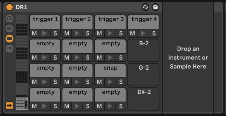 DR1 er lagt opp for å se ut som SPD-en, slik at det er enkelt å se hvilken pad man legger et sample på. Det er med på å effektivisere arbeidsflyten min. Jeg har ni pads jeg kan spille på, og to stereo trigger-outputs. MIDI-signalet fra Ableton samsvarer med MIDI-notene på en preset på SPD-en.