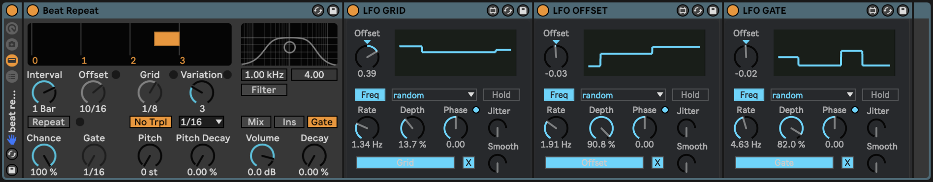 Man kan velge å la Beat Repeat sende tilbake forutsigbare rytmiske mønstre, men jeg ønsket å ha en tilfeldig output som kunne utløse nye idéer i trommespillet. For å gjøre dette brukte jeg LFO-er med en random waveform som styrte parameterne offset, grid og gate.